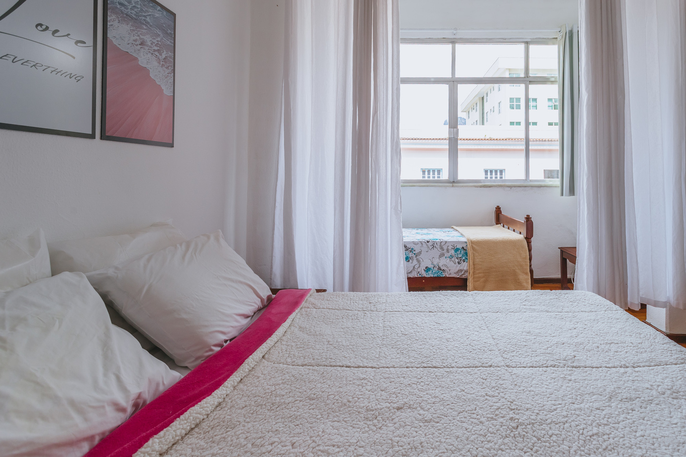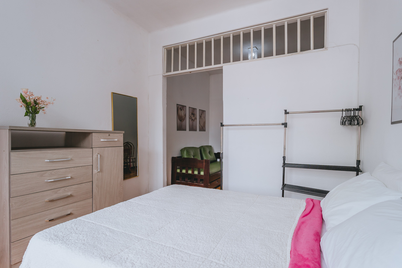 - En la habitación hay 1 cama de matrimonio, 1 cama individual, perchero con perchas y protector de colchón