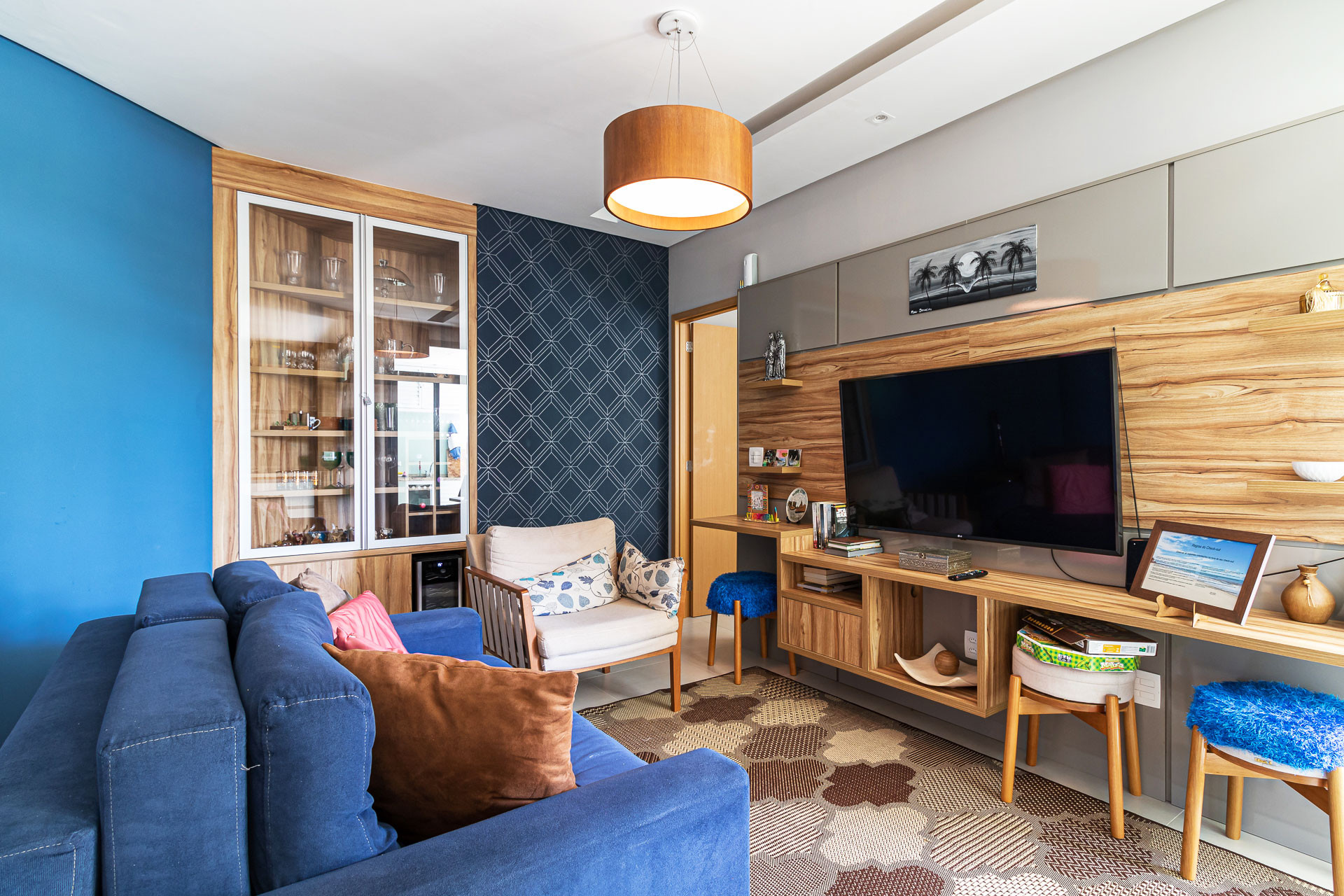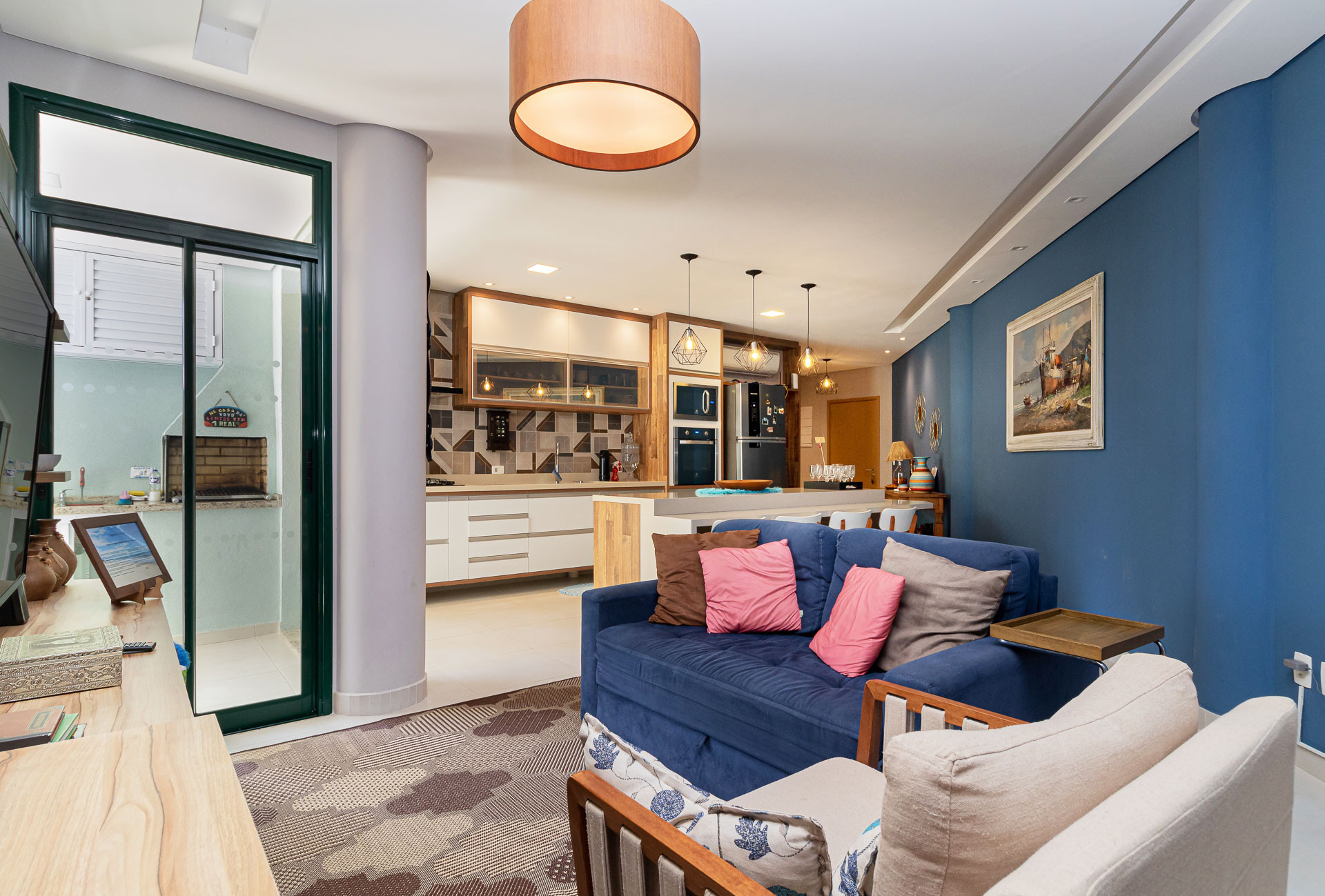 - Sala com mesa de centro, sofá-cama e poltrona