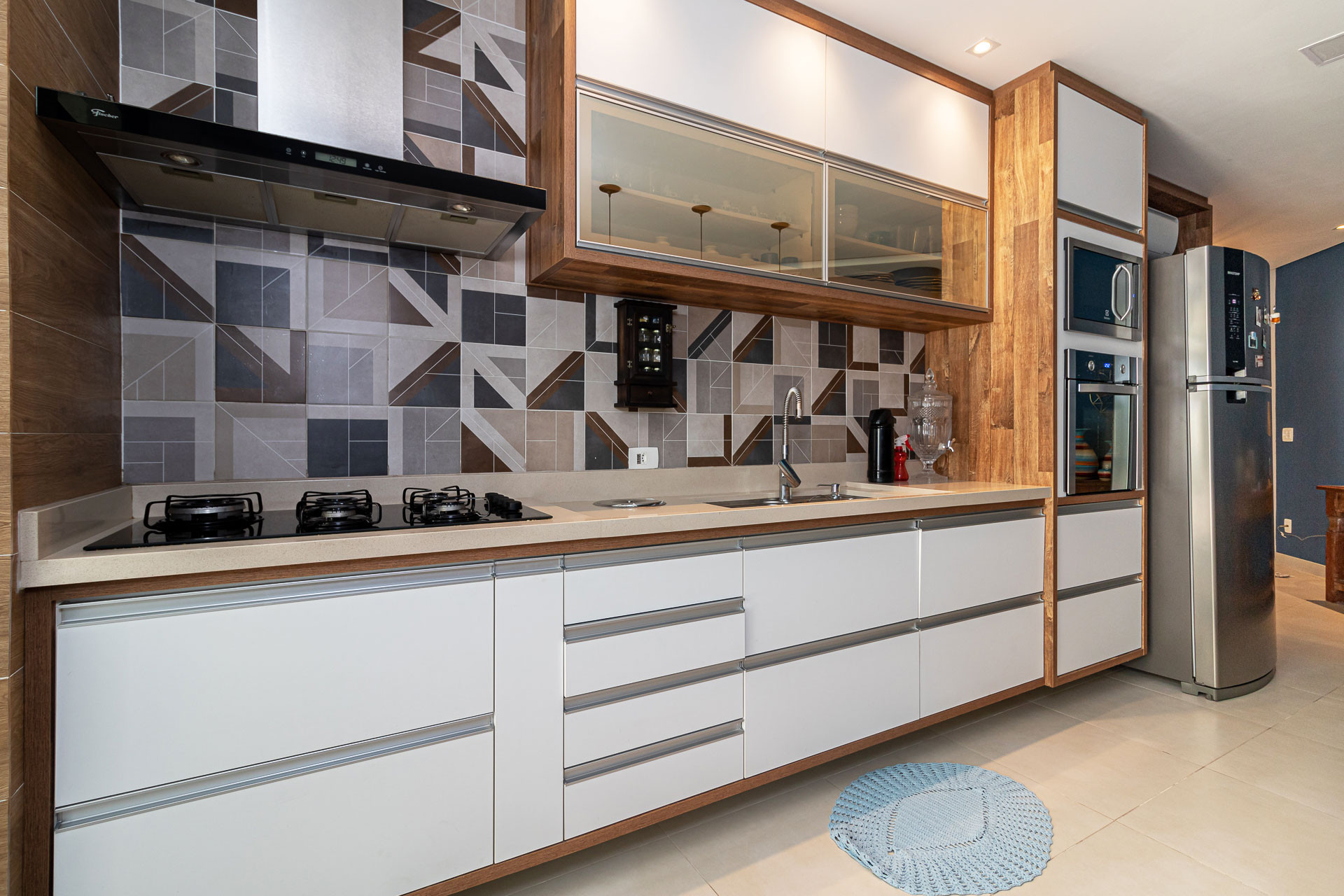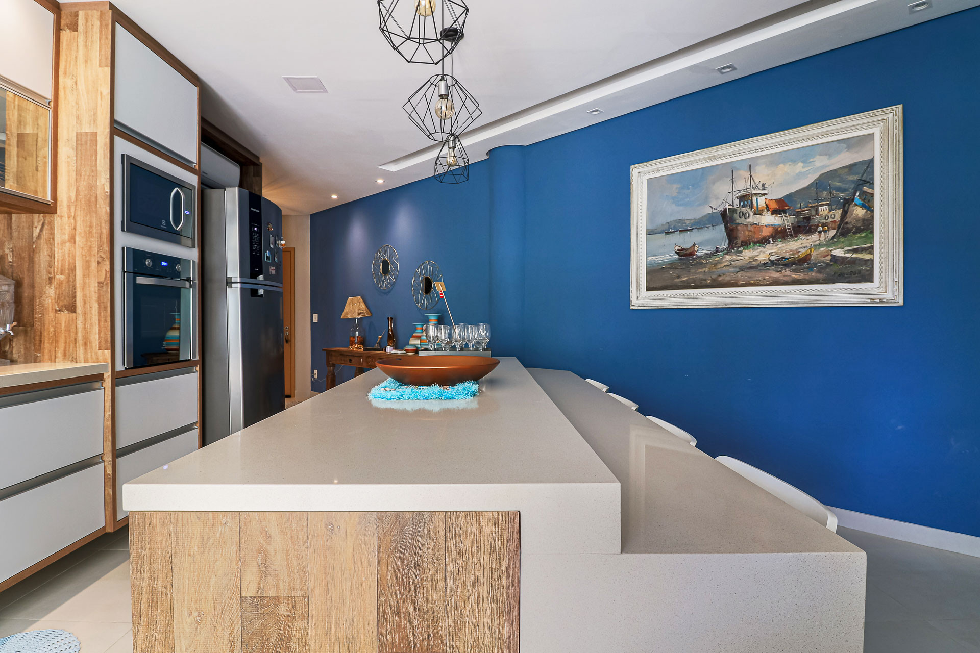 - Cozinha totalmente equipada para preparar suas refeições, incluindo exaustor, geladeira, fogão, forno, micro-ondas, liquidificador, sanduicheira, espremedor de fruta, bebedouro para colocar garrafão, desumidificador de ar, balcão com 4 cadeiras e todos os utensílios necessários