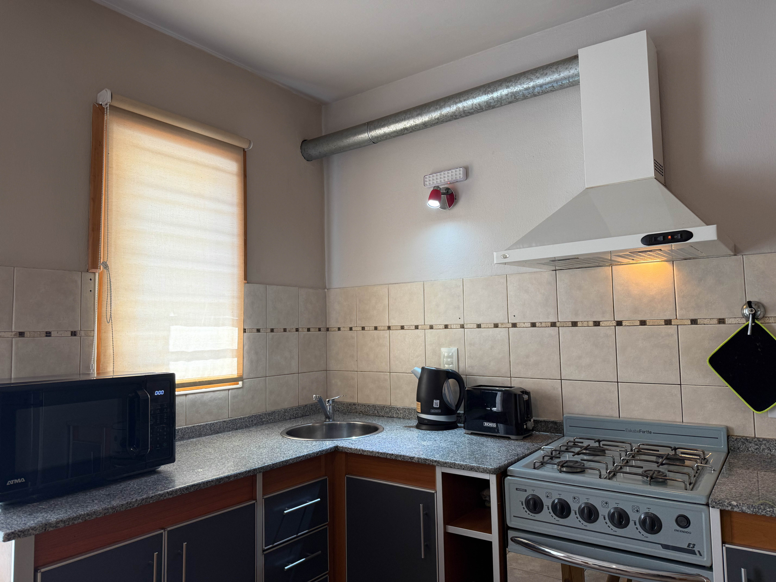 La cocina americana, de gas, está equipada con nevera, microondas, horno, congelador, vajilla/cubertería, utensilios/cocina, cafetera, tostadora, hervidor de agua y exprimidor.