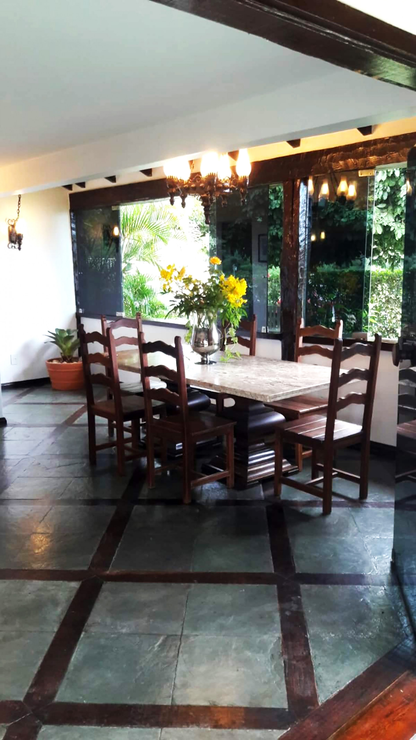 - Mesa de jantar e balcão com banquetas altas