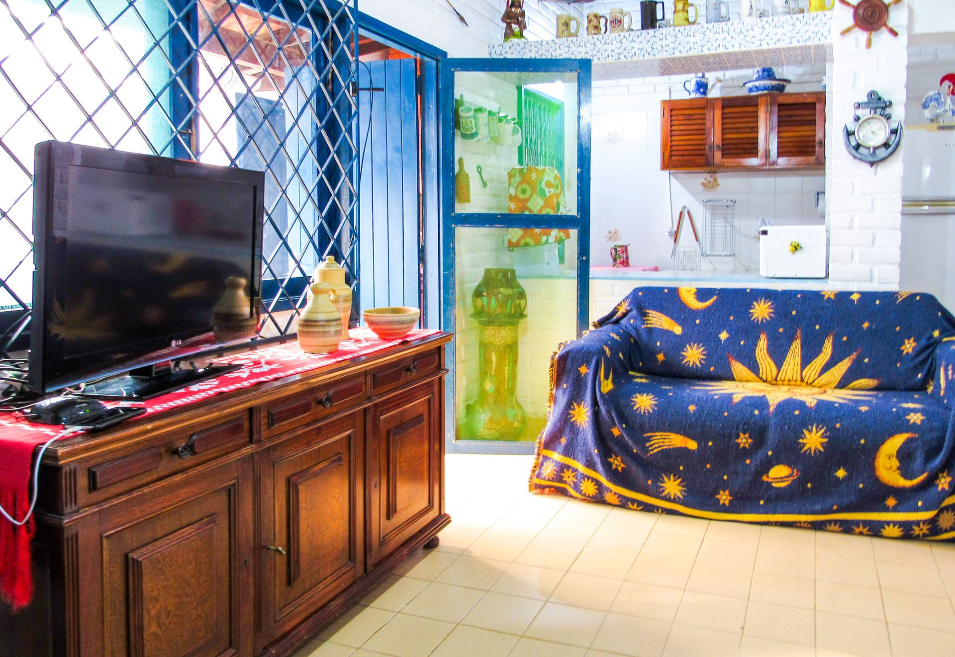 - A sala está equipada com cadeira, mesa de centro, poltrona, sofá, TV e ventilador de teto