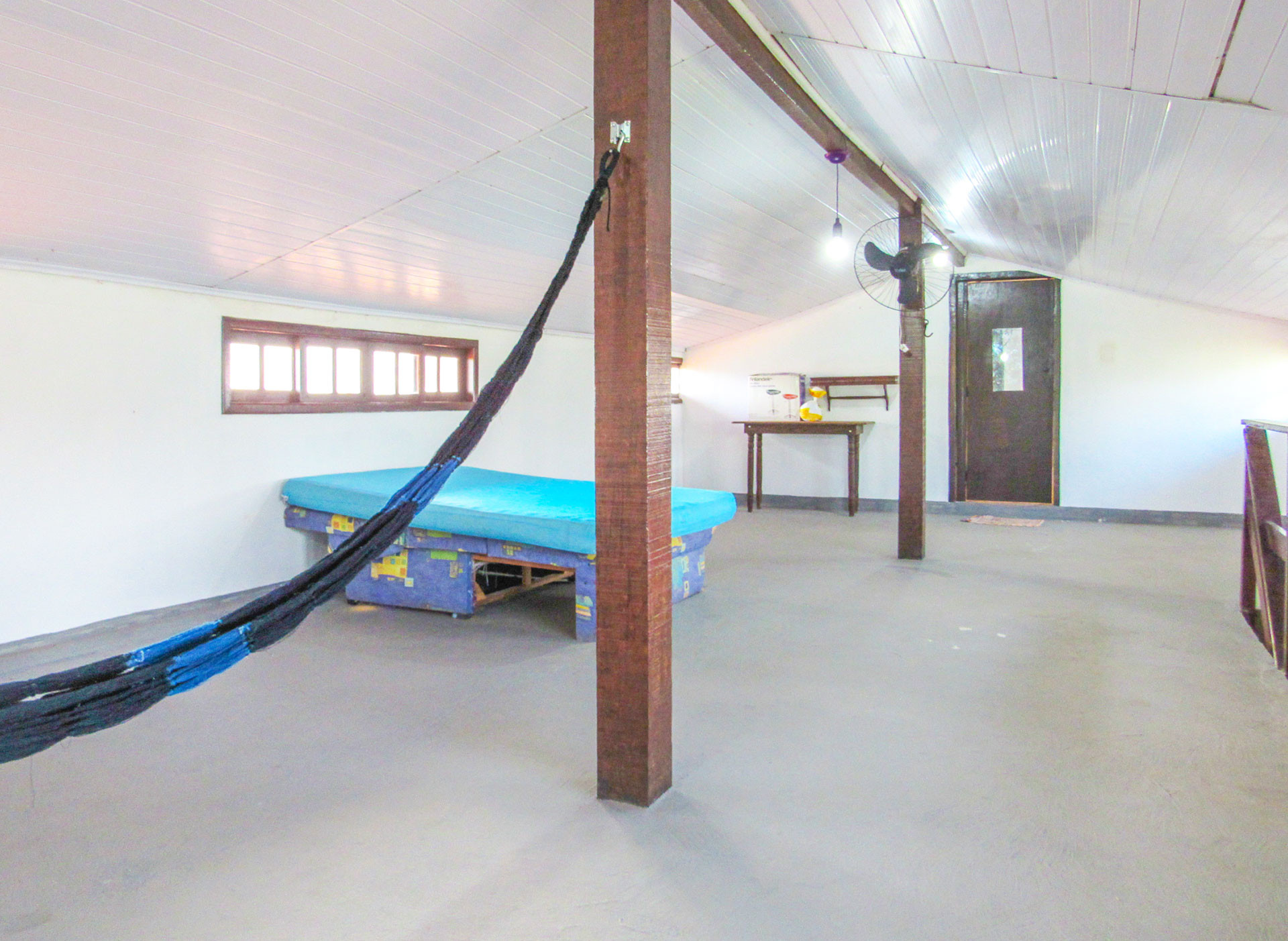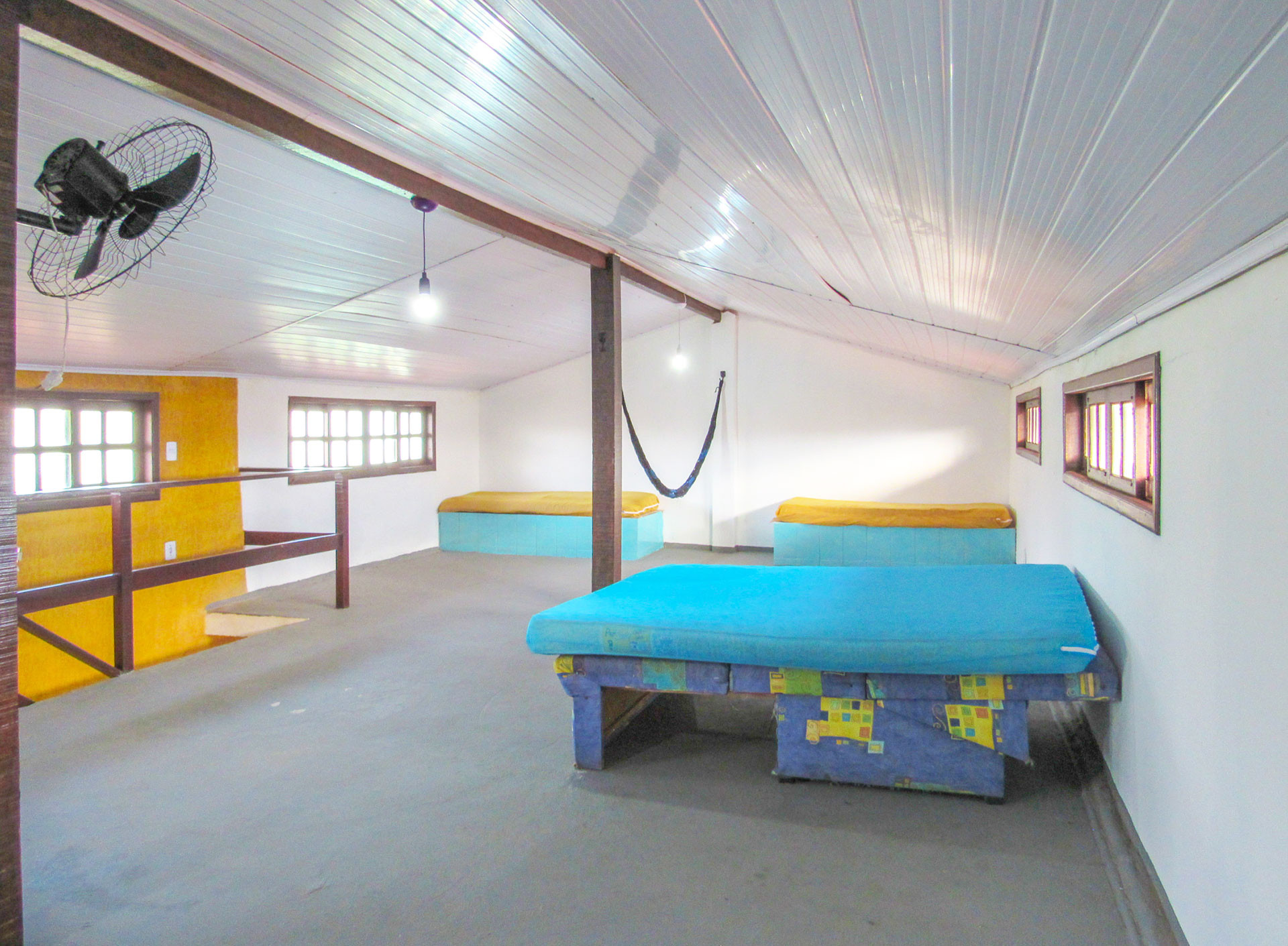 - Na suíte 2 há 1 sofá-cama, 2 camas de solteiro, 2 colchões extra de casal, janelas de frente para o mar, ventilador de parede, console, mesa, chuveiro frio e cortina
