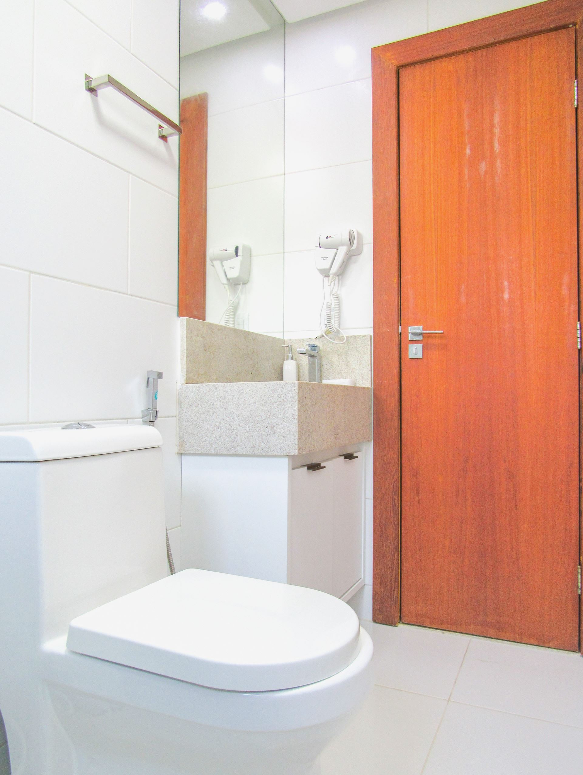 - Os banheiros têm chuveiro a gás e box de vidro/acrílico