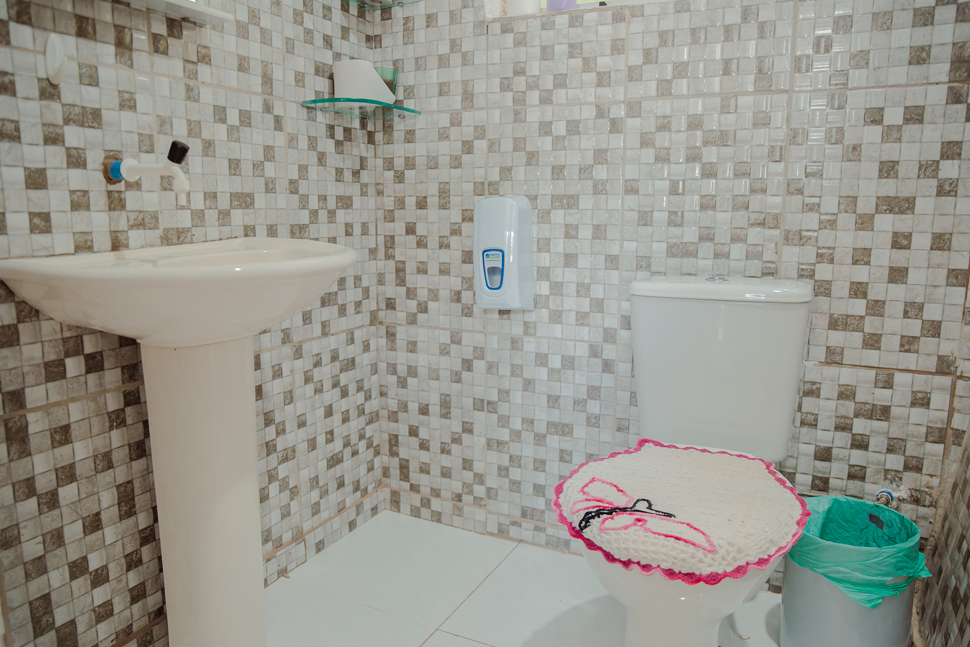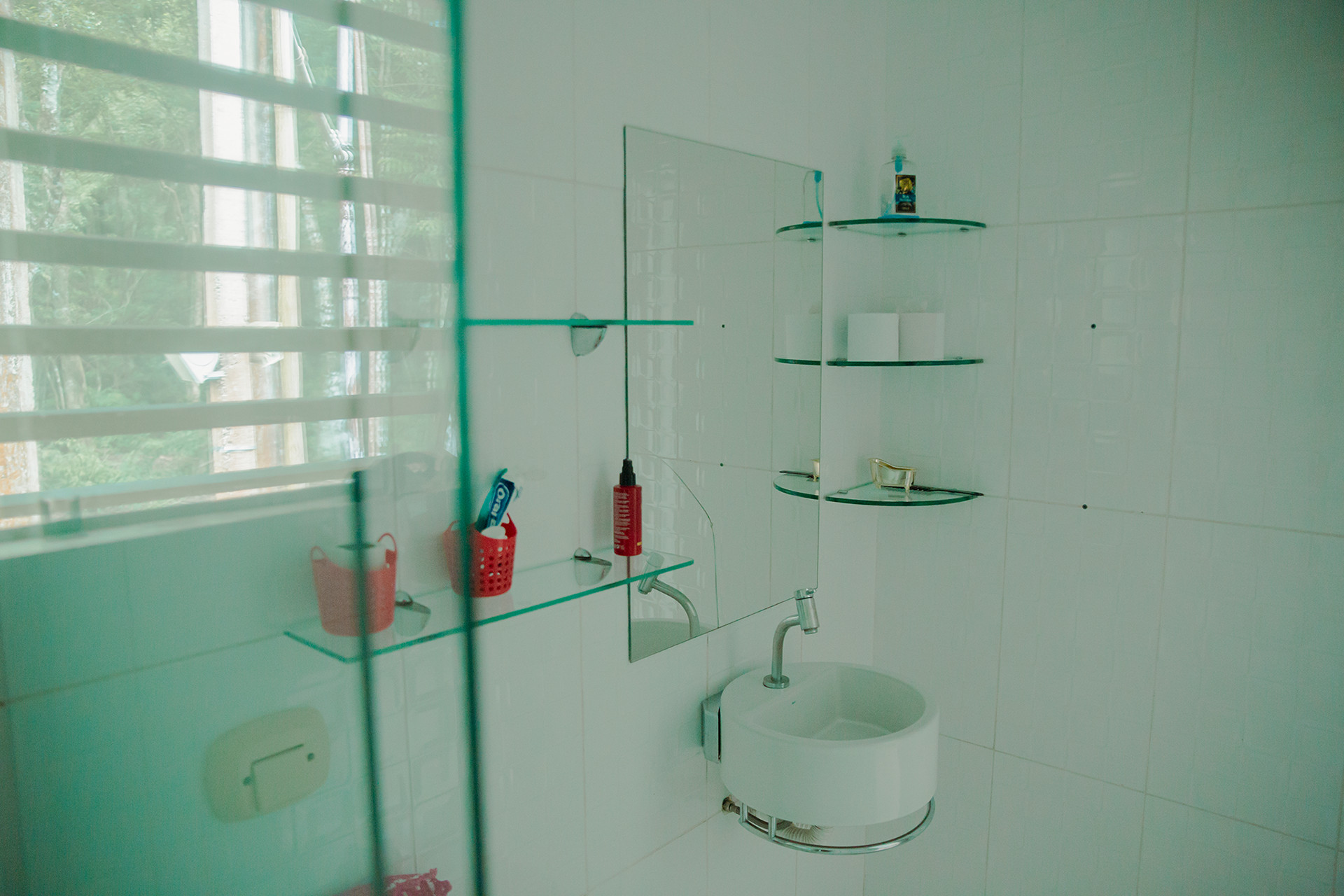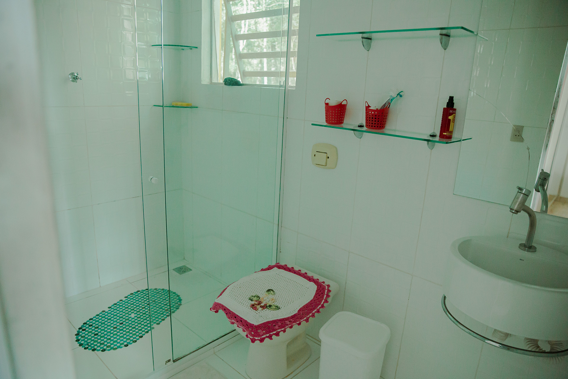 - Os banheiros possuem chuveiro elétrico e box de vidro/acrílico