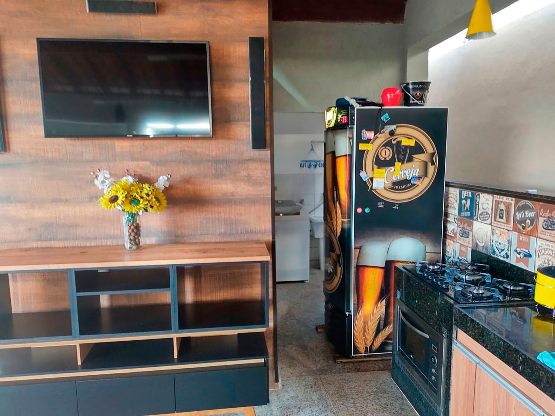 - Cozinha equipada com fritadeira, fogão, forno, geladeira, liquidificador, micro-ondas, torradeira e todos os utensílios necessários para suas refeições