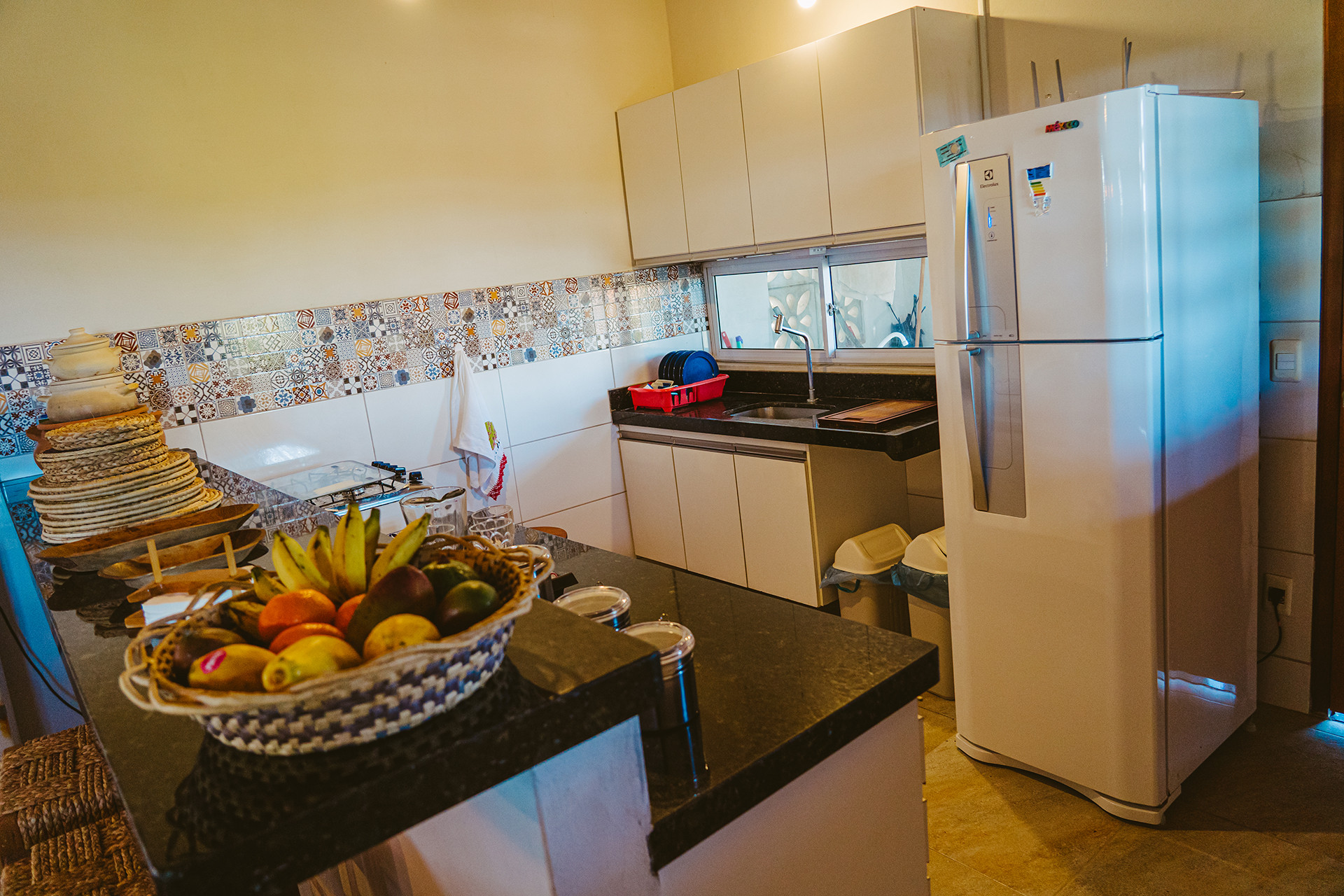 - A cozinha americana possui diversos utensílios para preparar refeições, incluindo cafeteira, fogão, forno, geladeira, liquidificador, torradeira e purificador/filtro