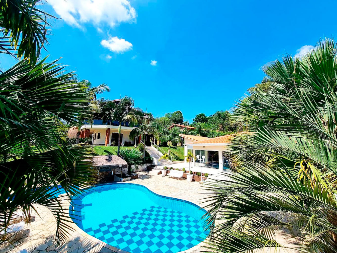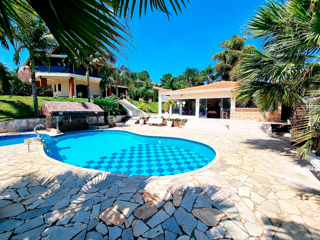 - Cabana externa com sofás aconchegantes e vista privilegiada para a piscina