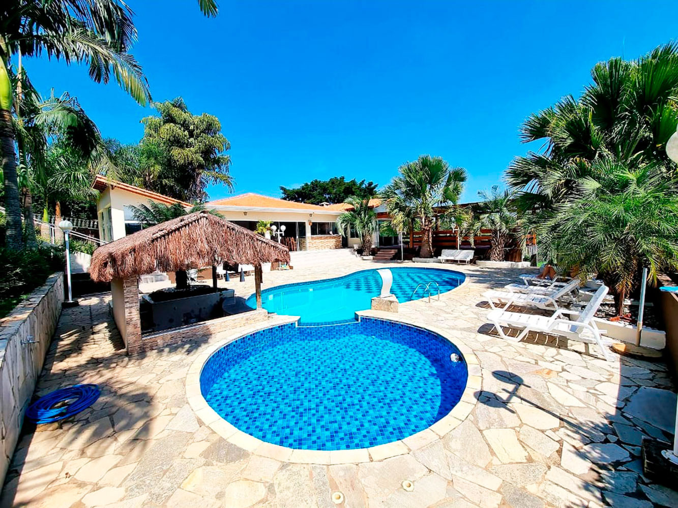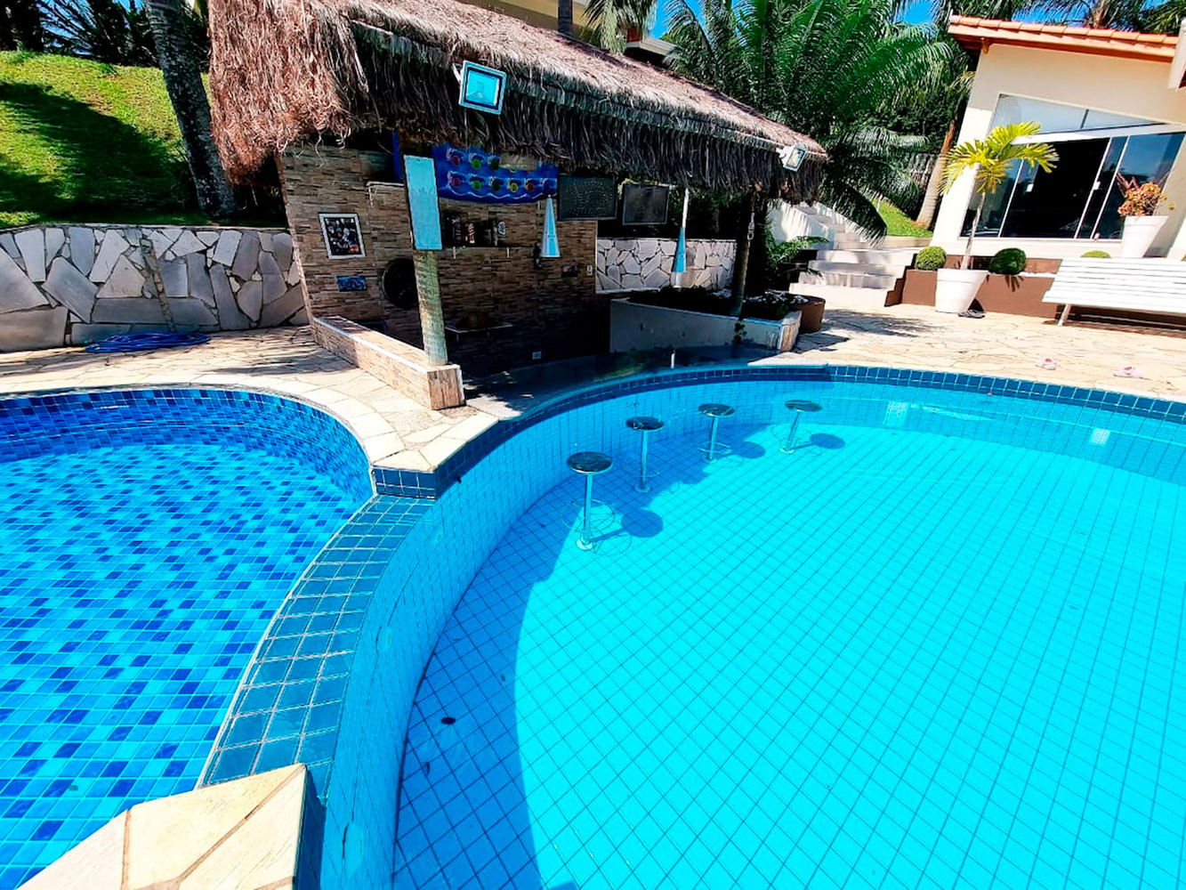 - Piscina adulto e infantil com espreguiçadeiras e banquinhos na água