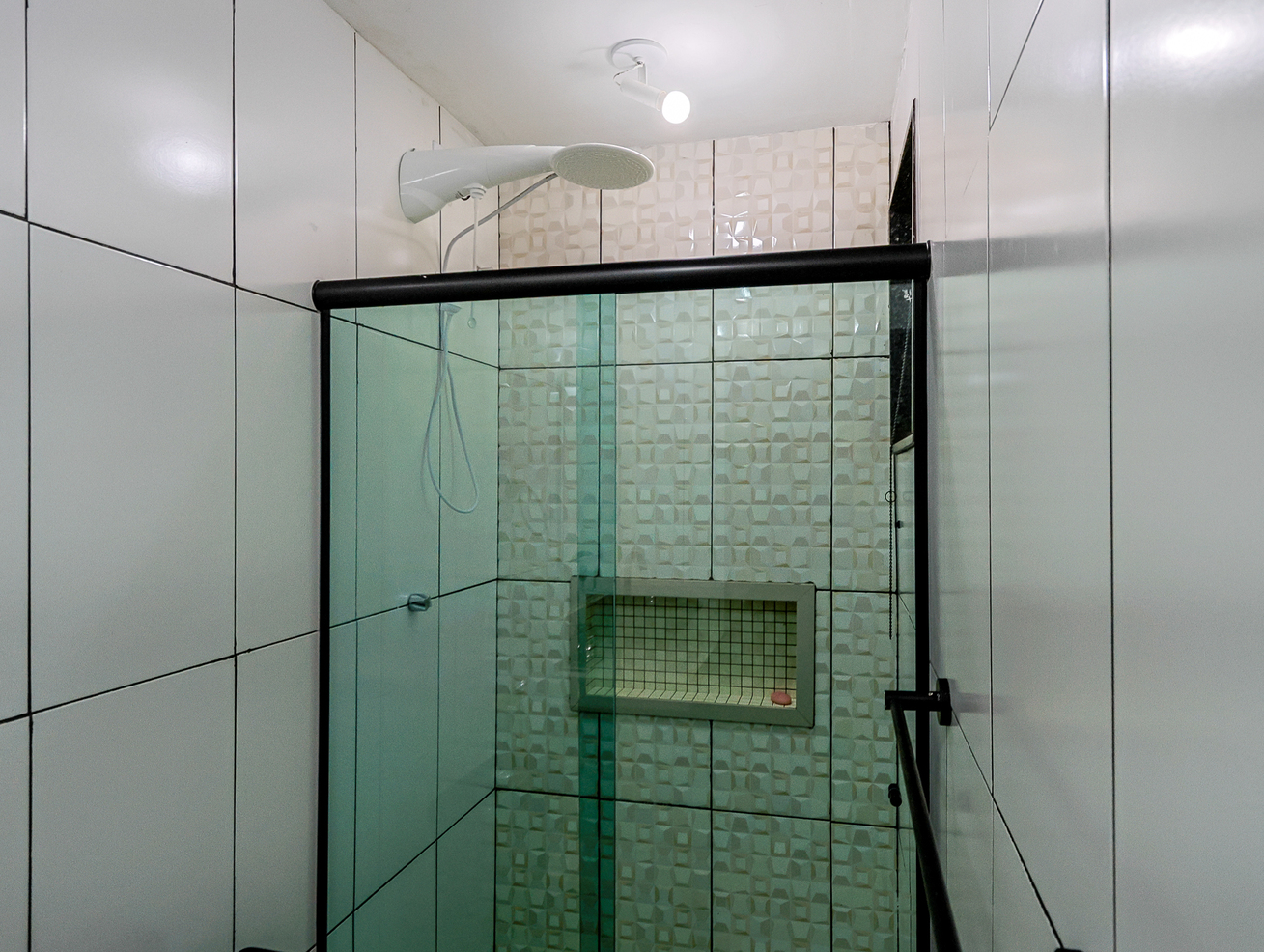 Acceso a baño social con ducha eléctrica y cabina de vidrio