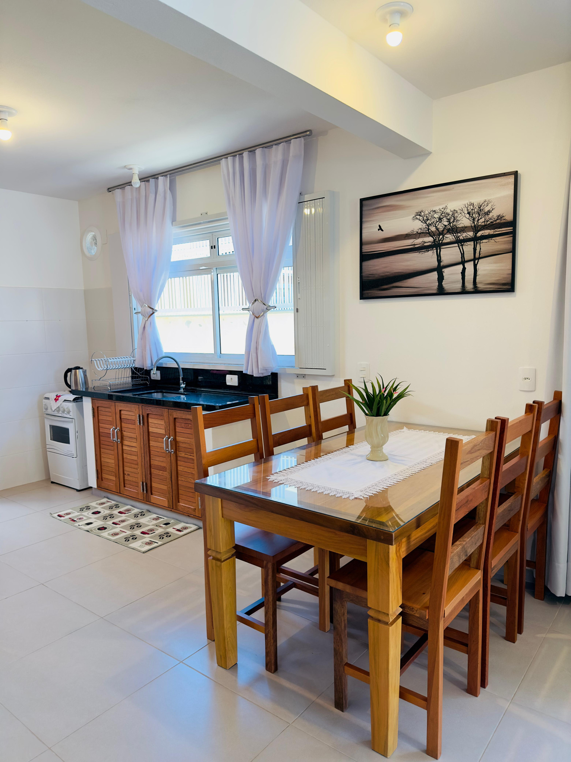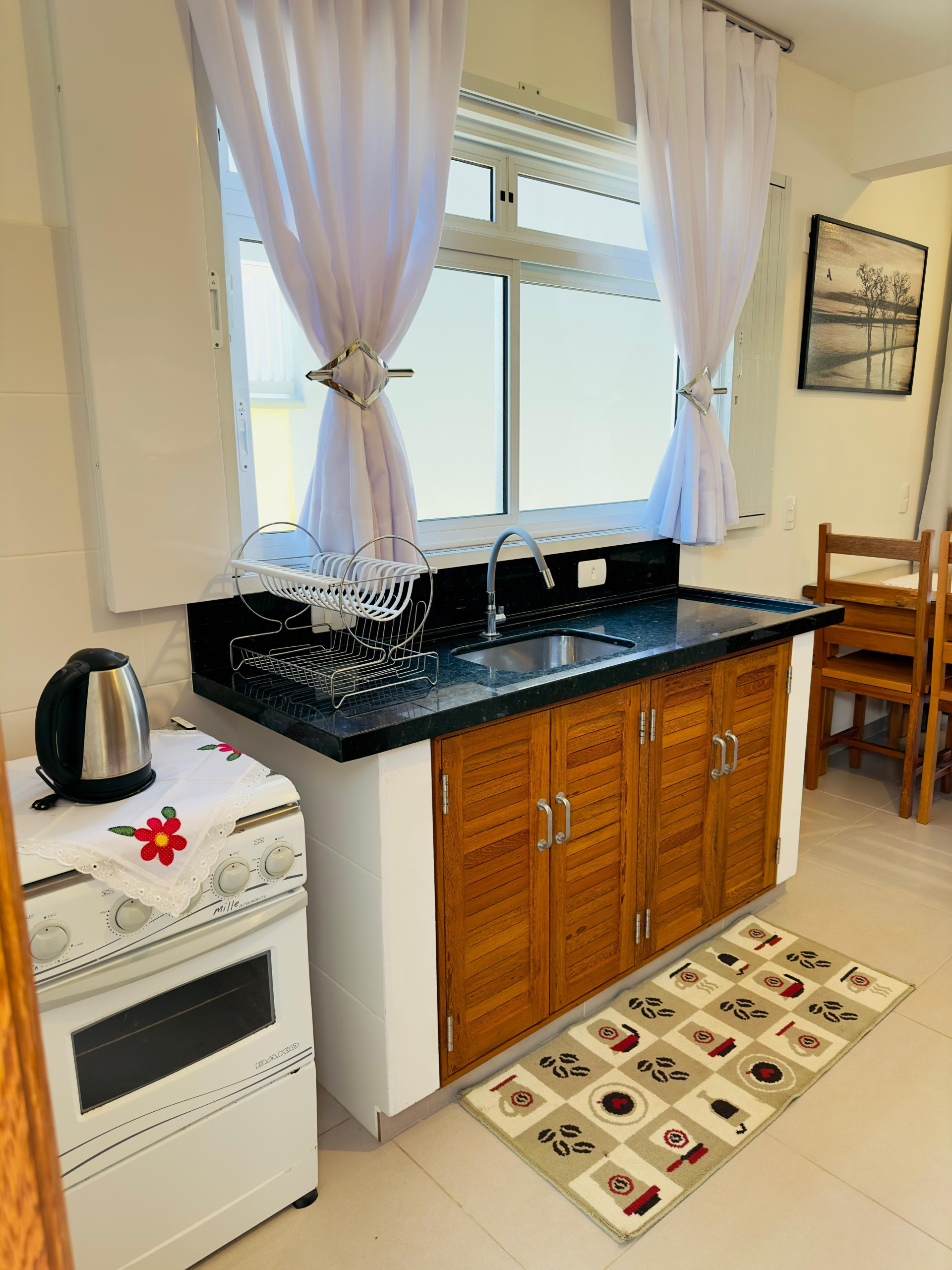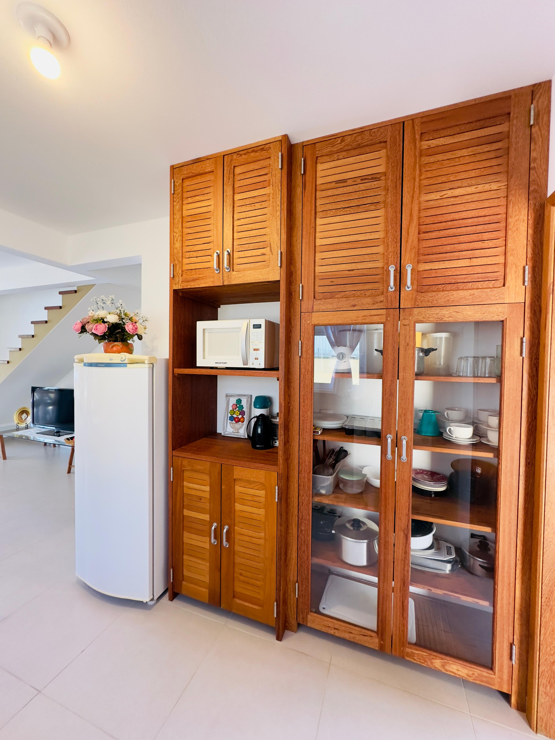 - A cozinha é compacta, mas tem os principais itens para que você possa preparar refeições, incluindo fogão com forno, geladeira, liquidificador e micro-ondas