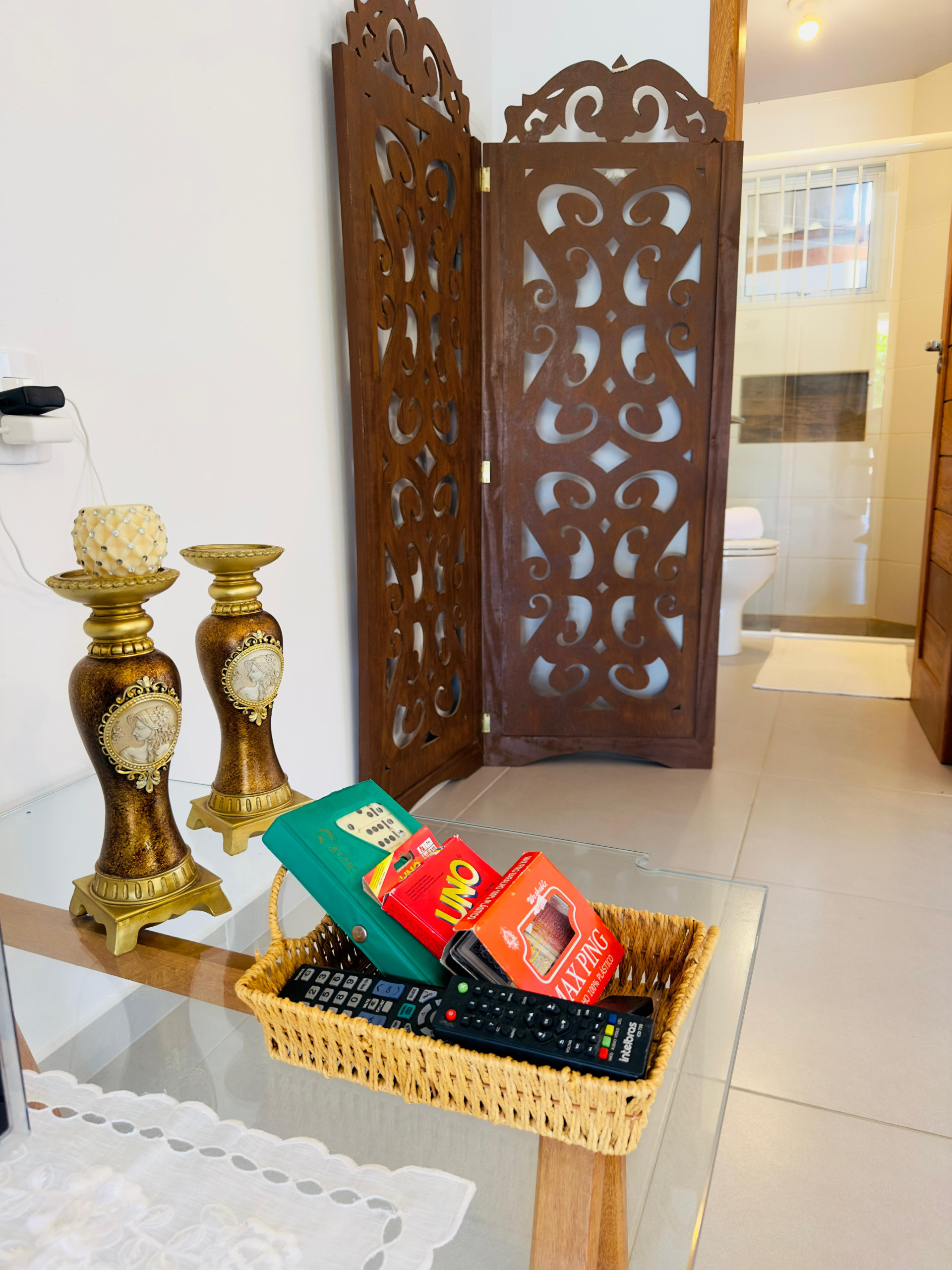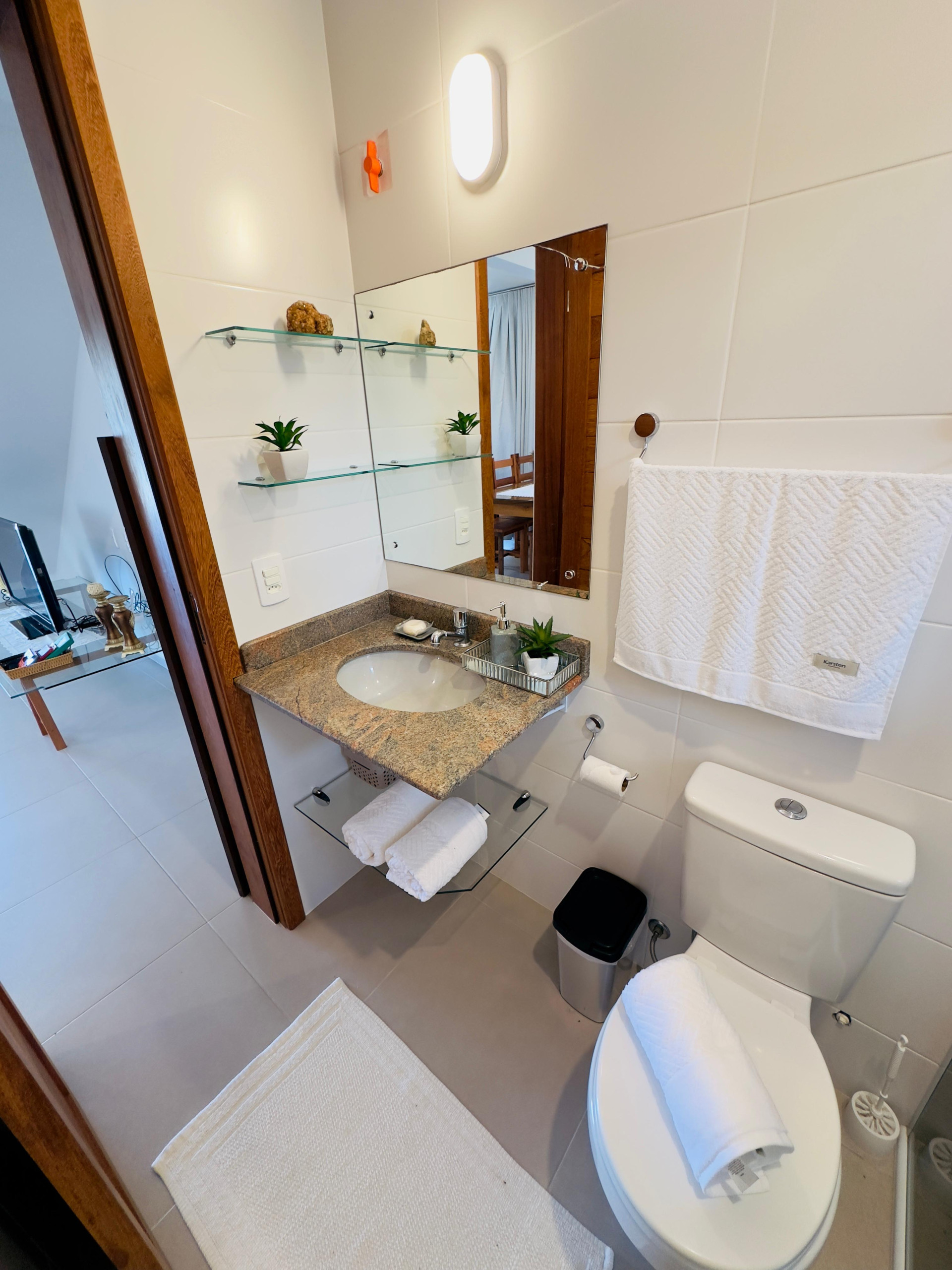 - Os banheiros têm chuveiro elétrico, box de vidro e espelho
