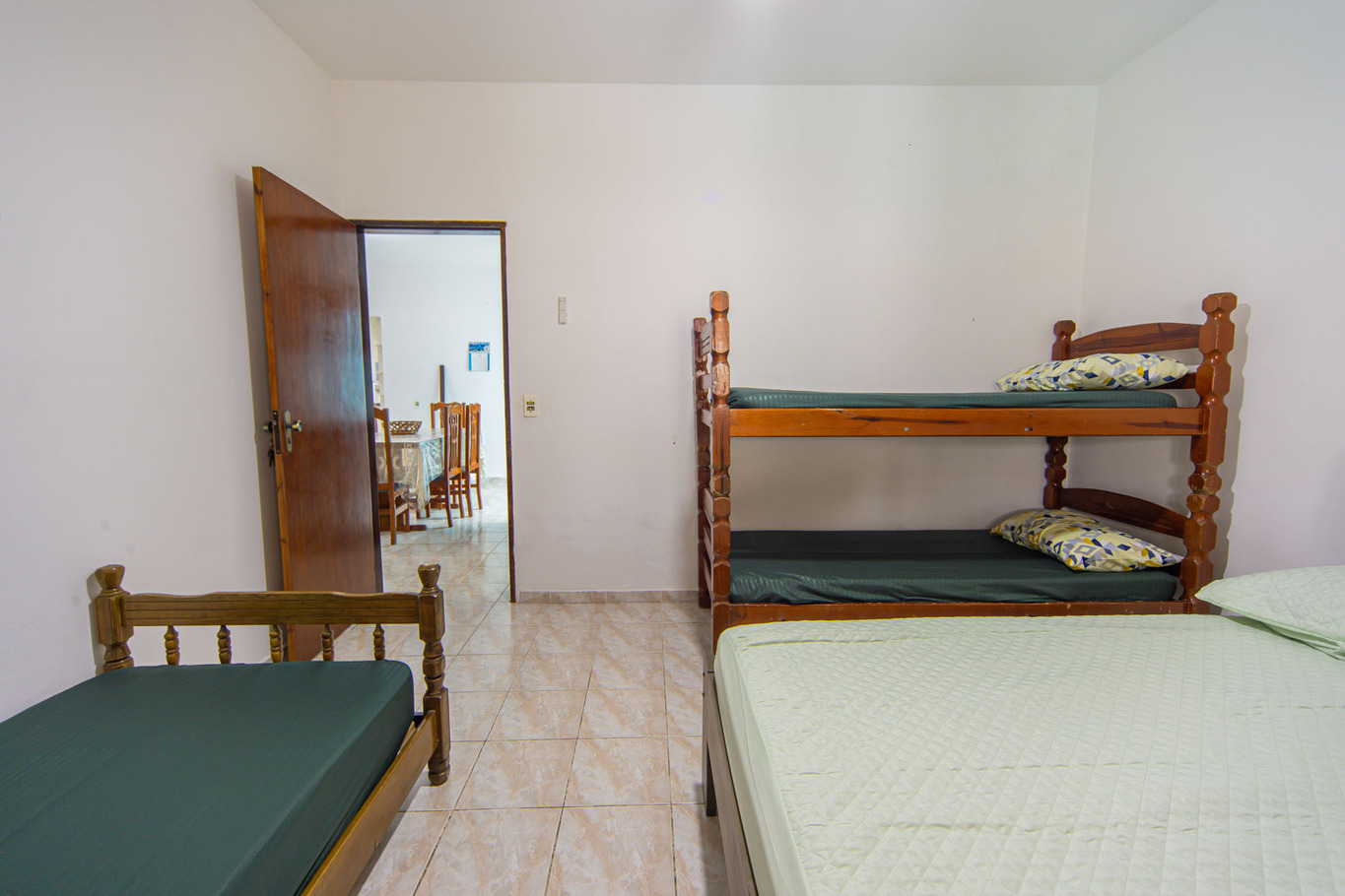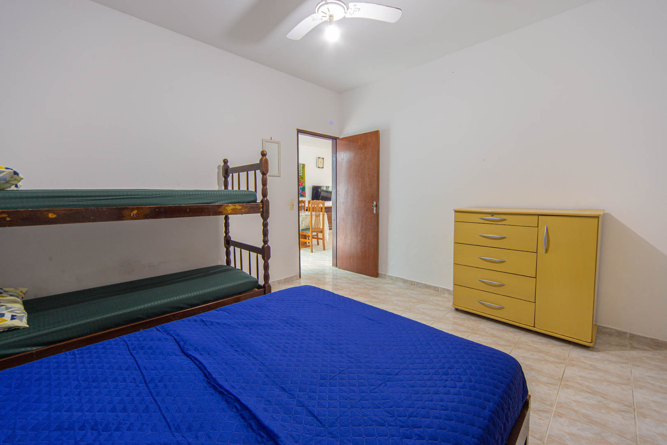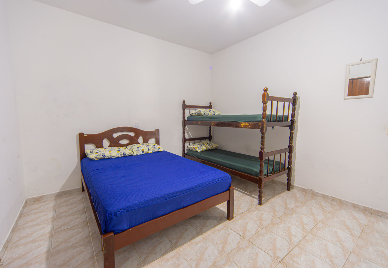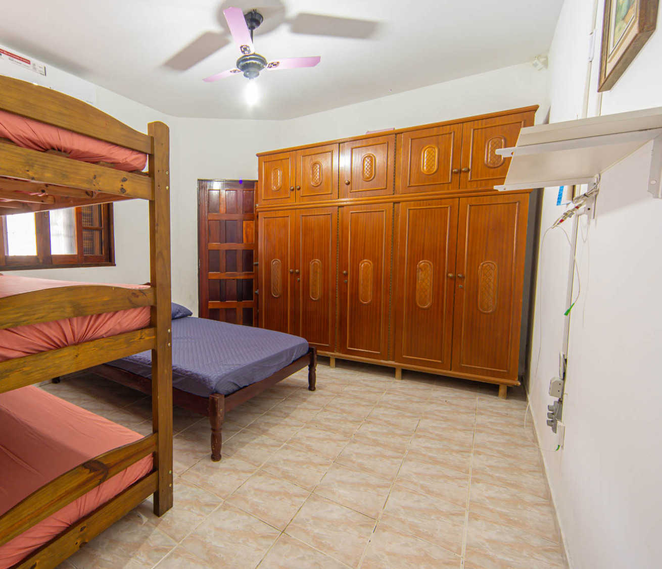 - Habitación 3: acomoda 4 personas con cama de matrimonio y litera, armario y ventilador de techo
