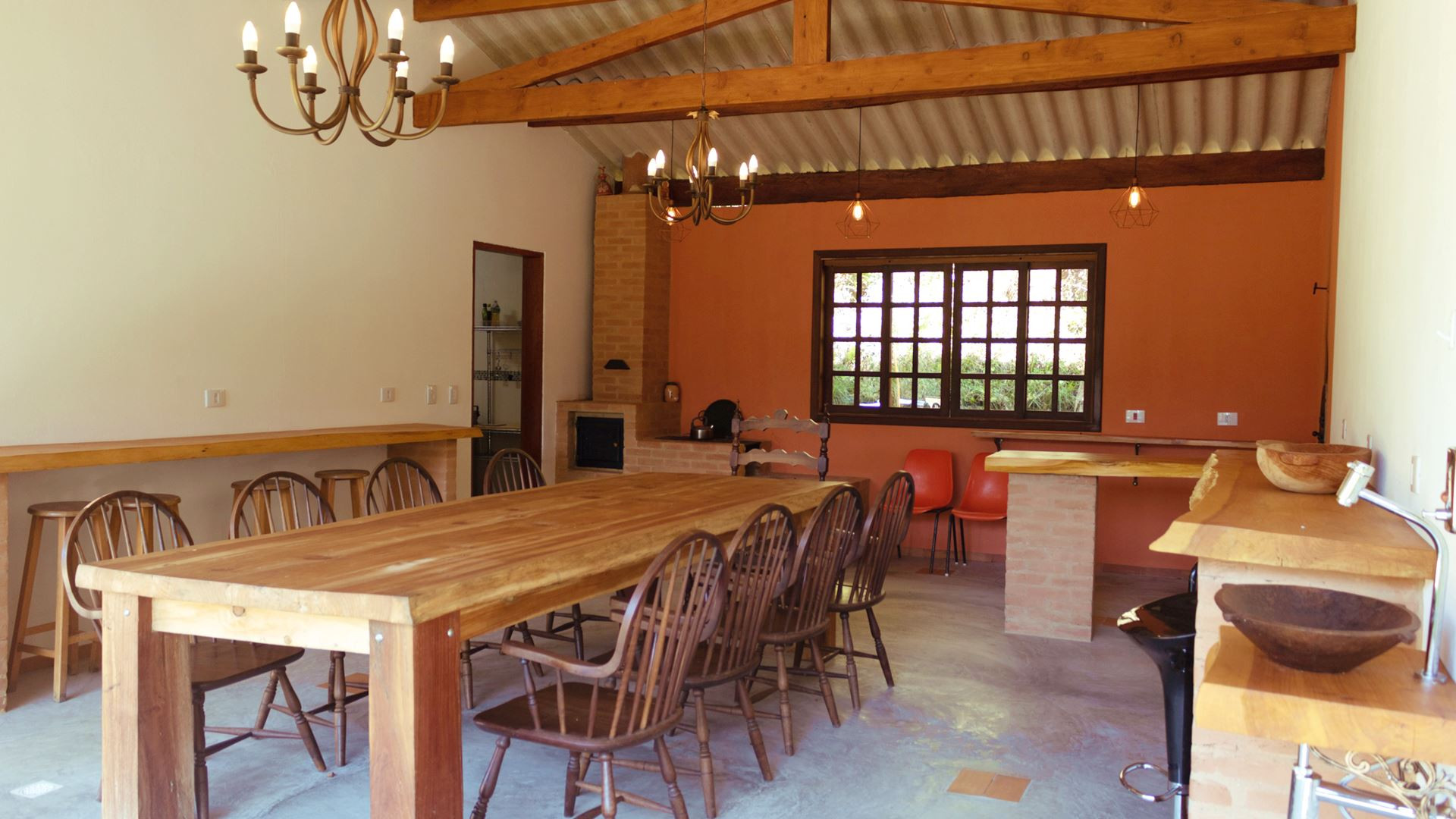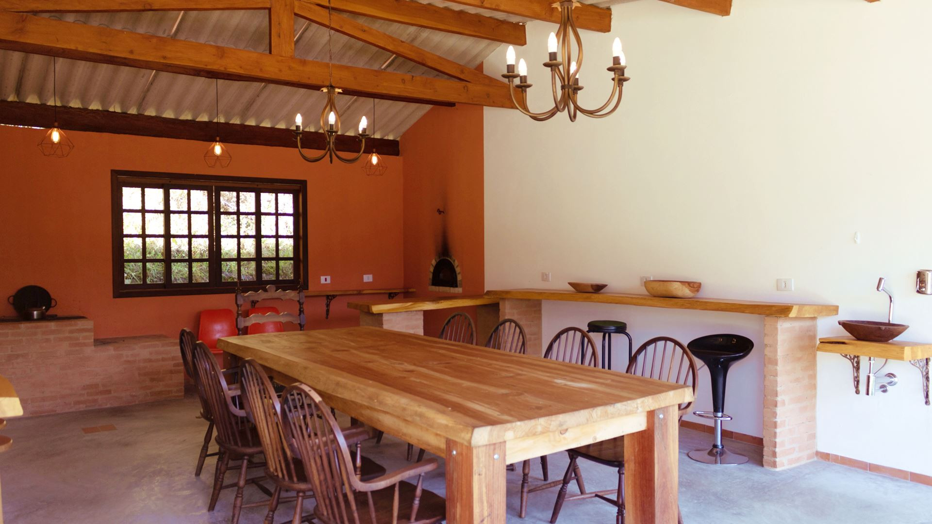 - Área gourmet ampla com fogão e forno a lenha, grande mesa de jantar e balcão com banquetas
