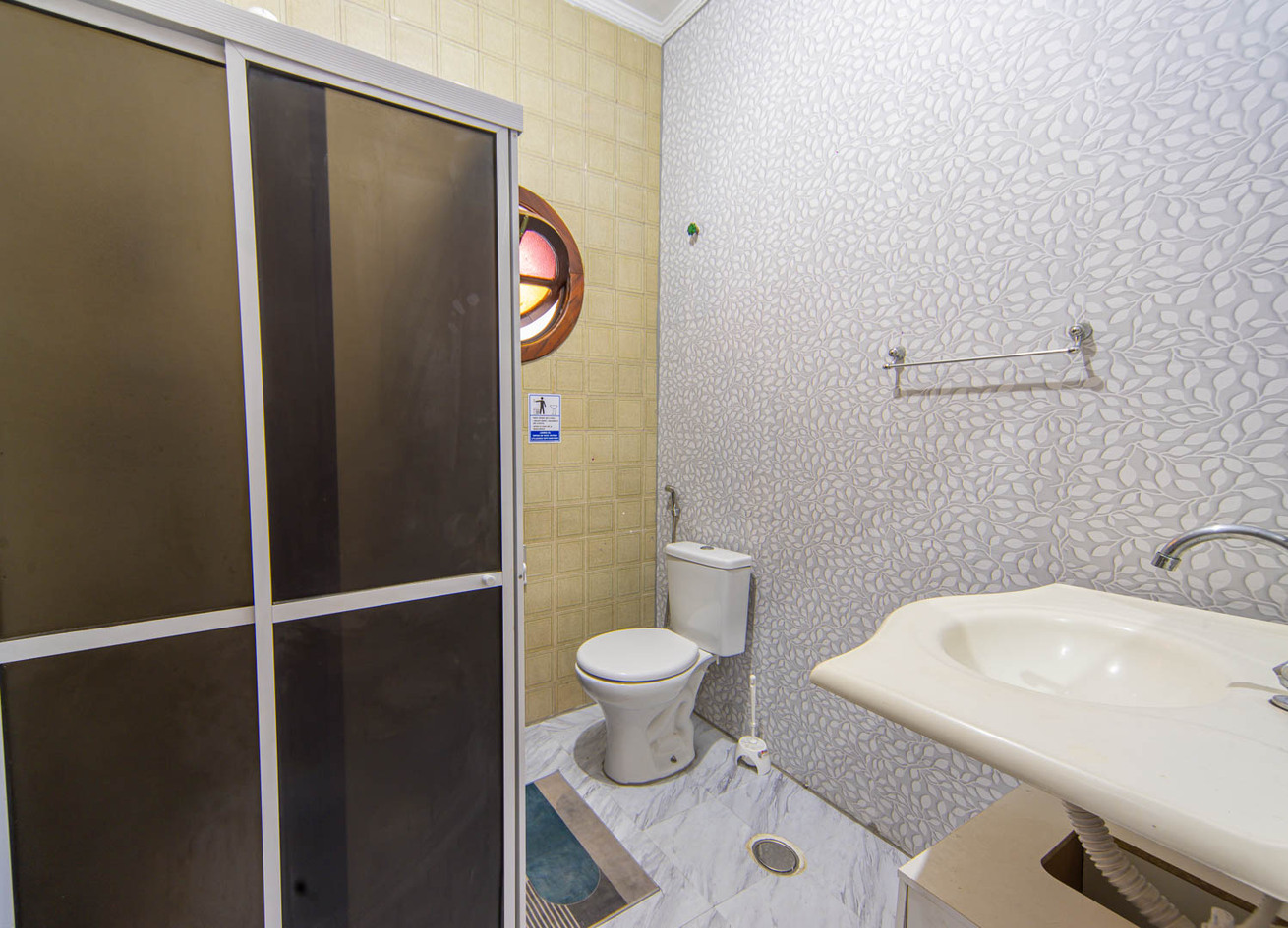 - Baño social con ducha eléctrica y box de vidrio/acrílico
