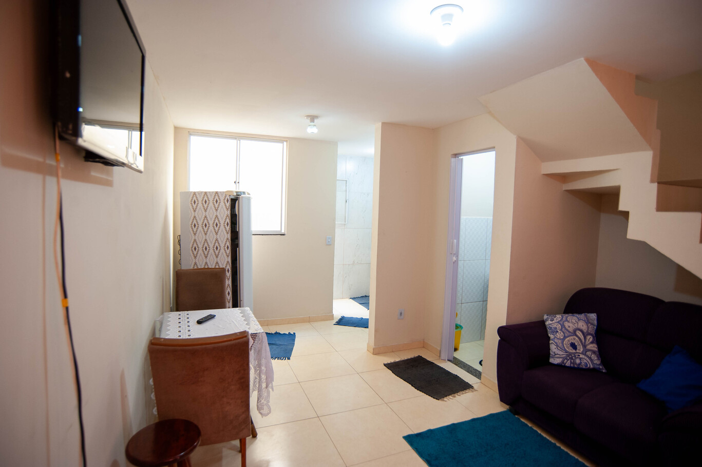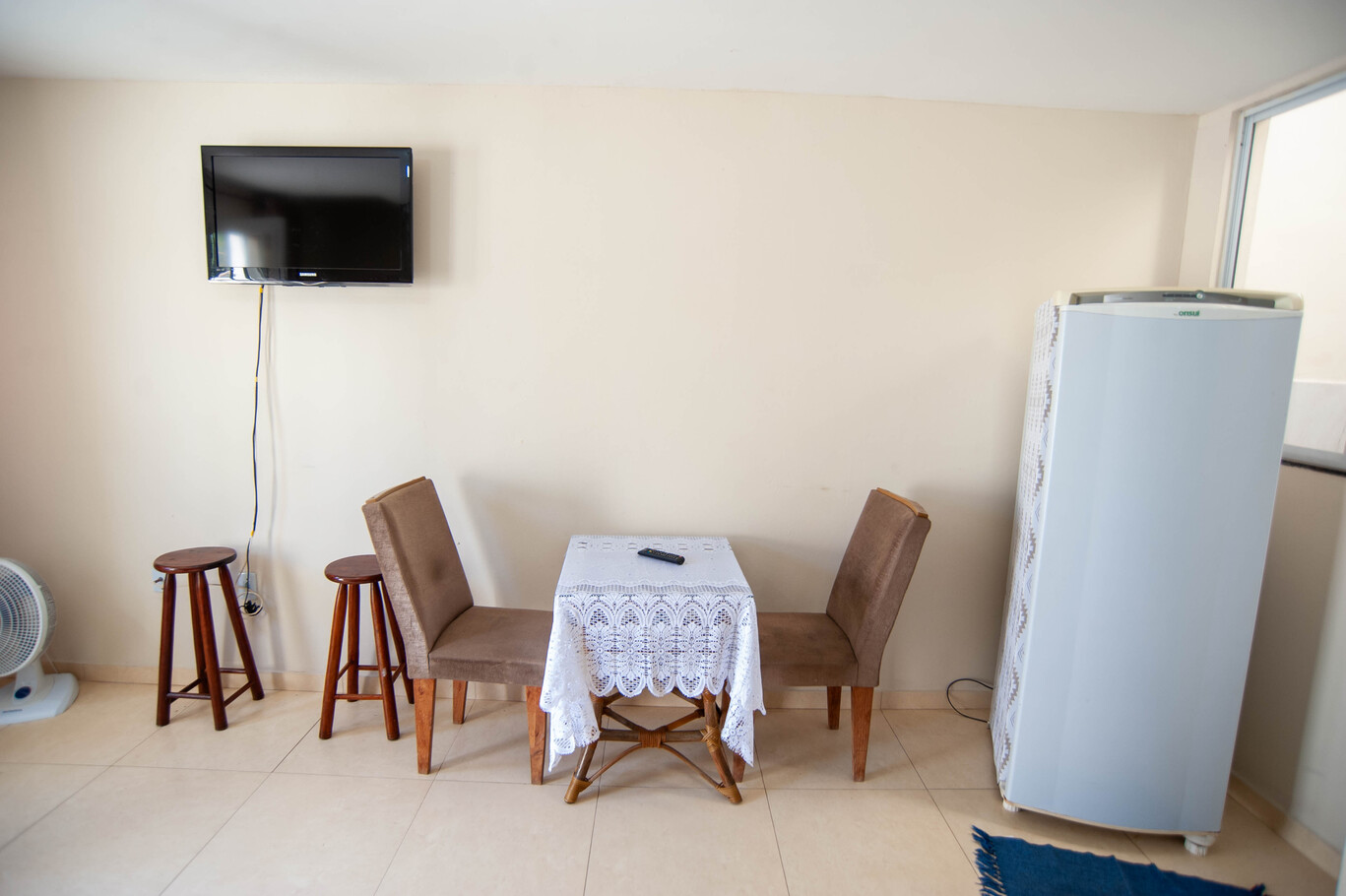 - Sala con sofá, smart TV, ventilador y mesa con 2 sillas