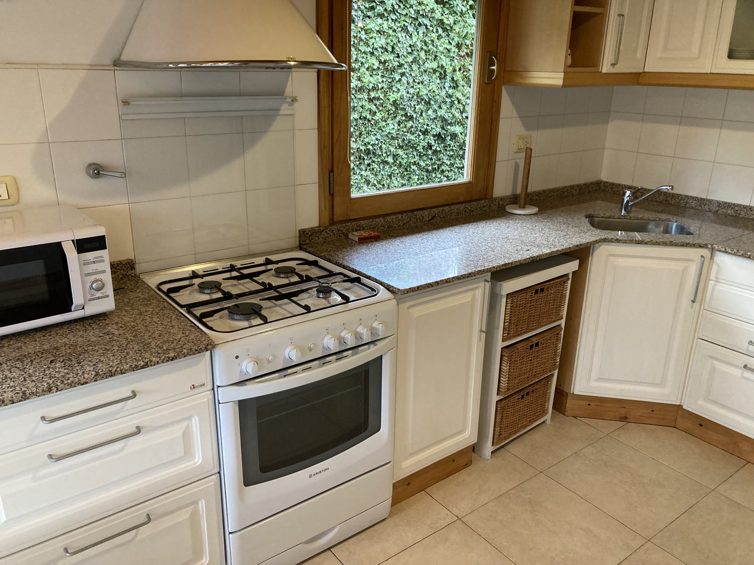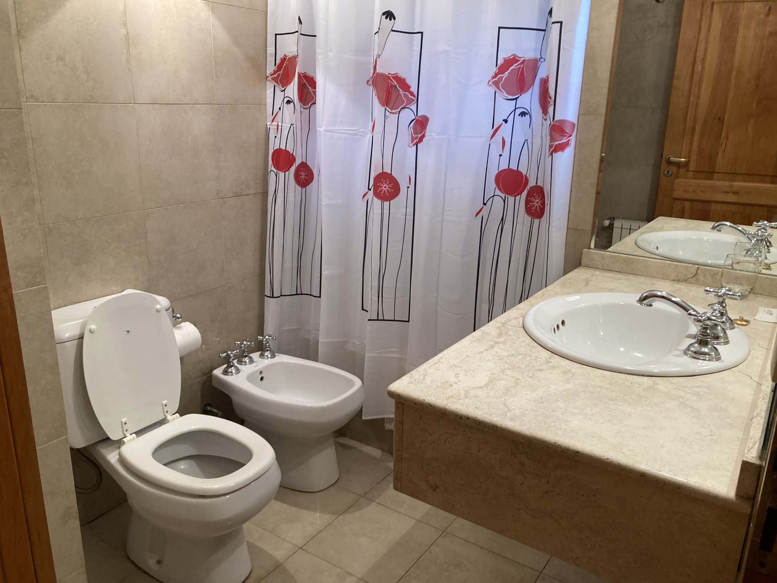 El baño principal incluye una bañera, y hay dos espacios adicionales de aseo, uno con bañera y otro con inodoro, lo que facilita la convivencia y la privacidad de los ocupantes. La cocina americana está totalmente equipada con electrodomésticos modernos como refrigerador, congelador, horno, microondas, cafetera, tostadora, hervidor eléctrico y una completa dotación de utensilios de cocina.