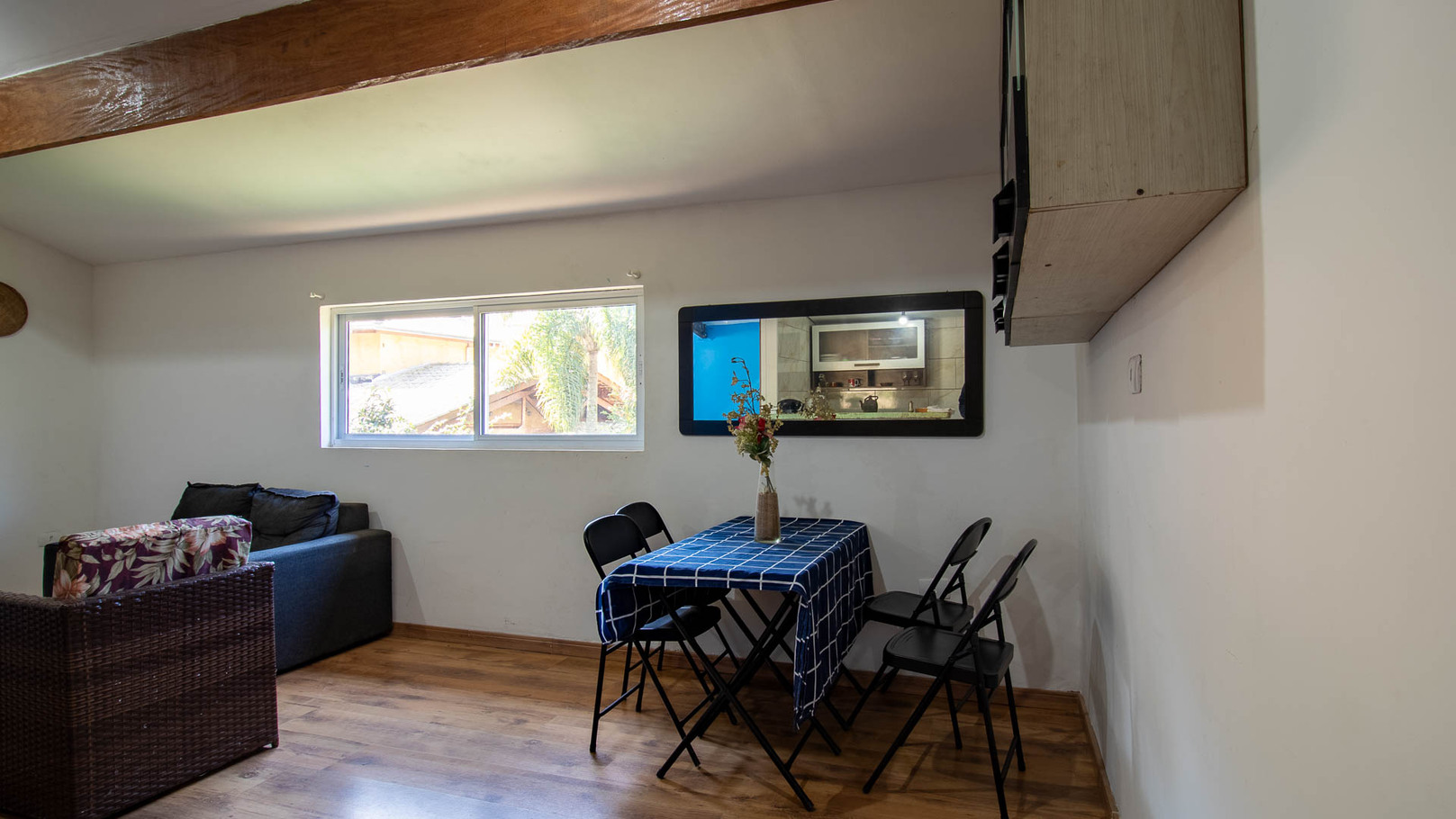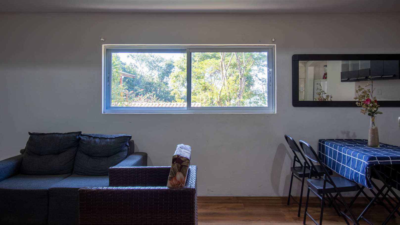 - La sala cuenta con sillón, sofá y chimenea