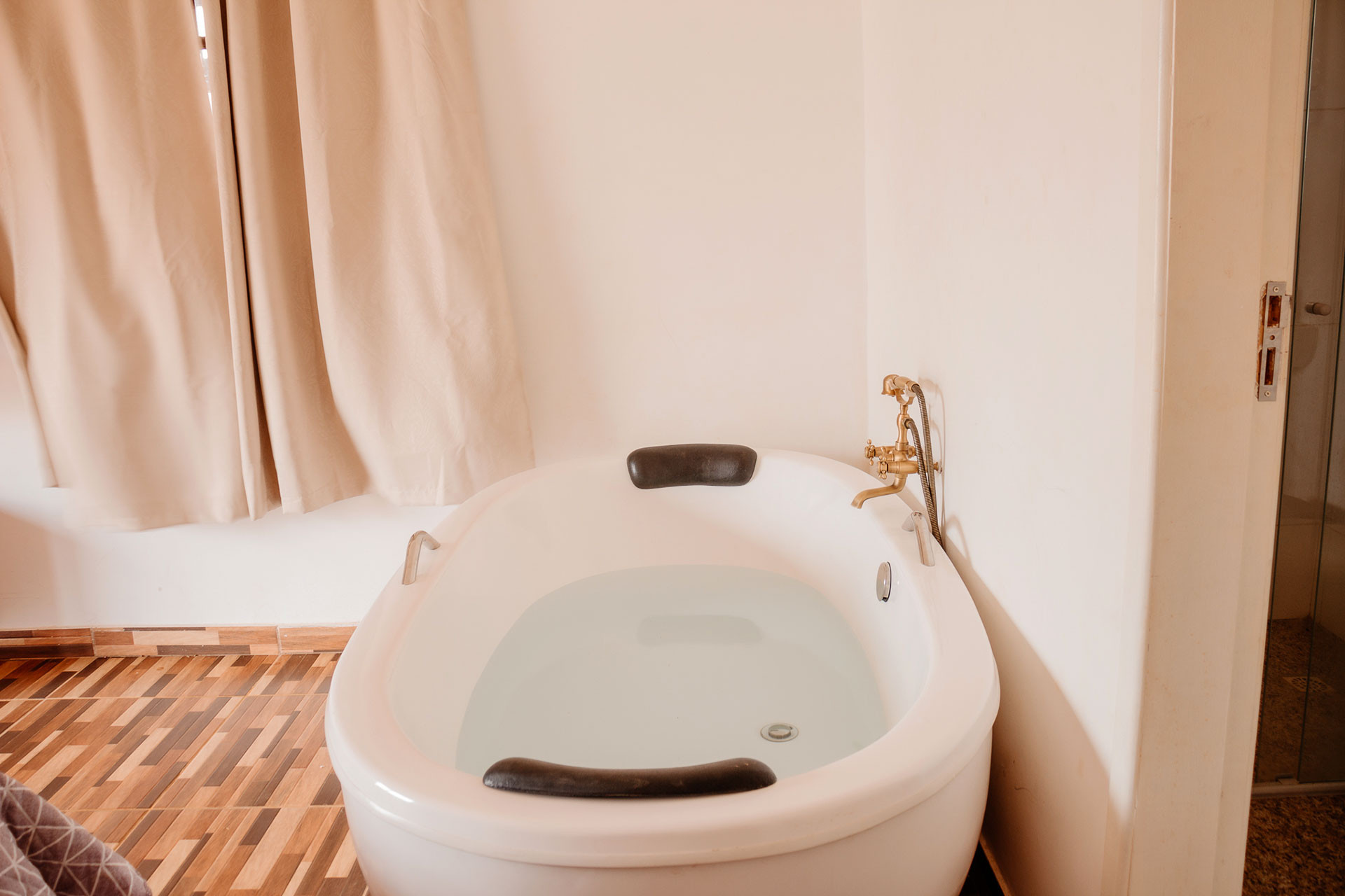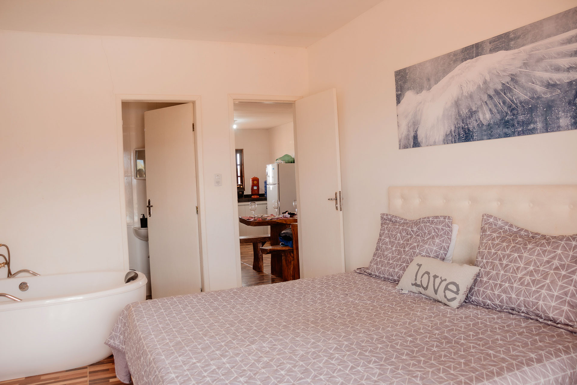 - Os banheiros possuem chuveiro a gás, box de vidro/acrílico e banheira