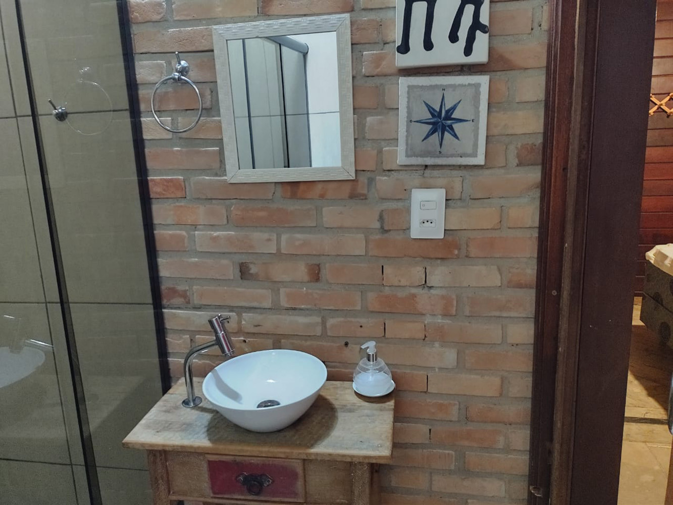 - Todos os quartos são suítes com chuveiro elétrico, box de vidro e em um deles há secador de cabelo. Neles, você encontrará armário, edredom, protetor de colchão e ventilador de teto