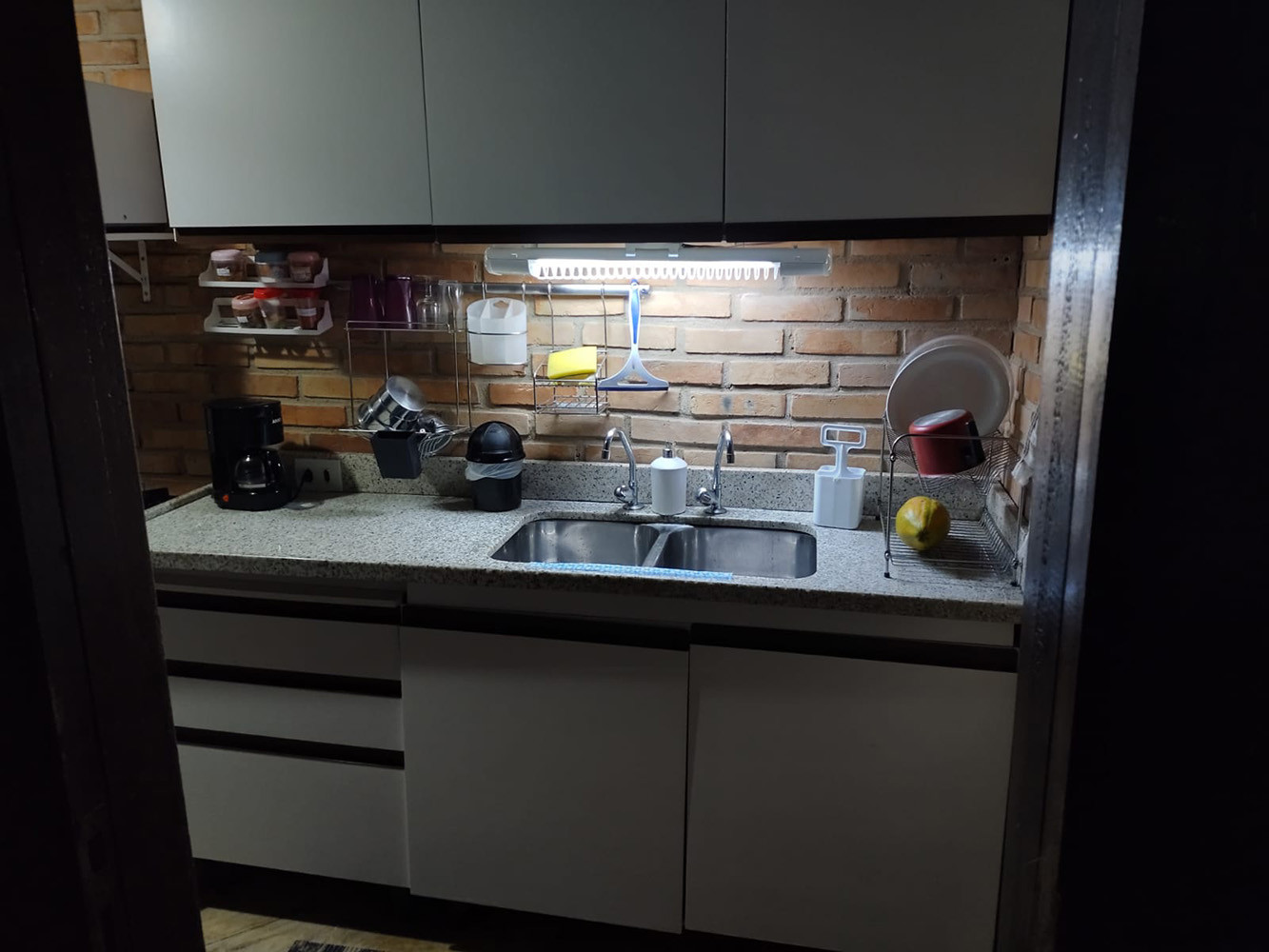 - Cozinha equipada com cafeteira, fogão, forno, geladeira, liquidificador, micro-ondas e torradeira