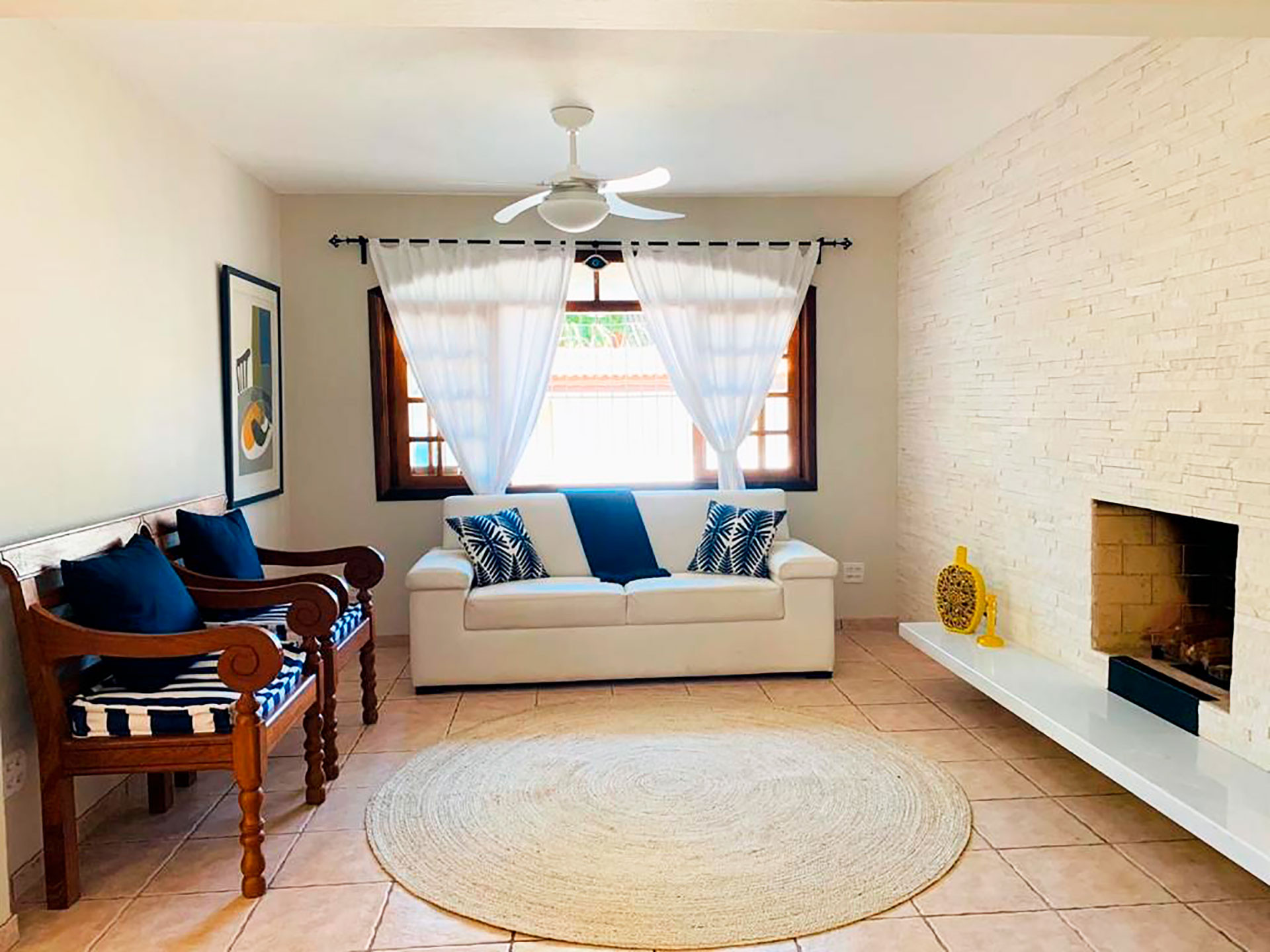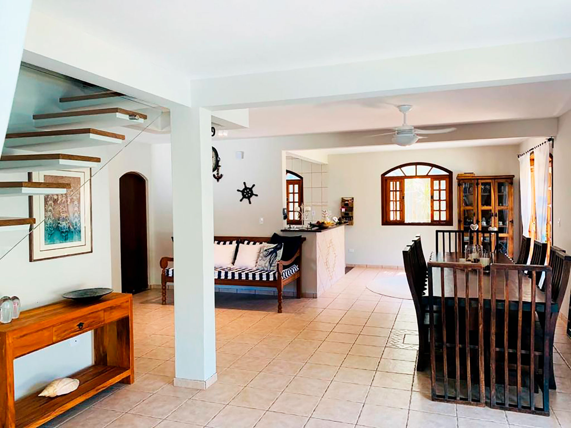 Na sala você encontra mesa de centro, mesa de jantar, poltrona, sofá, smart tv e ventilador de teto.
