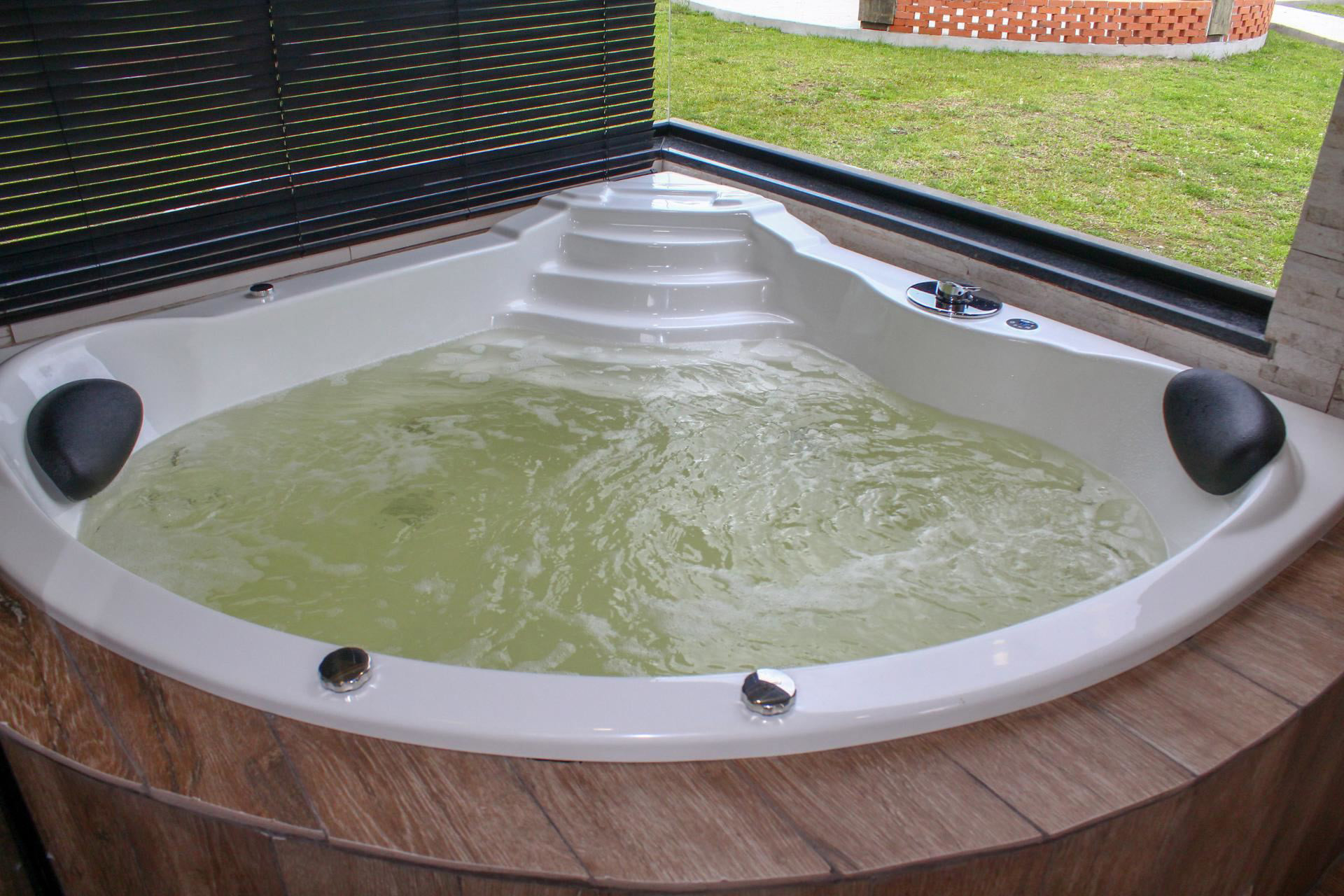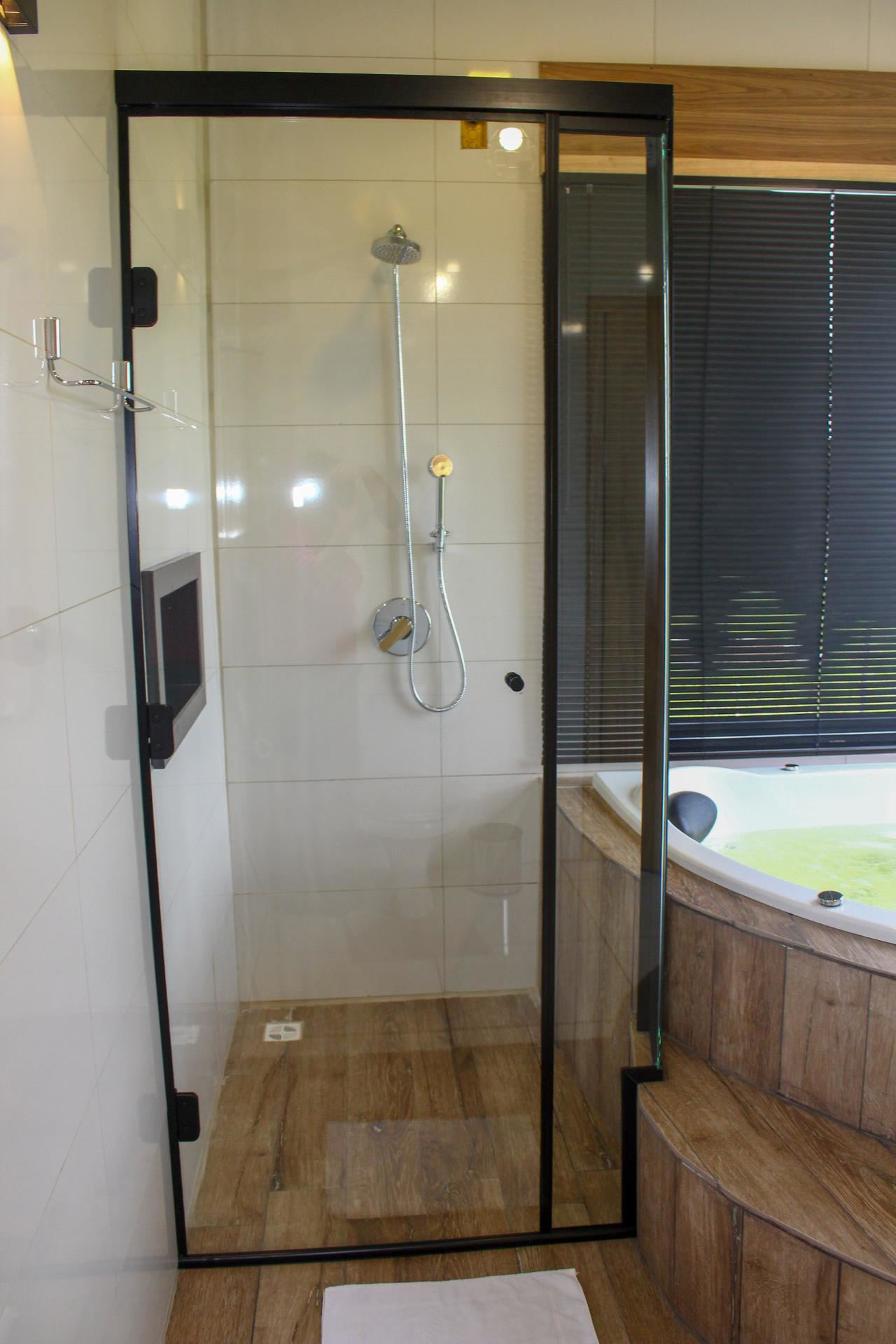 - Na suíte há 1 cama de casal, closet com cabideiro, edredom / cobertor, protetor de colchão, chuveiro a gás, box de vidro/acrílico e banheira de hidromassagem