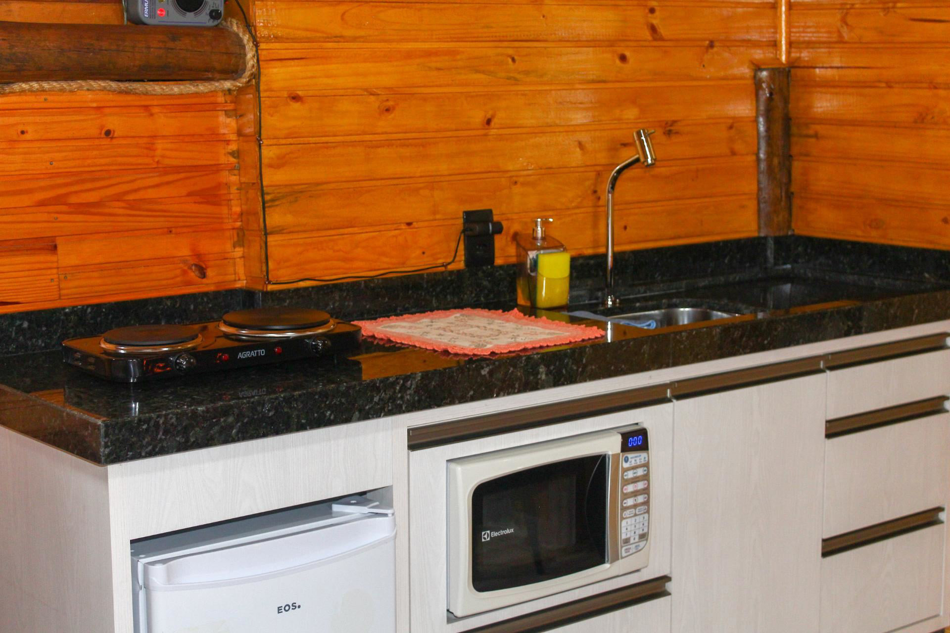 - A cozinha é equipada com todos os utensílios necessários para preparar suas refeições, incluindo fogareiro elétrico de bocas, frigobar, microondas, sanduicheira, balcão e mesa com poltrona