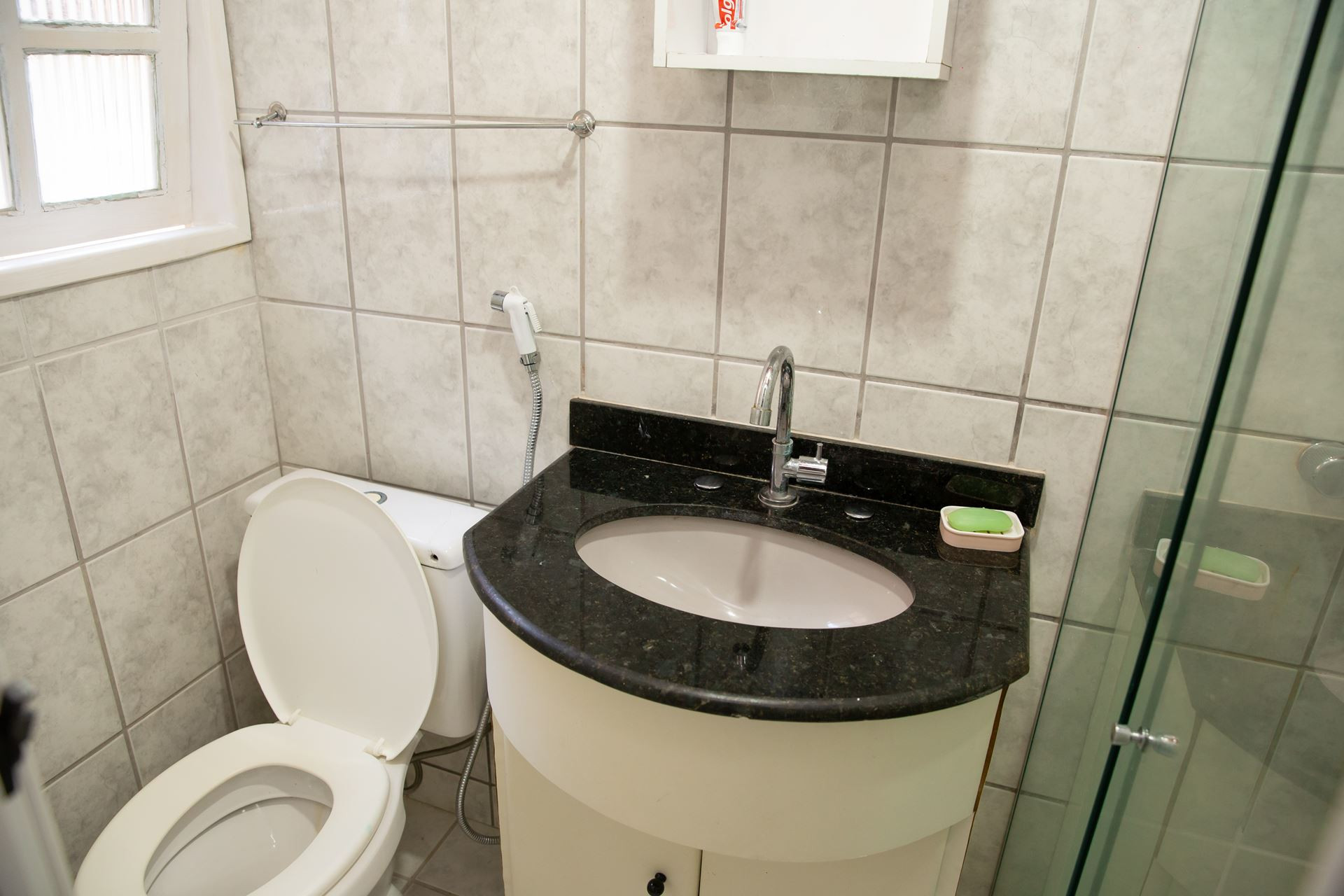 - O banheiro possui chuveiro a gás e box de vidro/acrílico