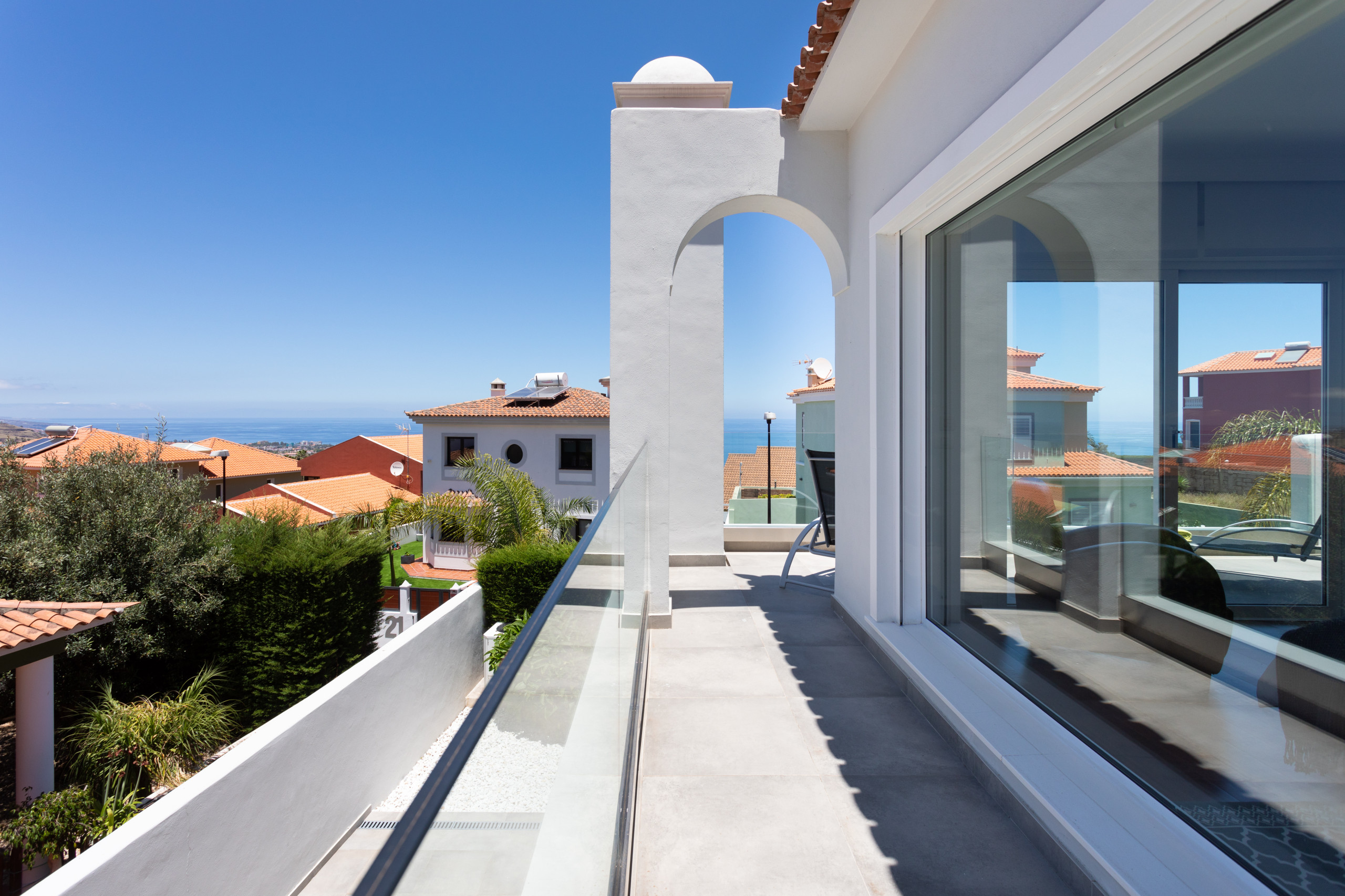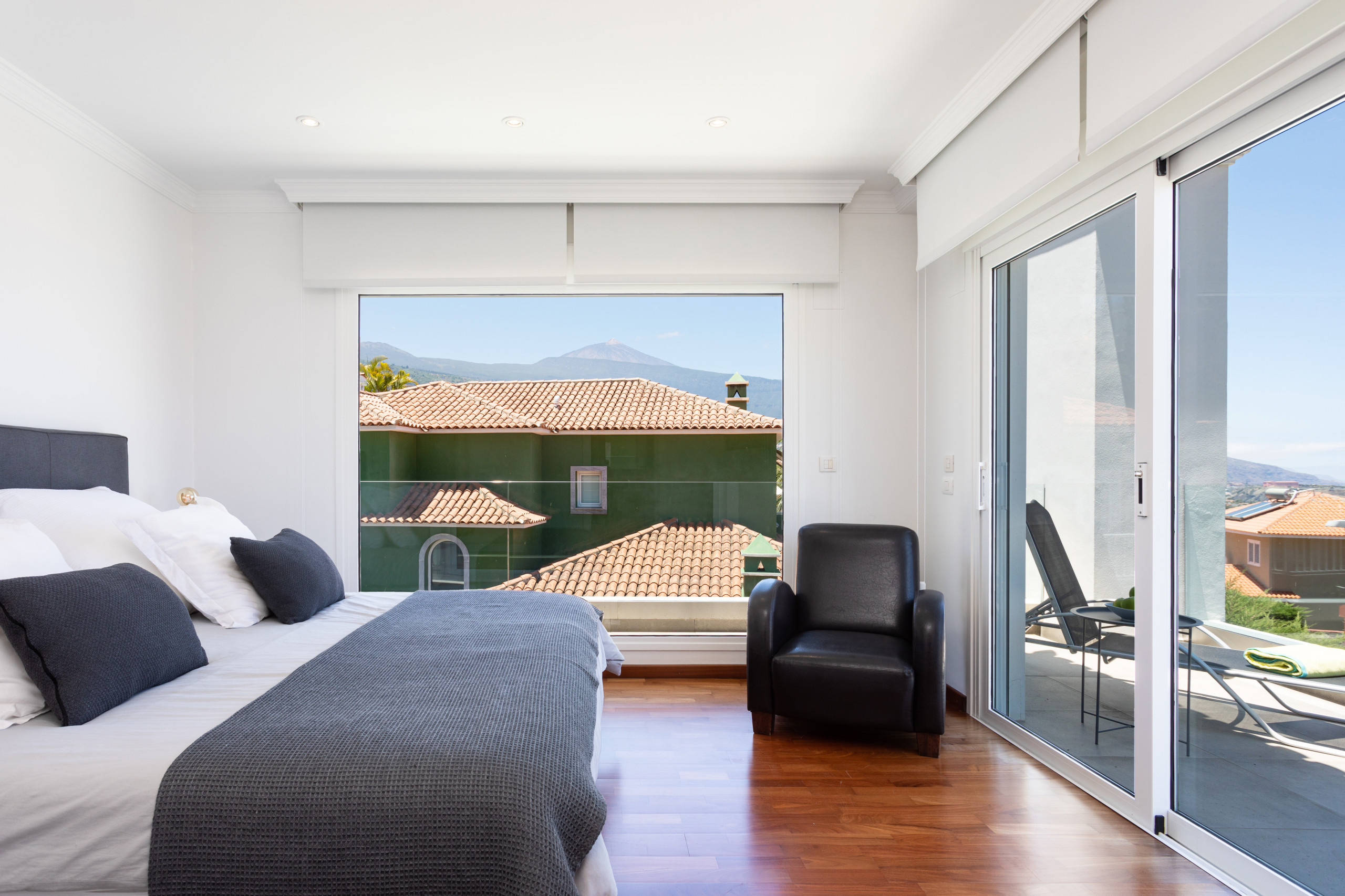 Subiendo al piso de arriba, hay tres dormitorios, todos equipados con aire acondicionado, y dos baños, uno de los cuales es en suite. El dormitorio principal cuenta con un balcón con una vista espectacular del Teide y el mar.