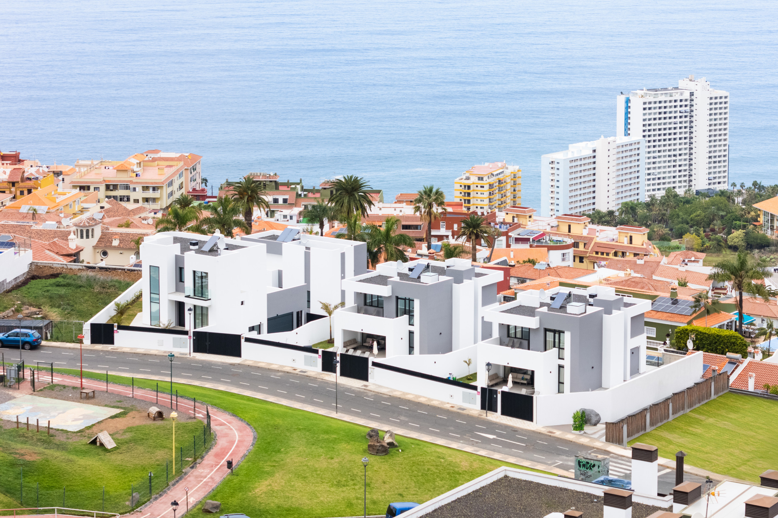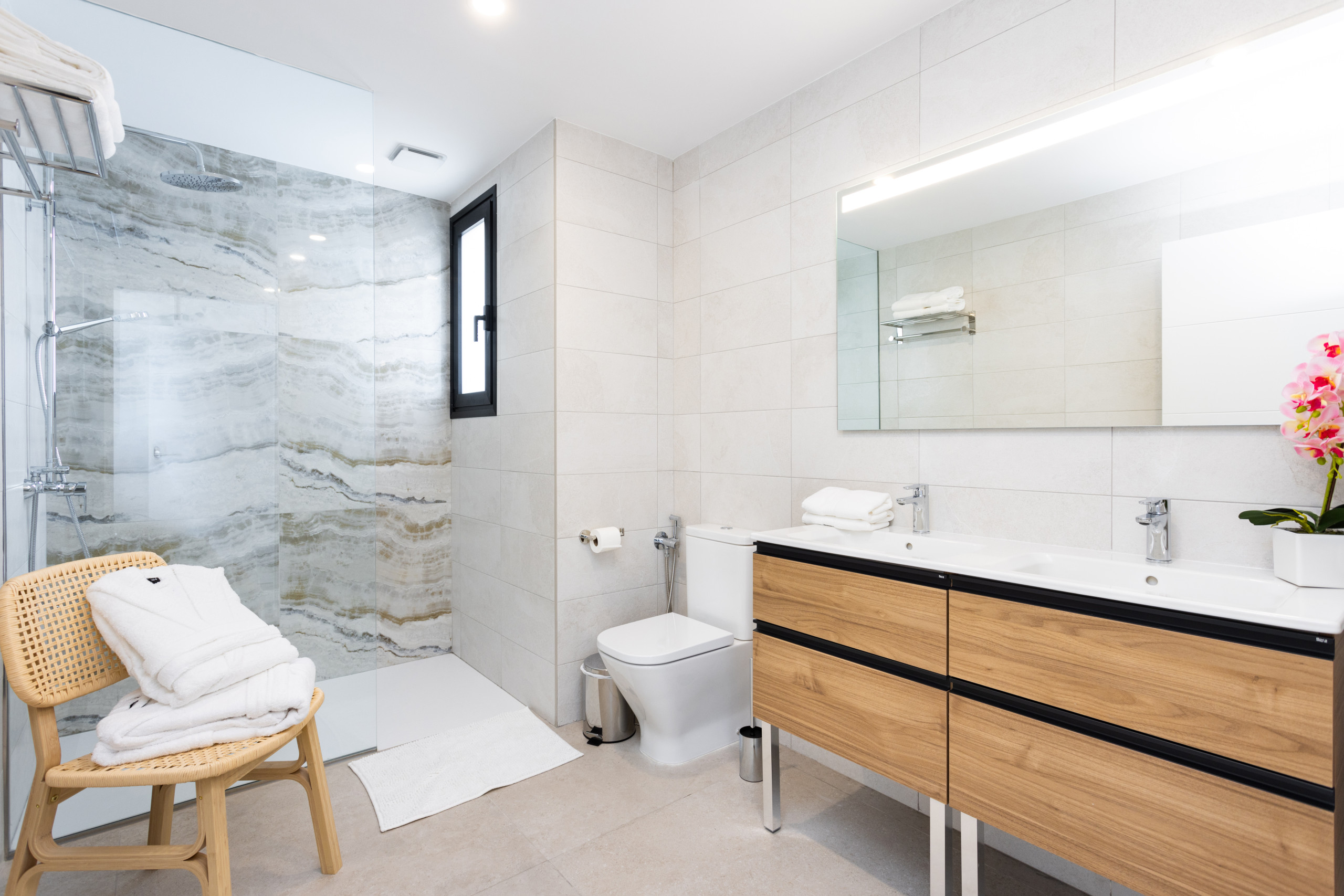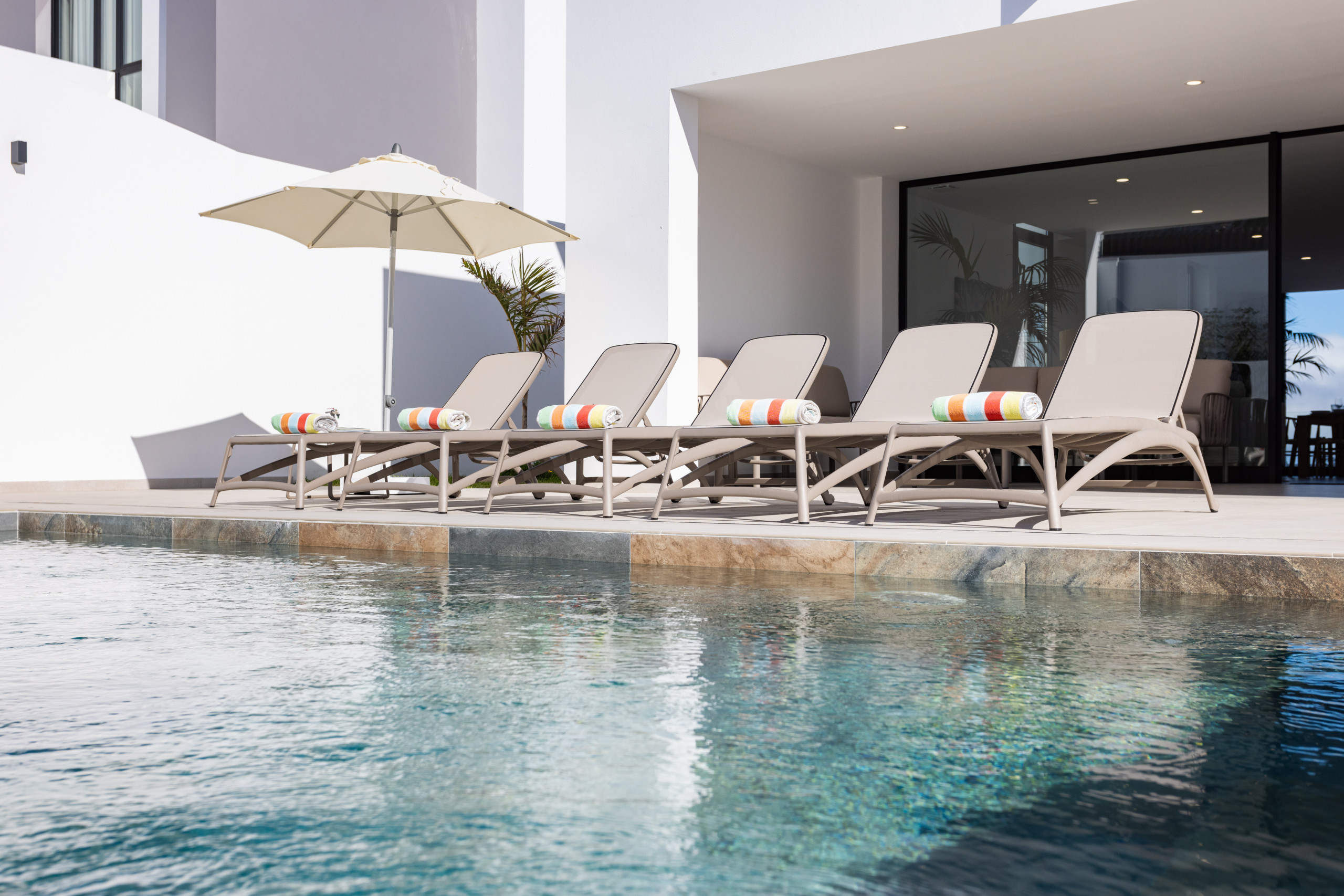 Gorvorana 3 se caracteriza por su luminosidad y diseño acogedor. En la planta superior se encuentran cinco dormitorios y cuatro baños, así como un balcón orientado al sur que ofrece vistas a la montaña y a la piscina privada. En la planta baja se dispone un gran espacio abierto con salón, comedor y cocina, todo ello enmarcado por unas vistas espectaculares al Puerto de la Cruz. También en esta planta hay un dormitorio adicional y un baño con ducha.