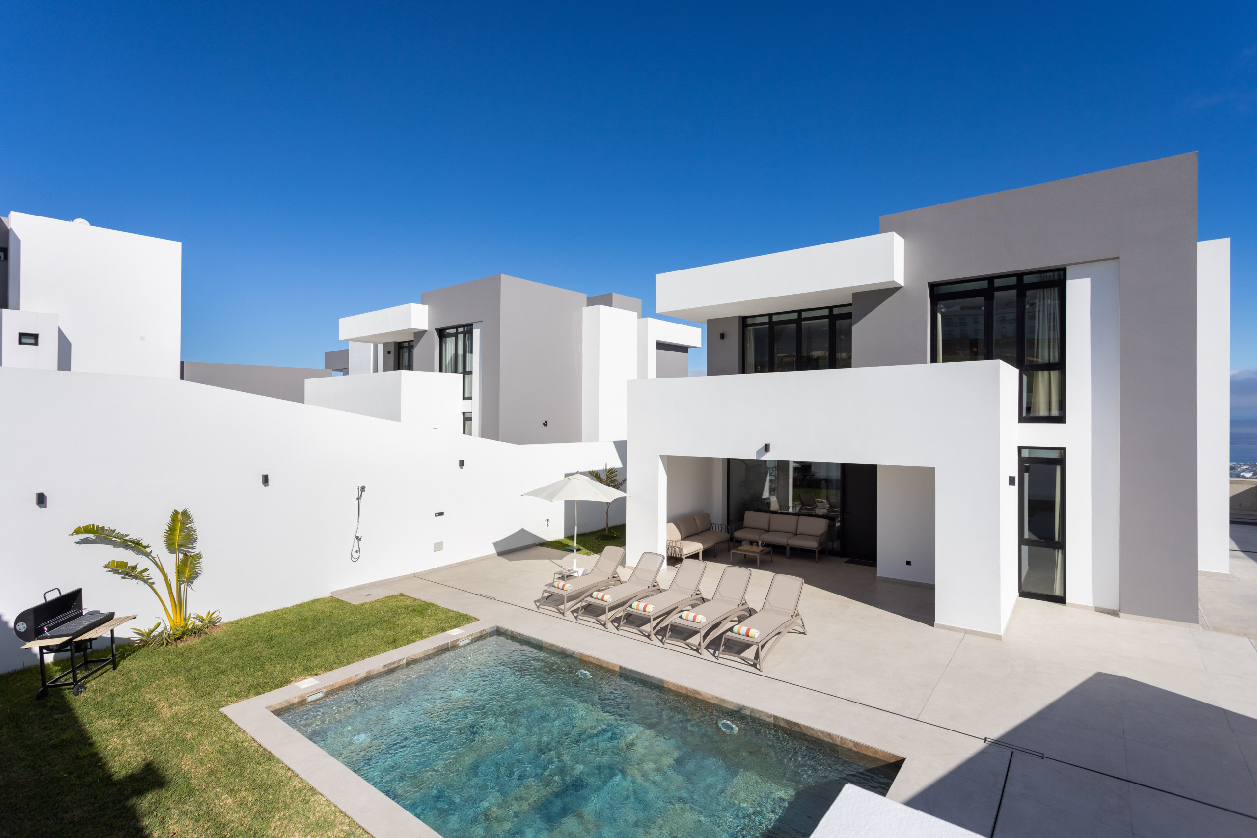 Descubre el refugio perfecto para tus vacaciones en esta elegante casa de lujo con diseño contemporáneo. Con cinco dormitorios, cuatro baños, una cocina completamente equipada y un amplio salón con impresionantes vistas al mar, esta propiedad combina comodidad, funcionalidad y estilo.