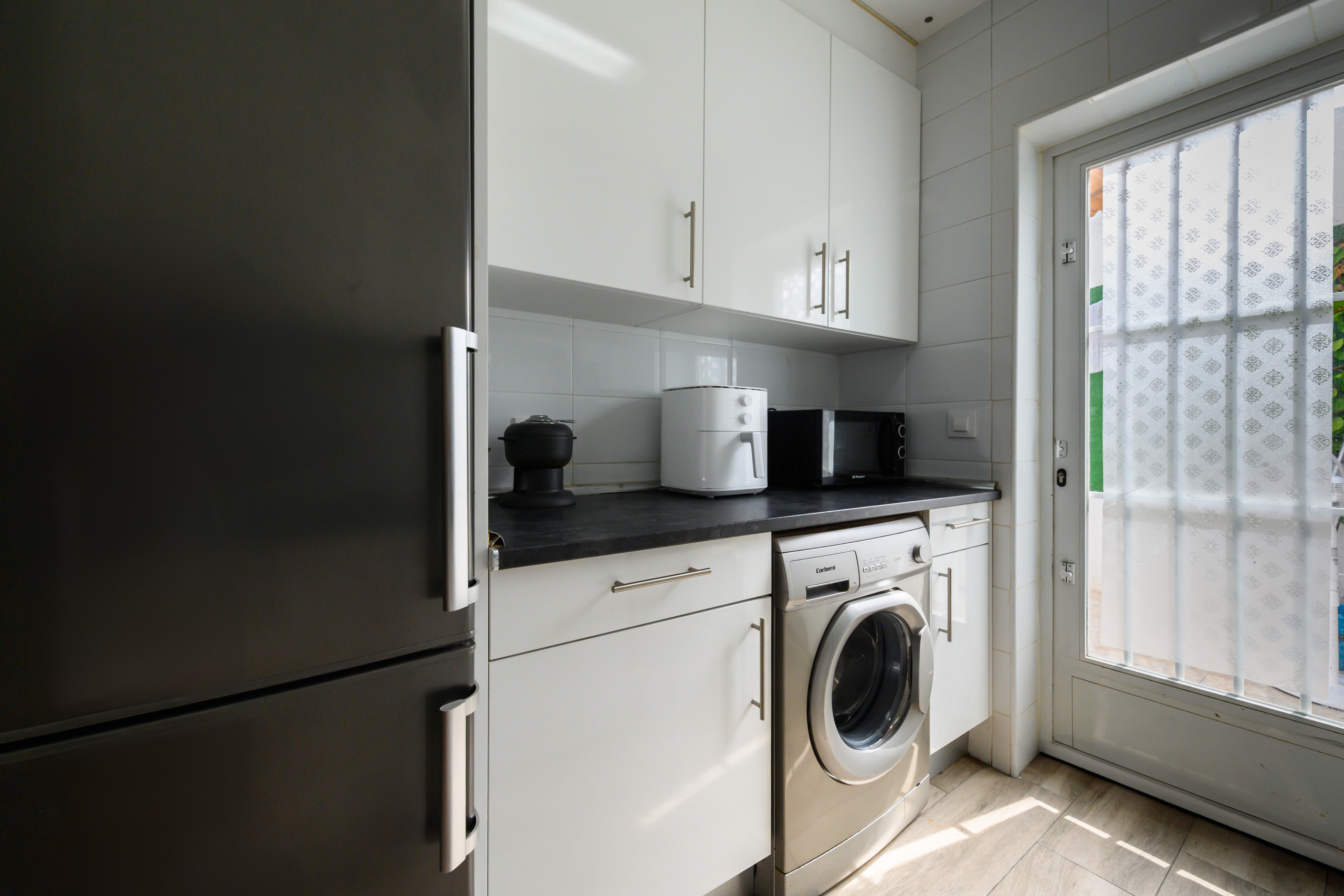 En la zona de comedor con acceso directo a la cocina. Cocina equipada con todos los electrodomésticos: nevera con congelador, vitro, horno, microondas, hervidor y tostadora y menaje de cocina.