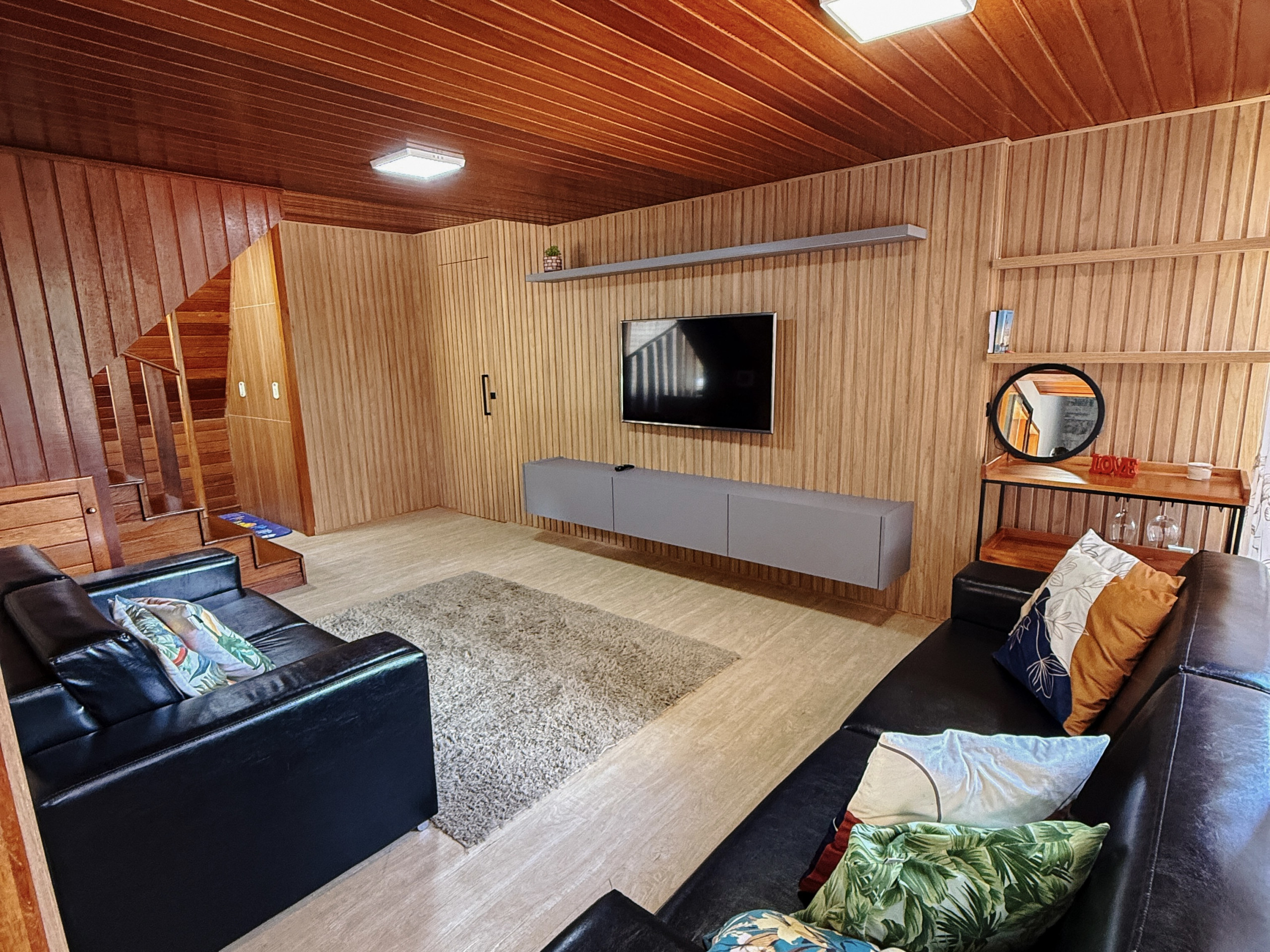 - Sala de estar com sofá, TV e 2 colchões de solteiro extra