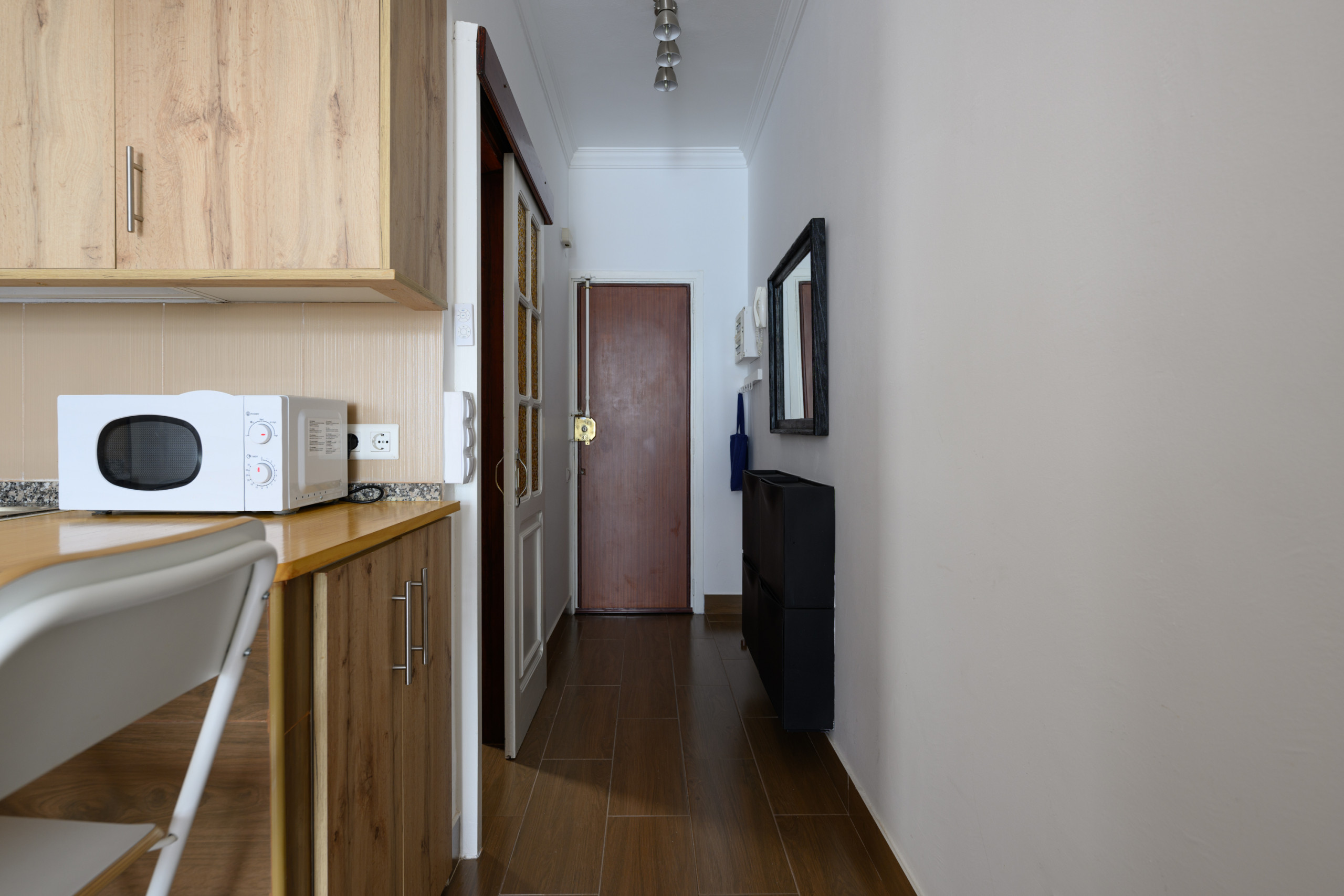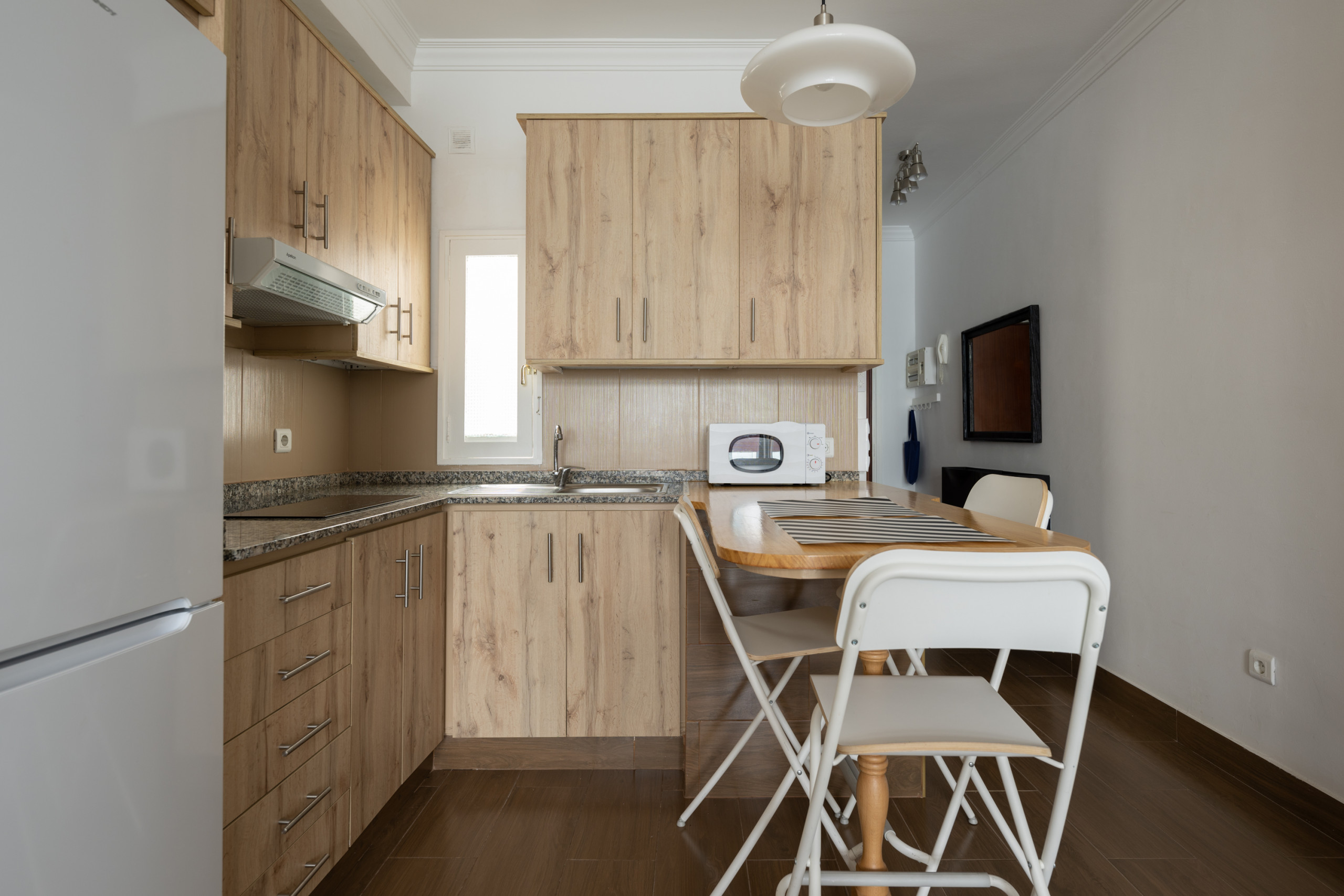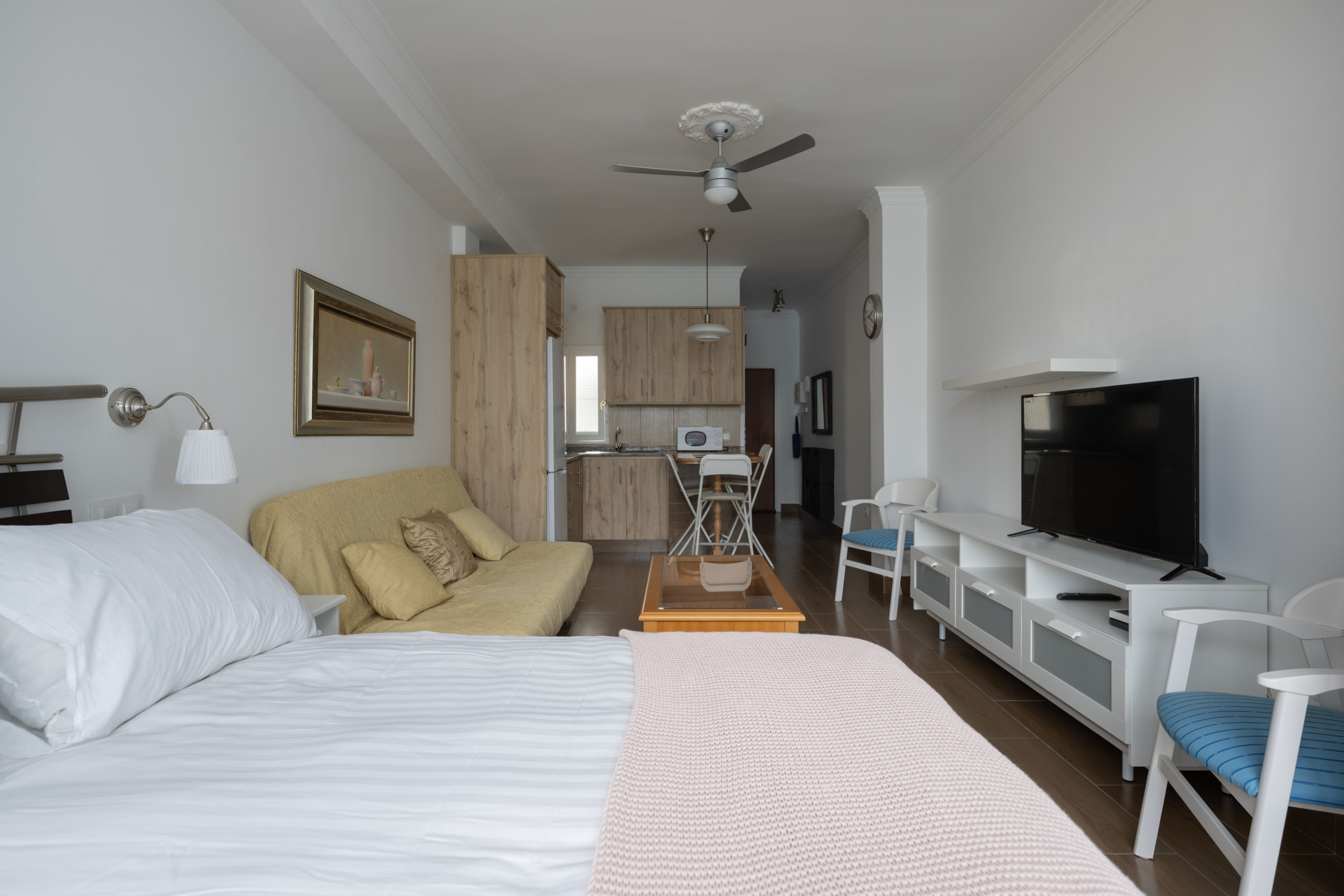 El estudio cuenta con una cocina práctica equipada con nevera, microondas, cafetera y utensilios básicos para preparar sus comidas. También incluye WiFi, televisor, secador de pelo y un encantador balcón donde podrá disfrutar de las vistas al mar en cualquier momento del día.