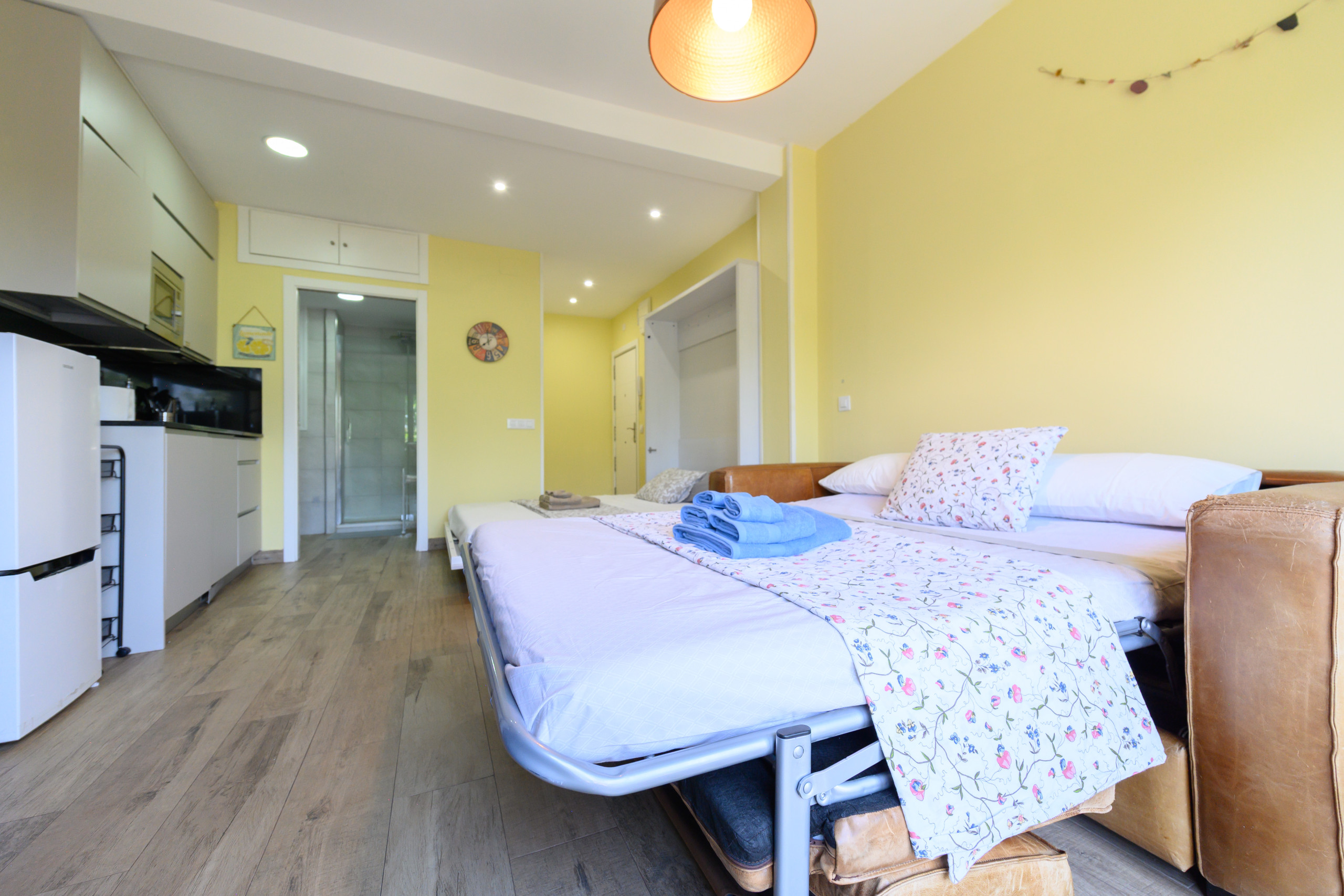 En el interior, encontrarás un salón abierto que combina una cómoda cama de matrimonio con un sofá cama, adaptándose a tus necesidades.