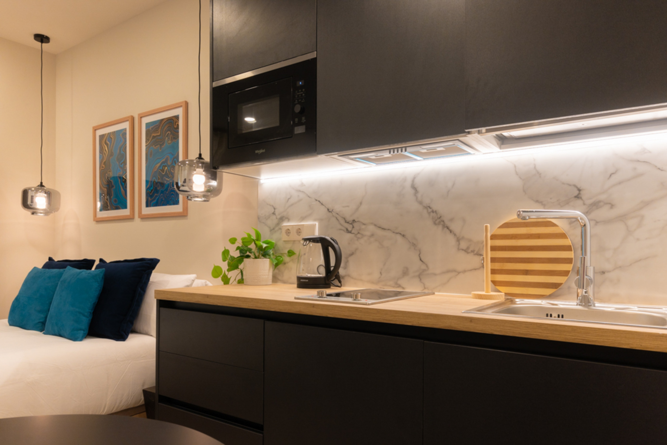 La zona de descanso te ofrece un espacio cómodo y relajante donde podrás desconectar, leer o planificar tus actividades. Además, el estudio dispone de un armario espacio-so para que tengas todas tus pertenencias perfectamente organizadas durante tu estancia.