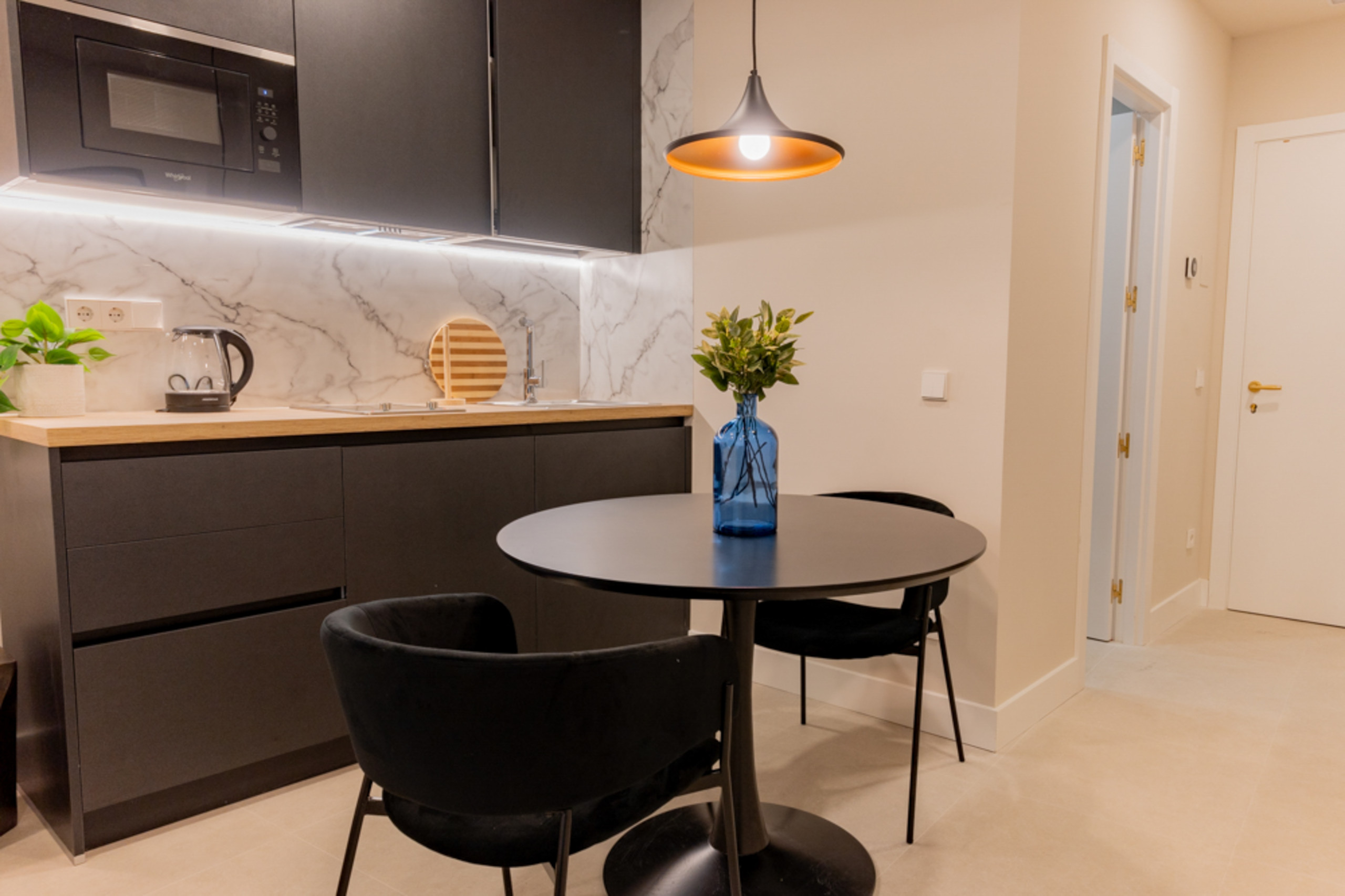 Pensado para tu comodidad, el estudio cuenta con una cama doble que invita al des-canso tras un día de turismo o trabajo. La distribución del espacio incluye una cocina americana, equipada con todo lo necesario, y una mesa de comedor para dos personas, perfecta para desayunar, cenar o compartir una conversación en un ambiente acogedor.