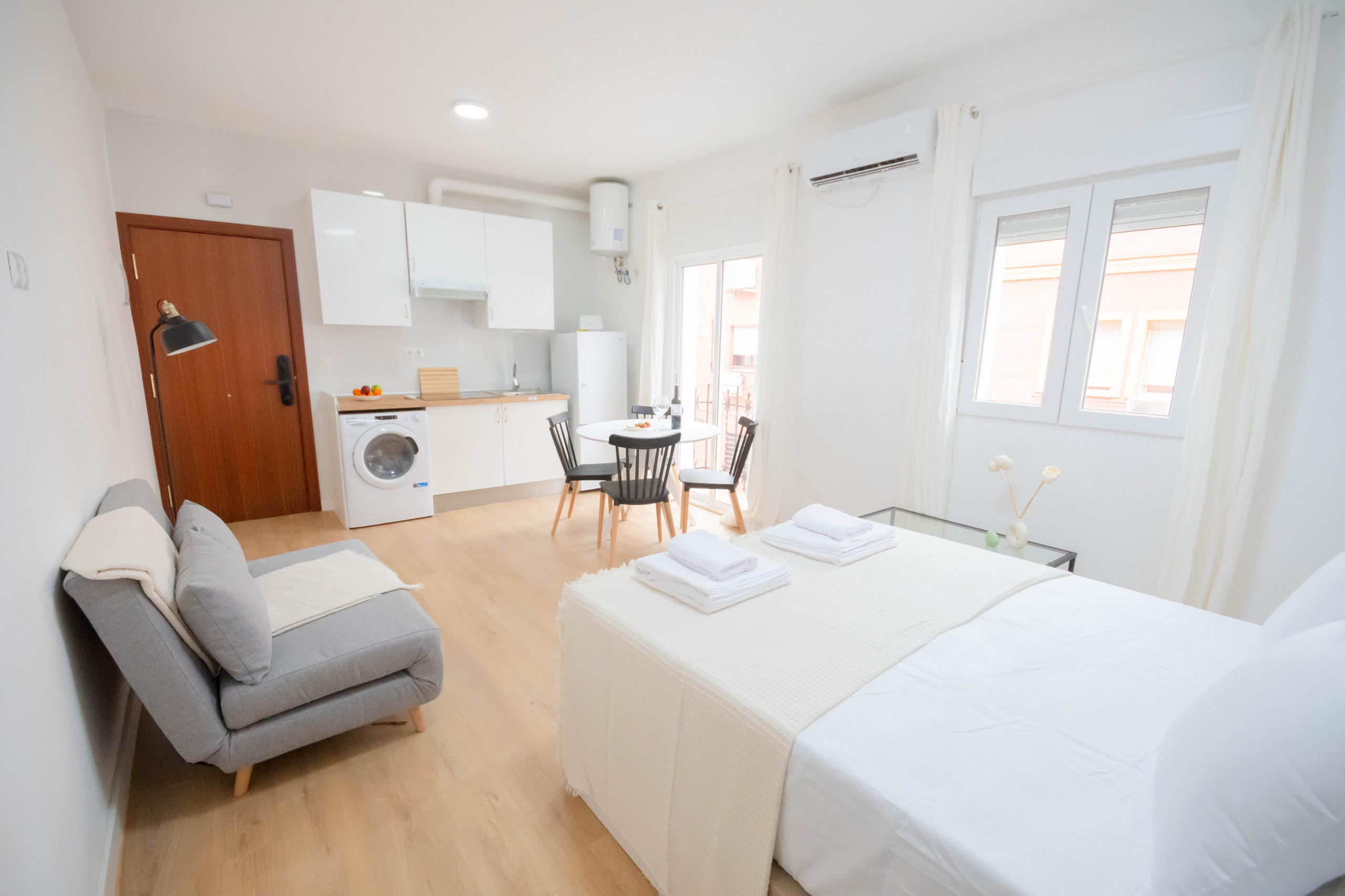 El apartamento está diseñado para recrear la experiencia de comer tapas en Madrid. El salón cuenta con mesas altas y bancos, mientras que la cocina tiene una encimera a la altura de una barra que facilita servir hay detalles por todo el apartamento que evocan la sensación de un barrio típico de Madrid ¨La Latina¨, por este motivo si está buscando un apartamento con carácter, ¡no busque más este estudio es la elección perfecta!