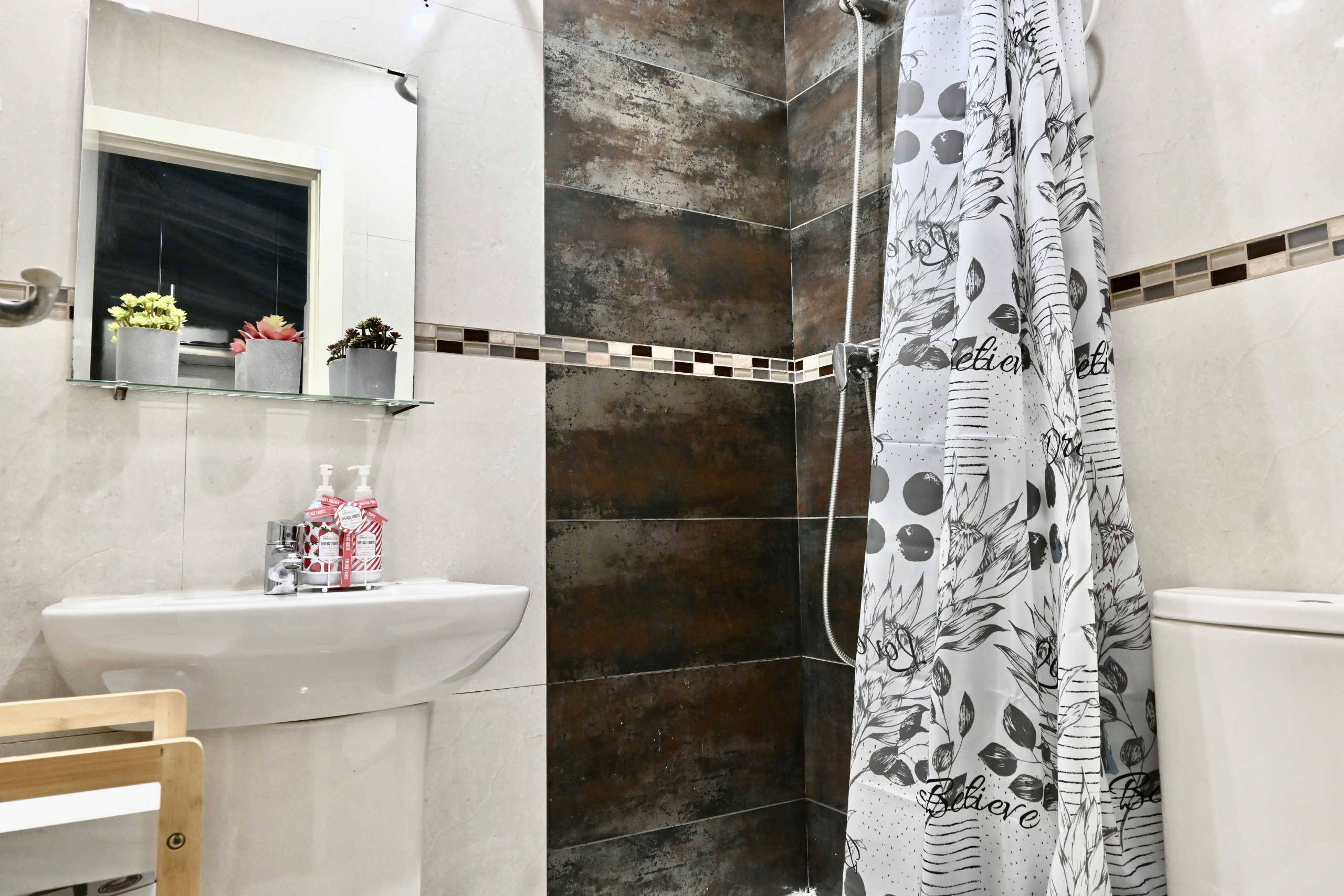 El baño independiente ofrece privacidad y comodidad. Cuenta con una ducha, inodoro y lavabo. Se proporcionan toallas limpias y artículos de tocador básicos para tu conveniencia.