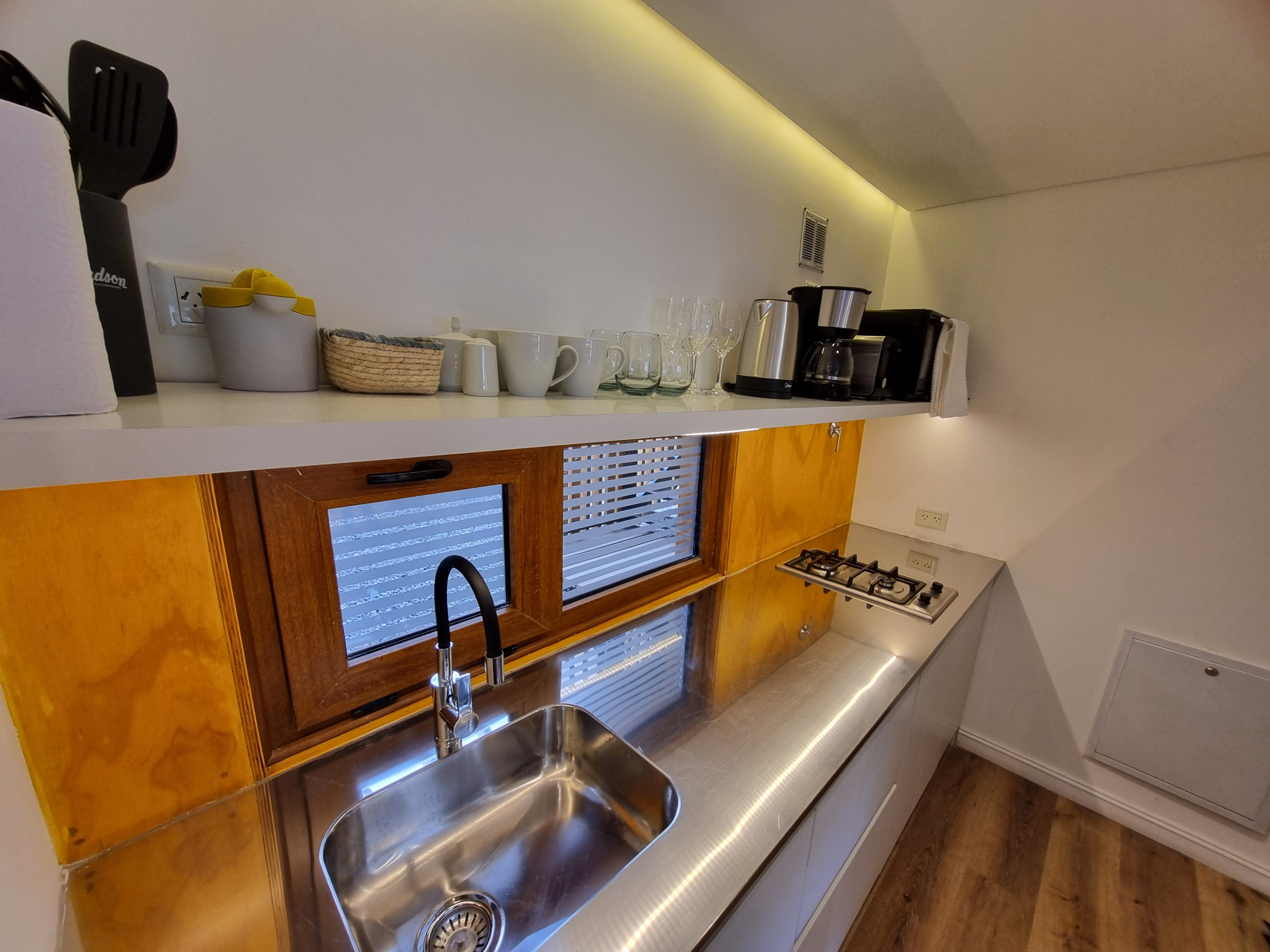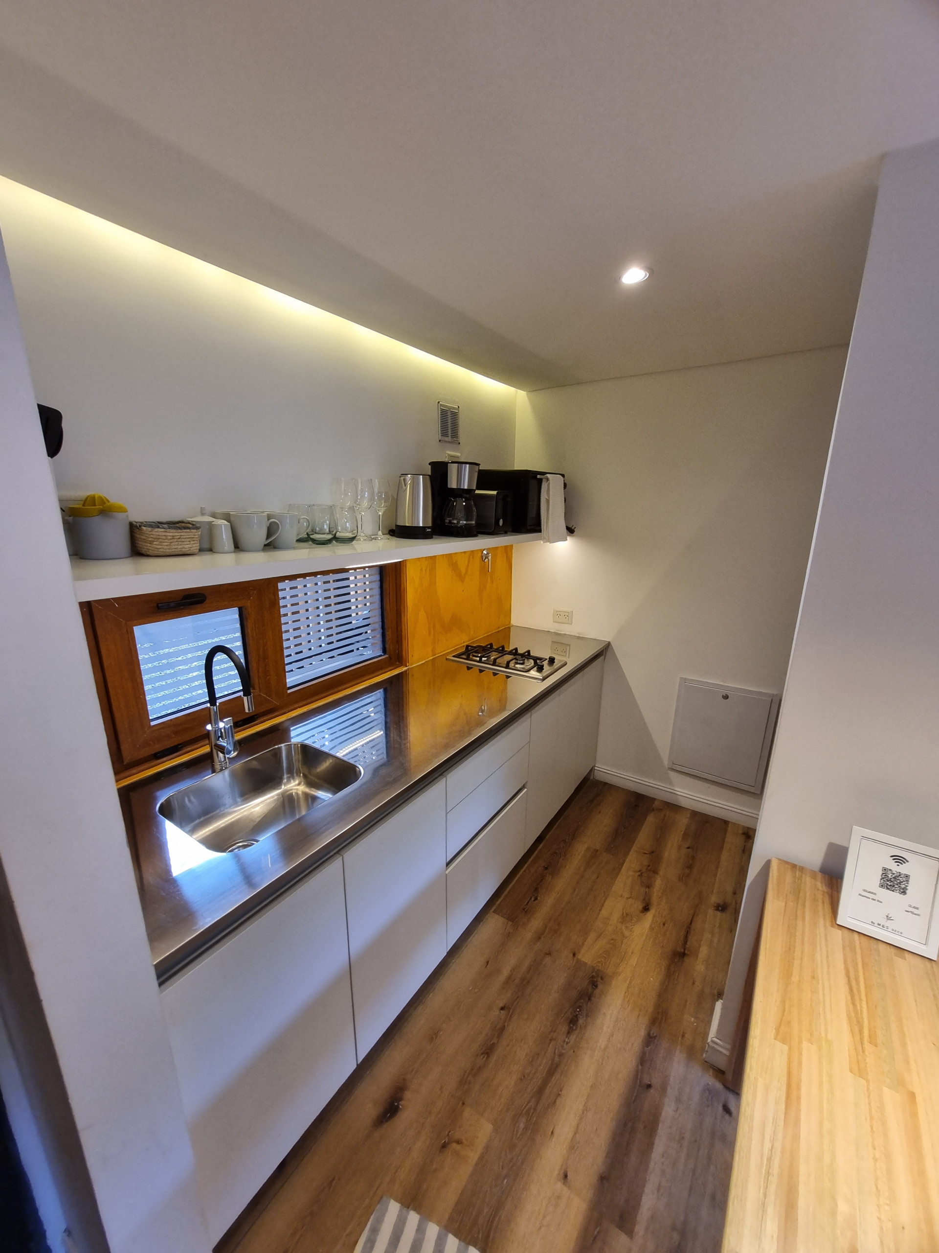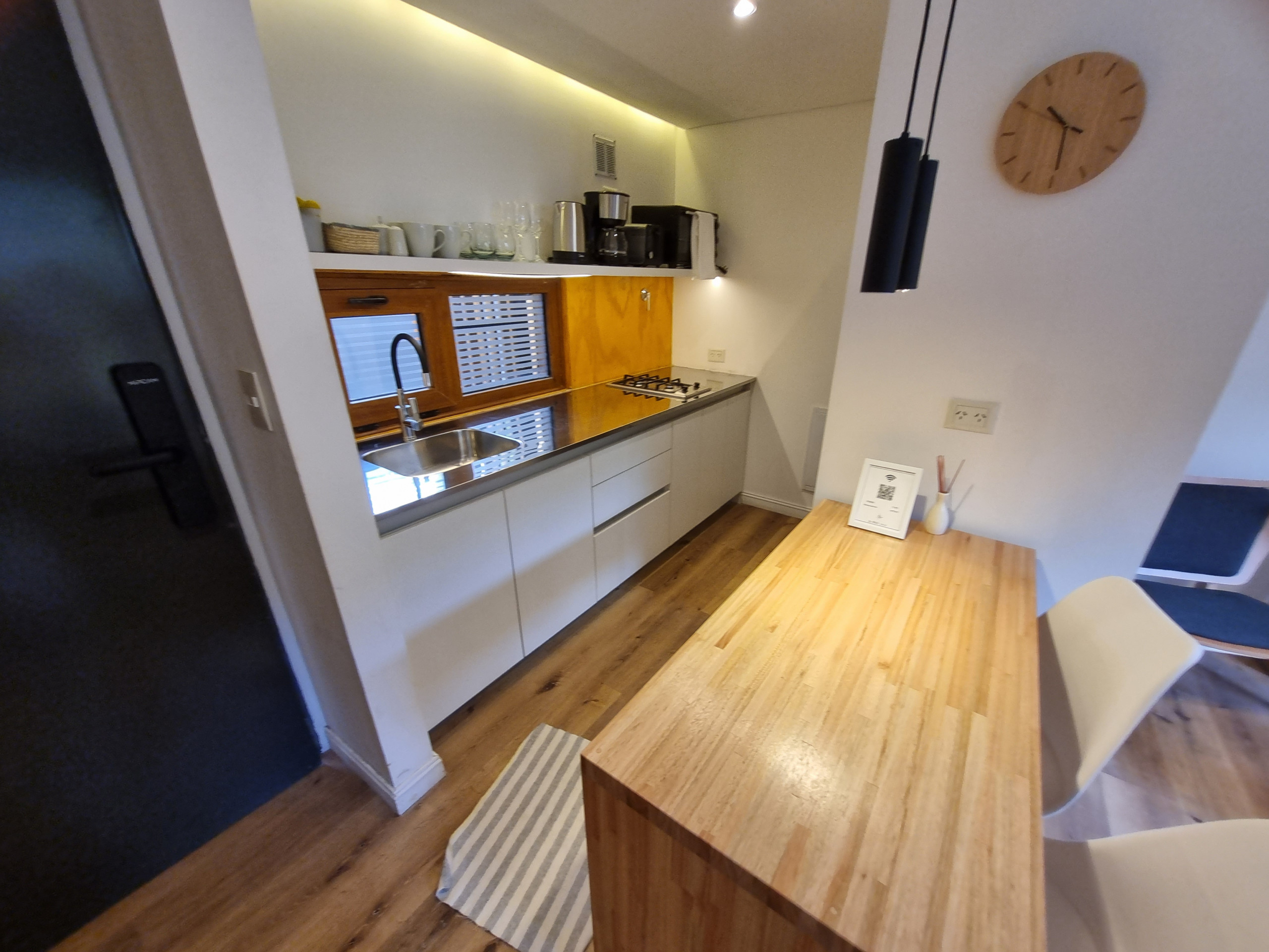 La cocina americana está completamente equipada con electrodomésticos de última generación, incluyendo refrigerador, lavadora, máquina de café, microondas, tostadora, hervidor y una completa dotación de utensilios de cocina. Ideal para preparar deliciosas comidas durante su estancia.