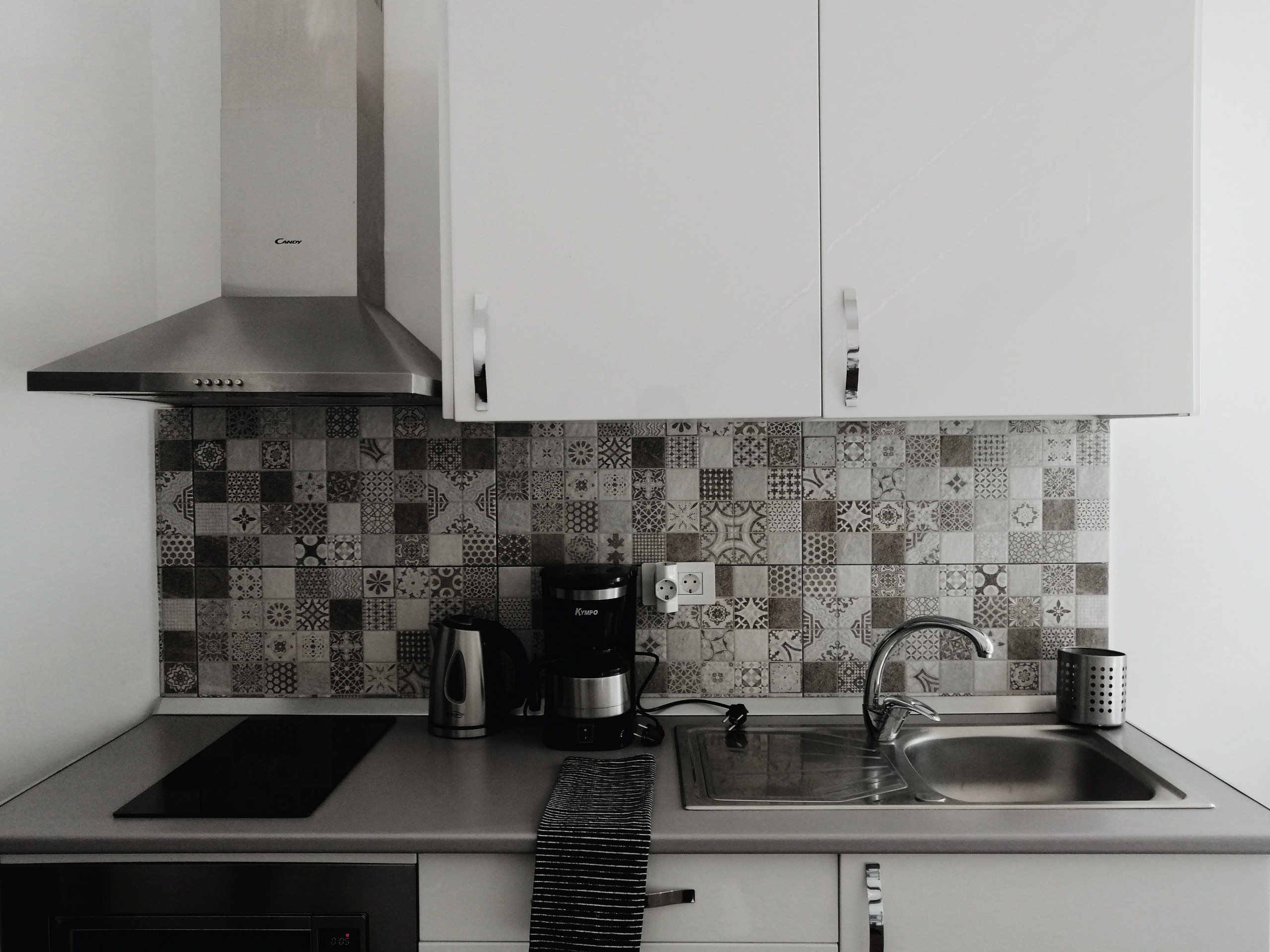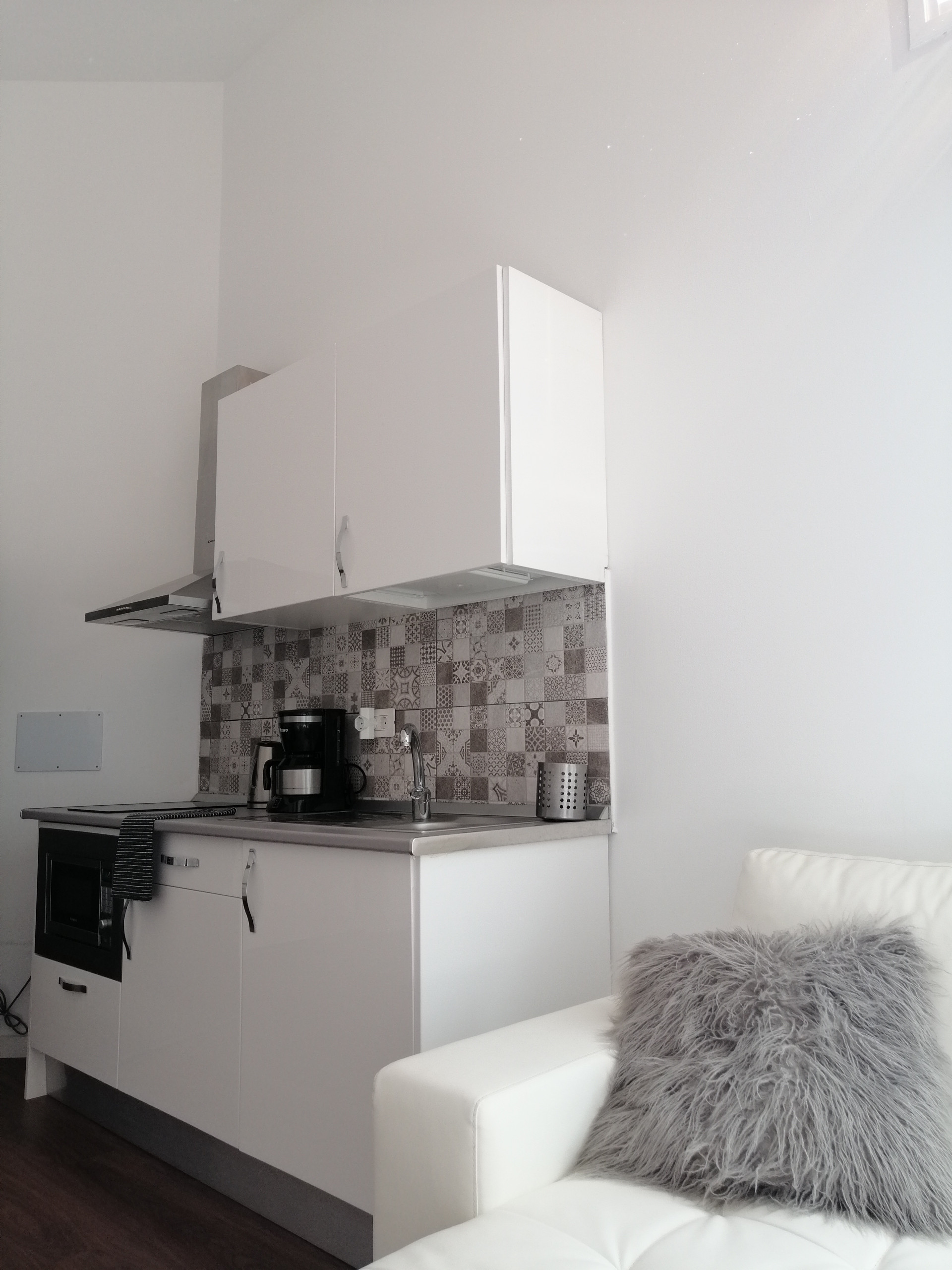 La cocina americana, de inducción, está equipada con nevera, microondas, horno, congelador, vajilla/cubertería, utensilios/cocina, cafetera y hervidor de agua.