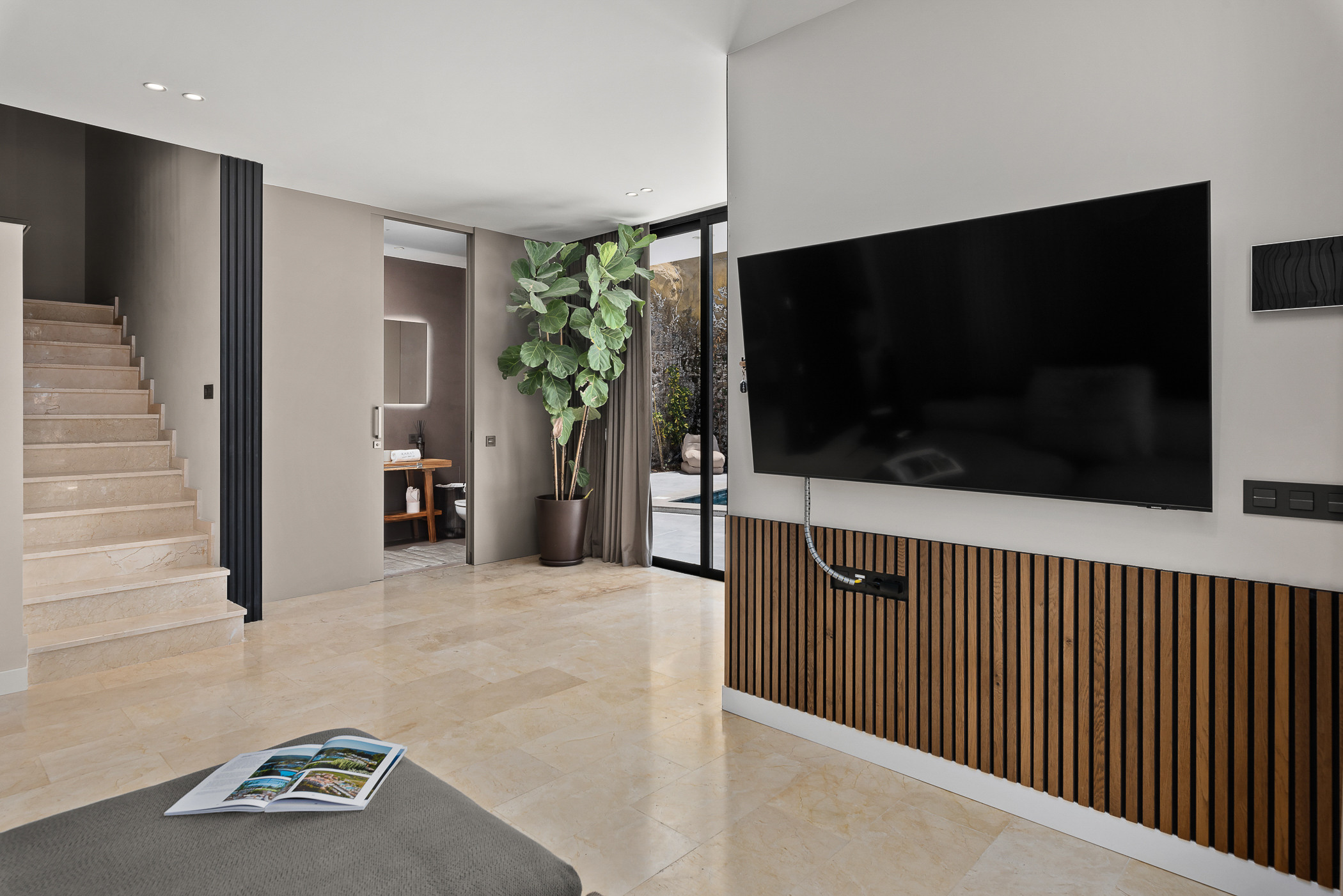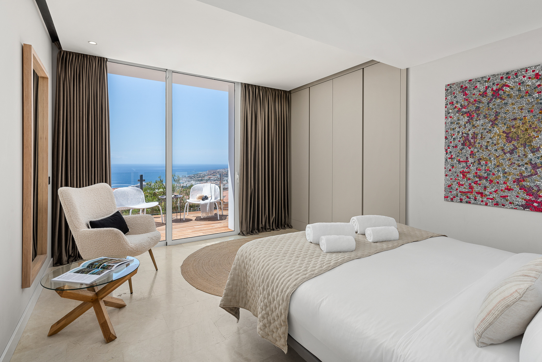 En la planta baja, dos amplias suites con baño privado se abren a una terraza con vistas panorámicas al océano. La piscina climatizada invita a la relajación, mientras que un exclusivo chill out en el interior de una cueva natural crea un ambiente mágico y sereno.