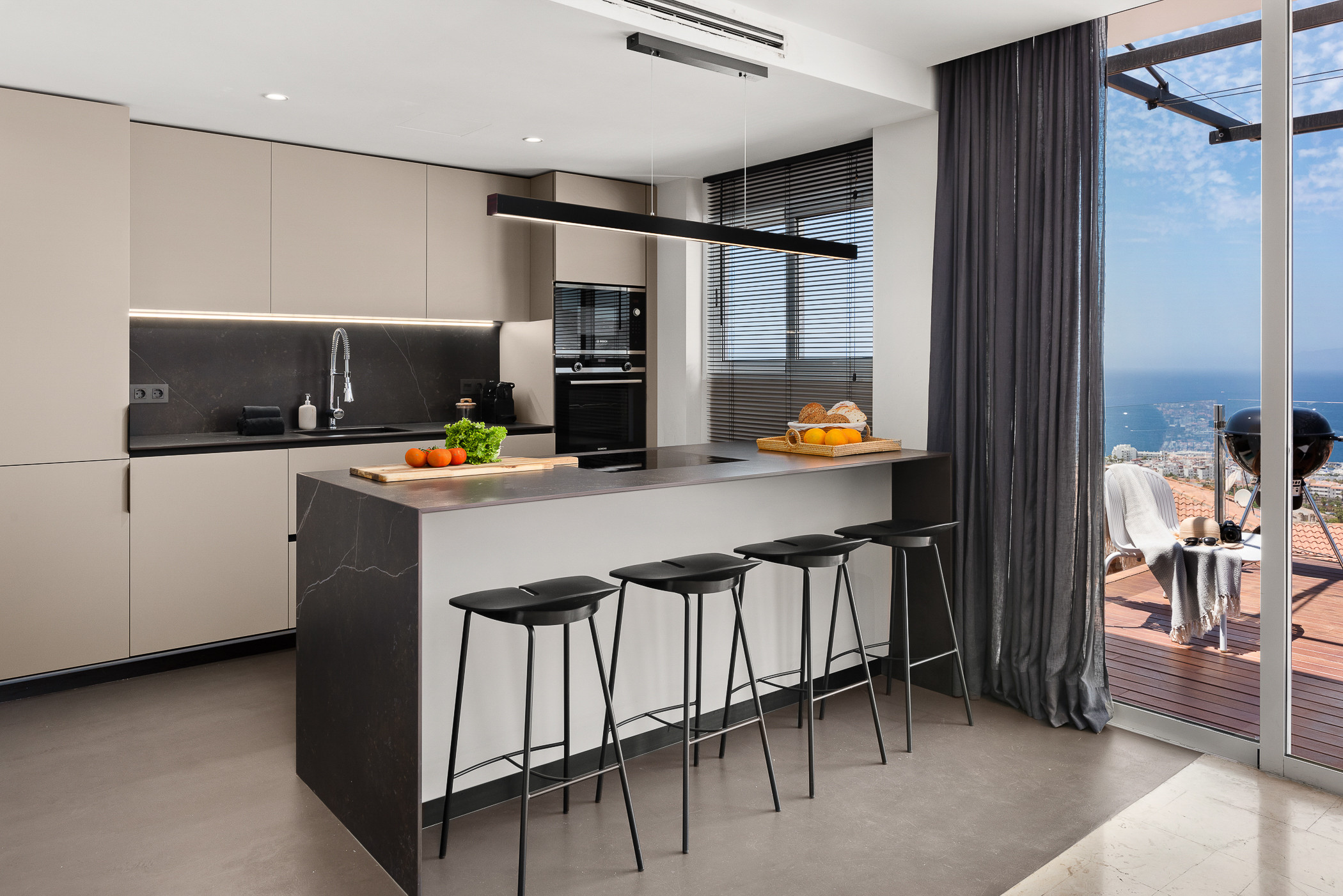 La planta superior alberga un espacioso salón con cocina integrada, pensado para compartir grandes momentos. Desde aquí, se accede a una espectacular terraza con vistas abiertas, perfecta para disfrutar de cenas al aire libre y puestas de sol memorables.