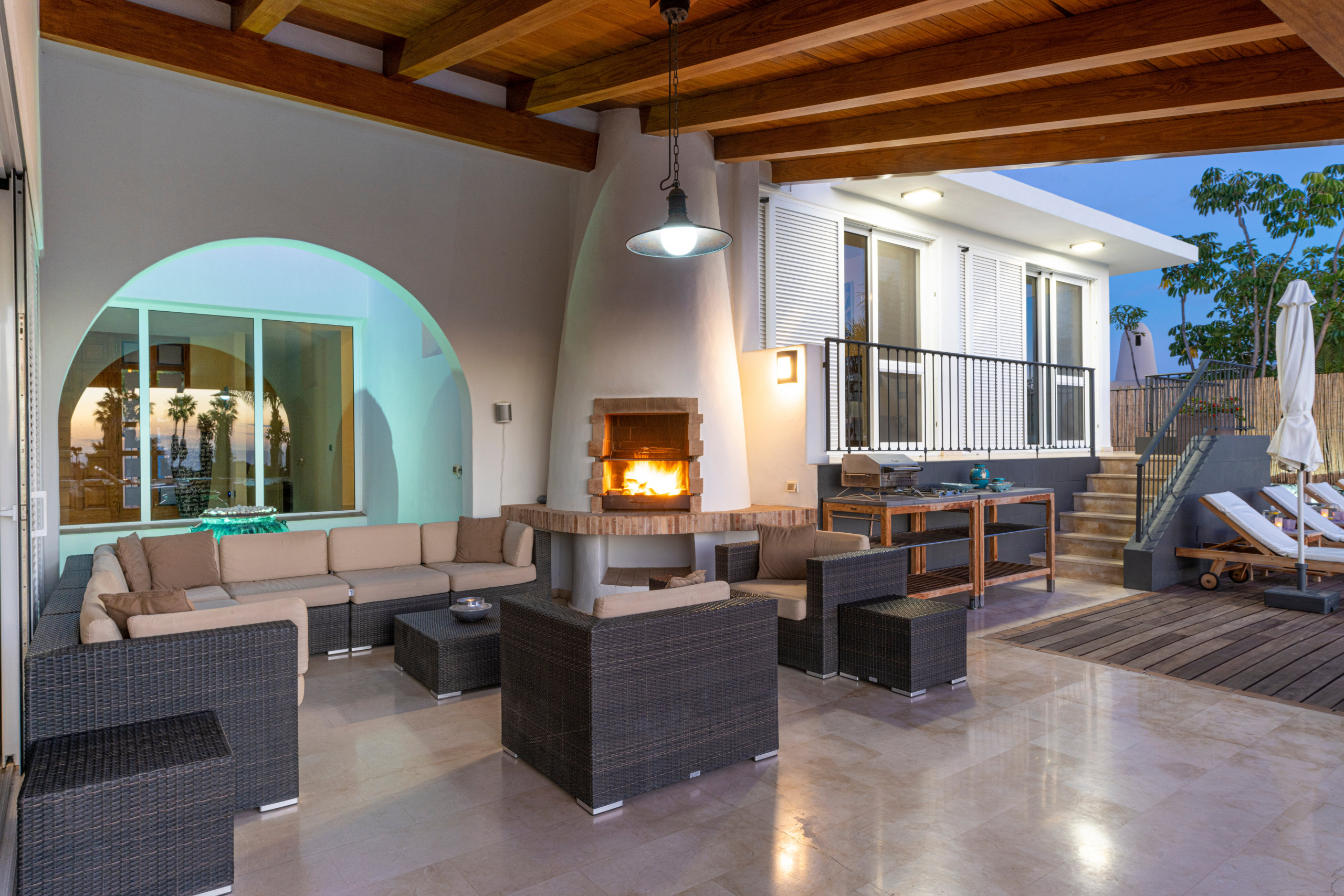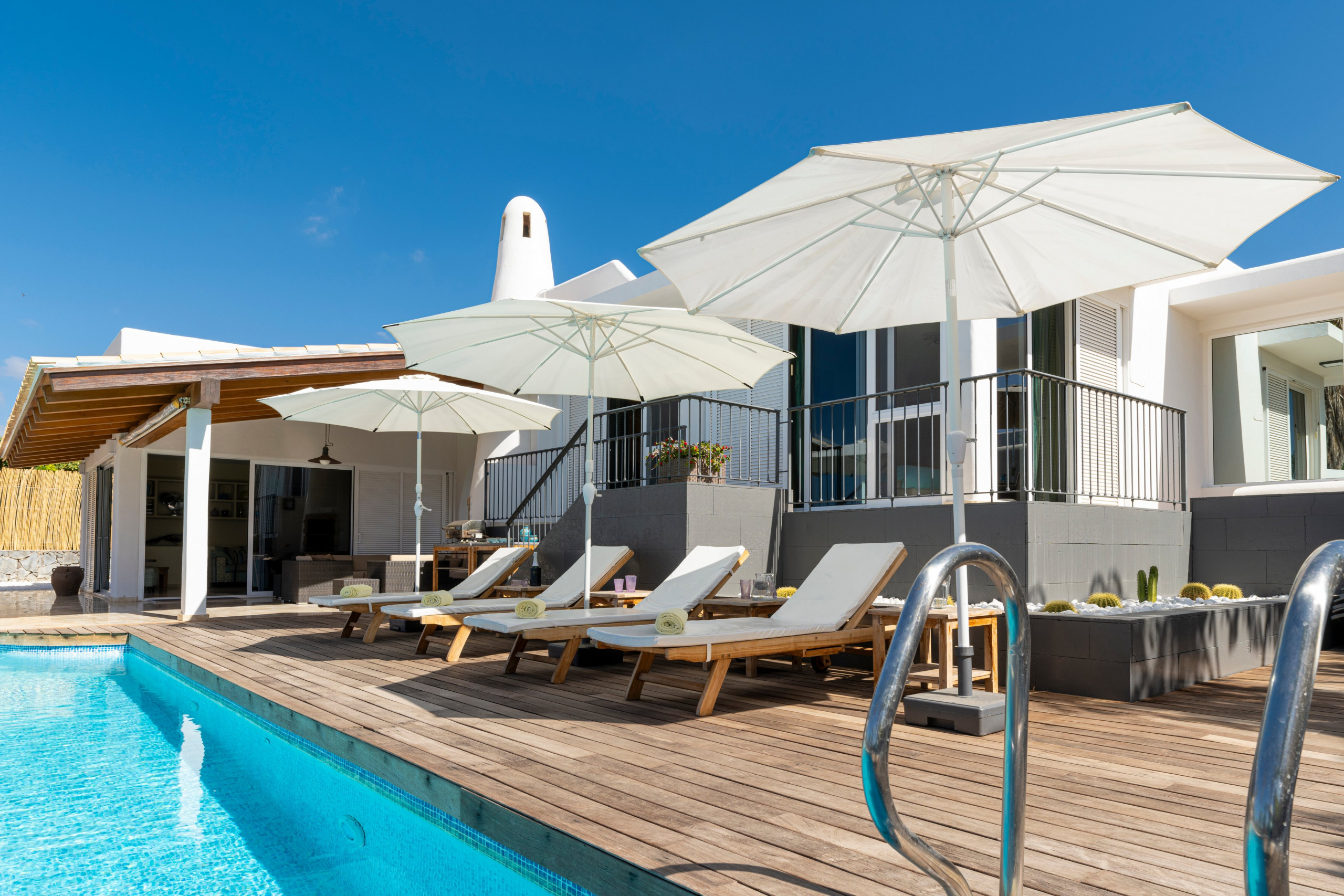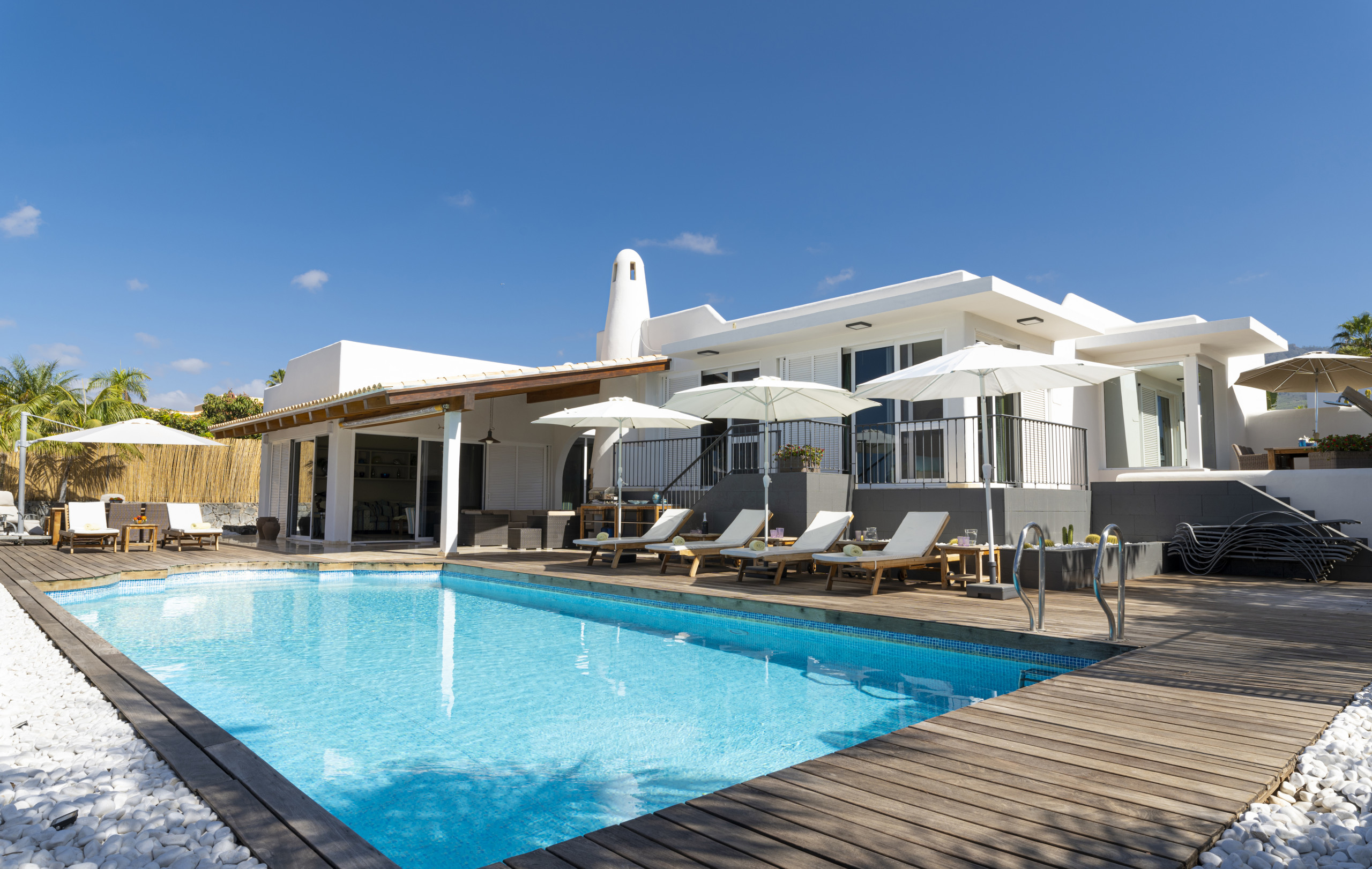 En el exterior, la villa dispone de una espectacular terraza con comedor cubierto para 10 personas, zona chill out, 10 tumbonas, 5 sombrillas y una piscina privada climatizada a 28°C (13,5 x 5,5 m) con ducha exterior de agua caliente. La experiencia se completa con una gran zona gourmet que incluye barbacoa de gas y barbacoa de obra con carbón, ideal para veladas al aire libre.