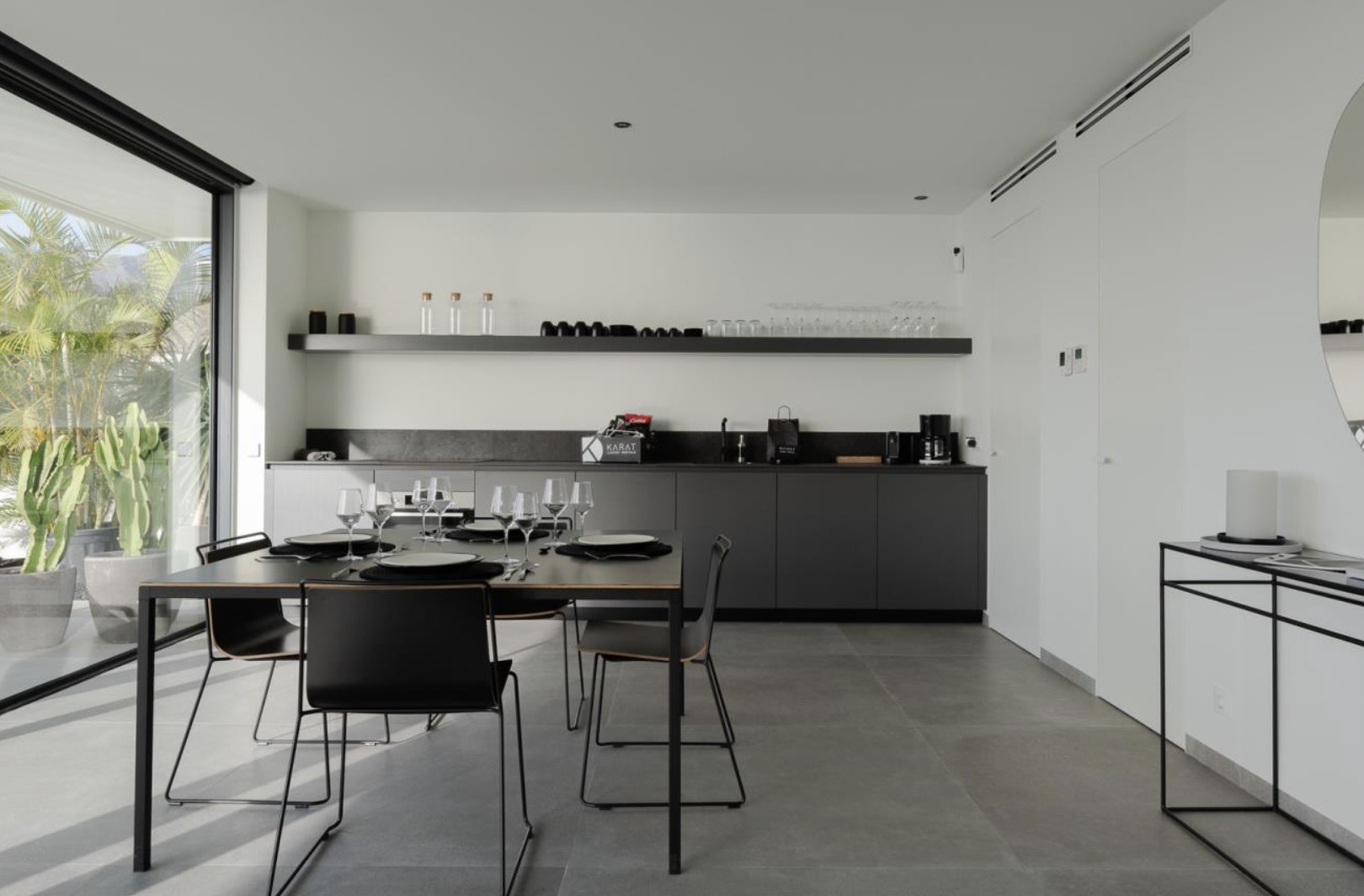 La planta principal es un espacio concebido para disfrutar sin prisas. El salón-comedor, amplio y luminoso, se abre a un horizonte bañado por el sol, con ventanales que enmarcan las vistas sobre el Atlántico. La cocina, de diseño minimalista y altas prestaciones, invita tanto a la creación gastronómica como al disfrute compartido. En el exterior, una elegante piscina climatizada rodeada de hamacas y una zona de descanso conforman el corazón social de la villa, acompañada de un aseo de cortesía para mayor funcionalidad.