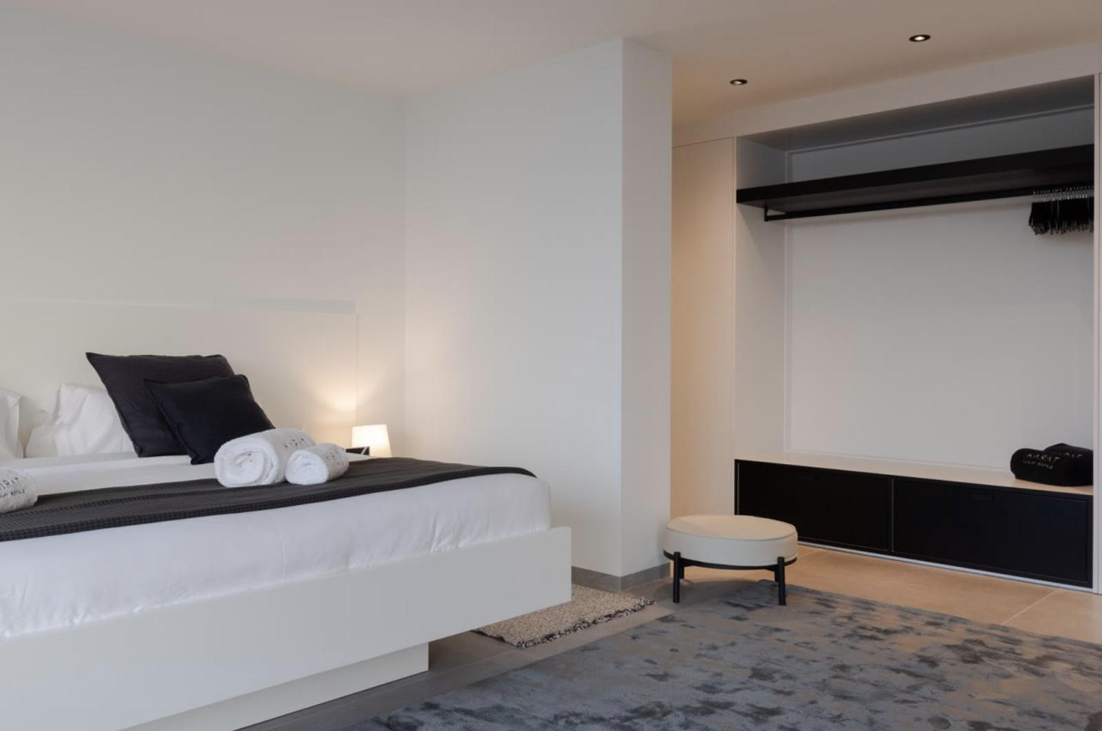 En la planta inferior, tres suites dobles ofrecen un refugio íntimo con acceso directo a una amplia terraza privada, desde la cual se despliega un paisaje marino que envuelve los sentidos. Cada habitación cuenta con baño en suite, cuidada decoración y una atmósfera serena. Esta planta alberga también una zona de lavandería completamente equipada, pensada para brindar comodidad discreta y eficiente.