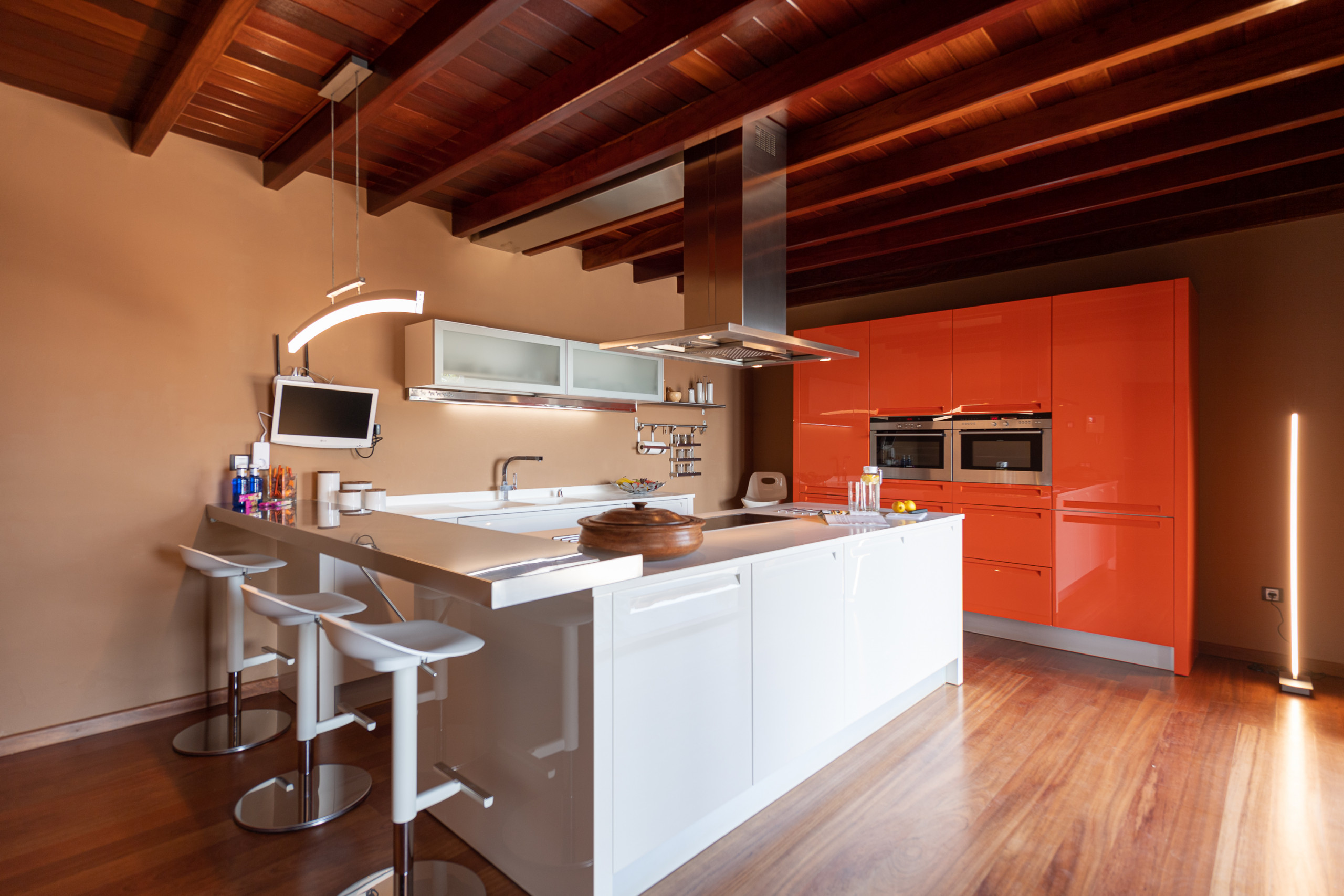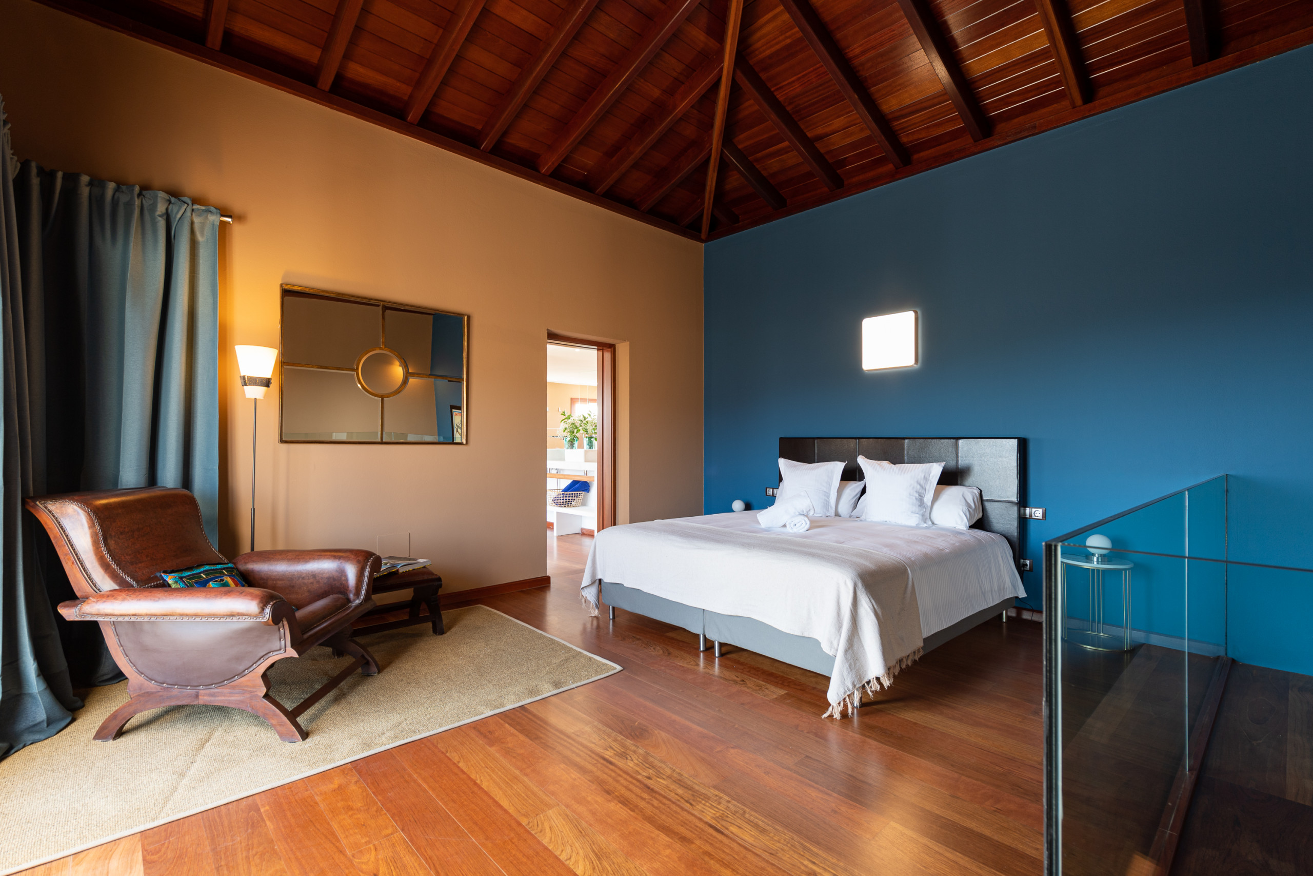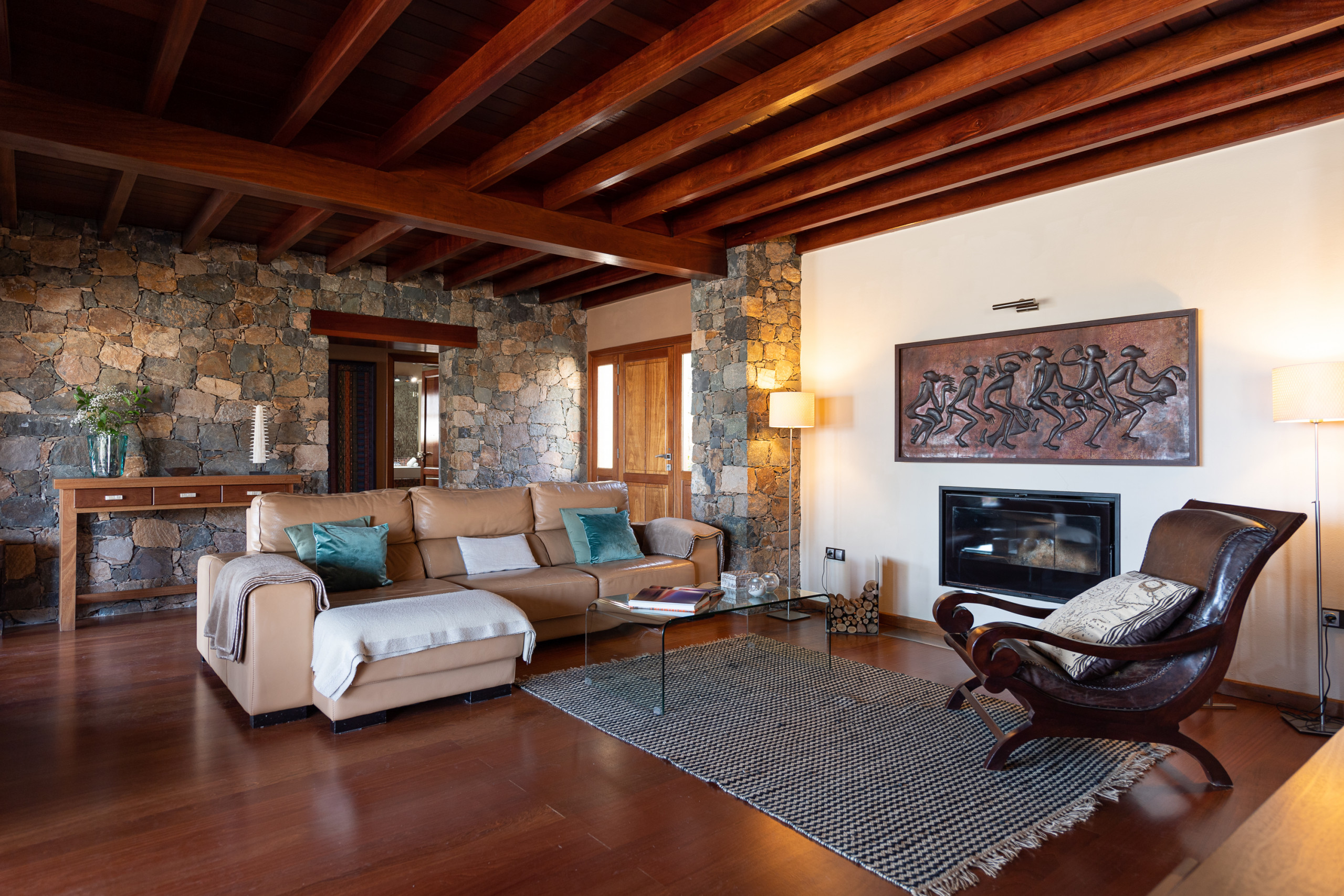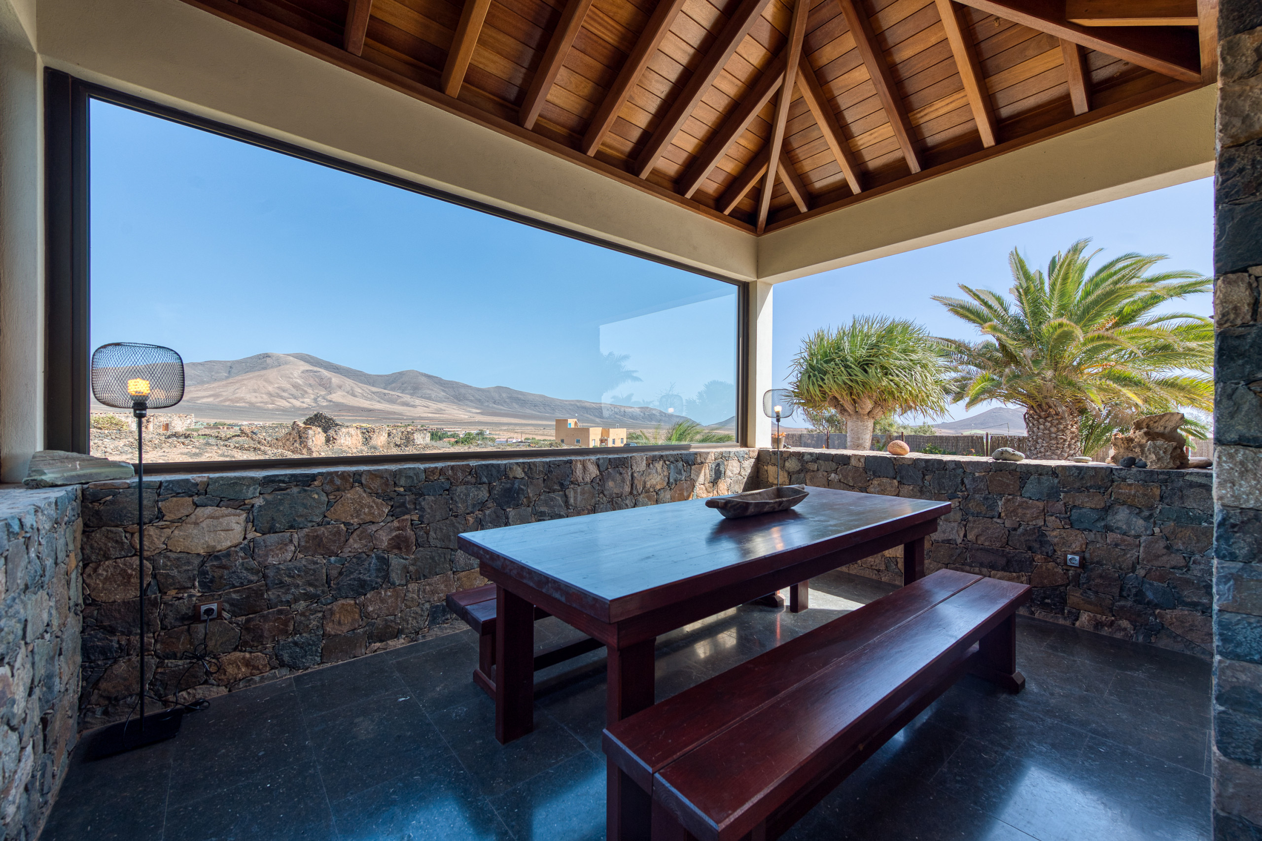 En el interior, cada detalle está pensado para ofrecer una experiencia única: techos y suelos de maderas, muros de piedra volcánica, grandes ventanales y una cálida luz natural que lo envuelve todo. La cocina, moderna y completamente equipada (horno, microondas, lavavajillas, tostadora…), es perfecta para quienes disfrutan cocinando y compartiendo.
