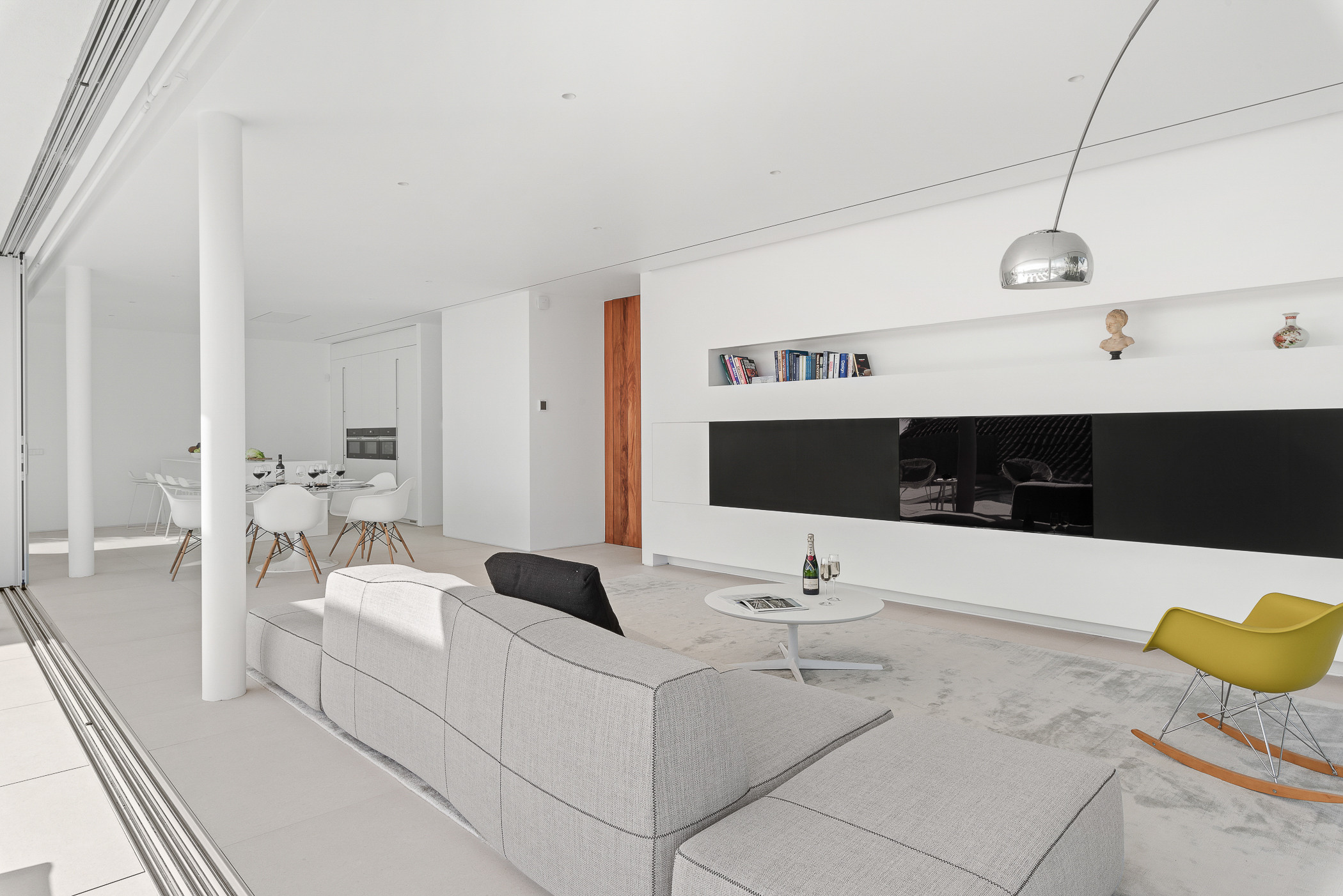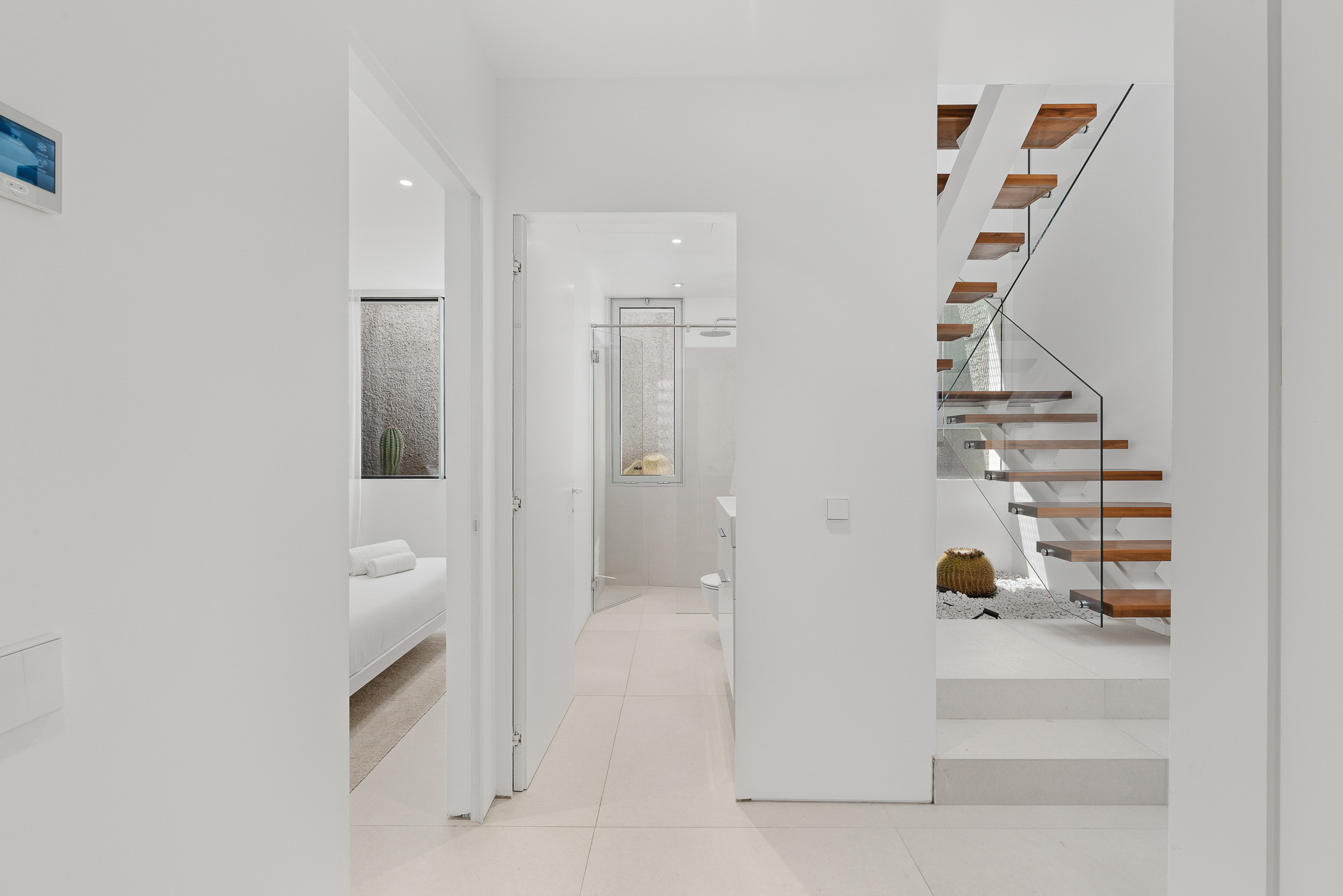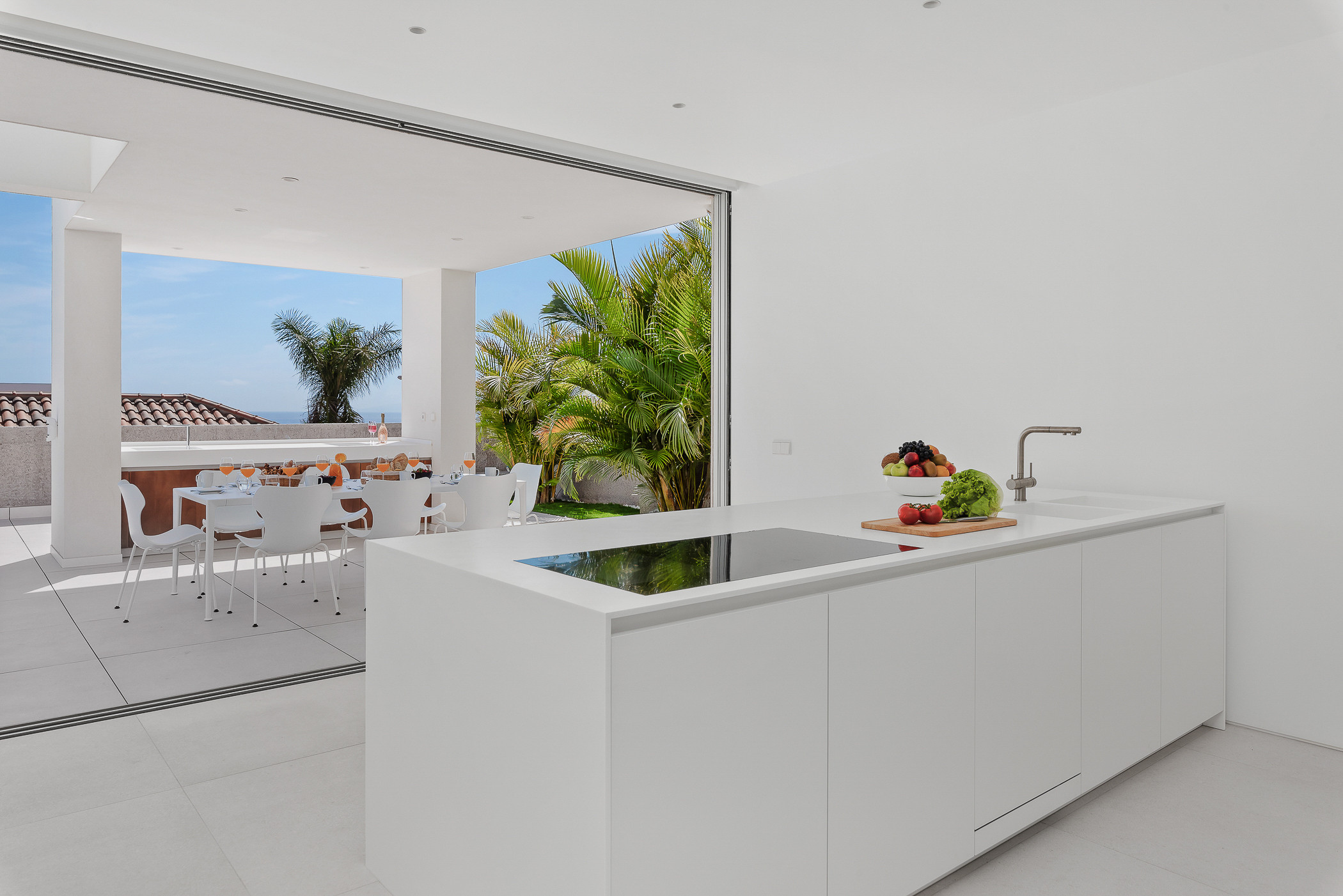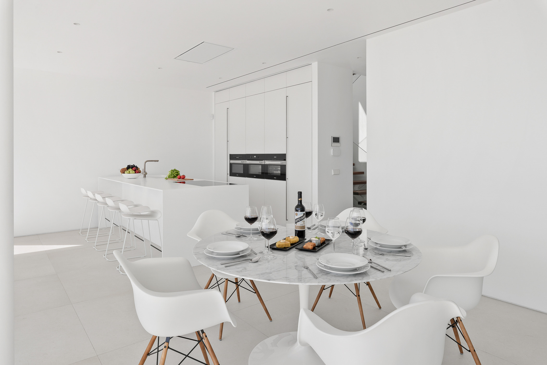 Sus cinco dormitorios tipo suite están diseñados con líneas puras, materiales nobles y ventanales que permiten que el paisaje forme parte de cada estancia. El salón principal se abre hacia una terraza de ensueño, mientras que la cocina, completamente equipada, invita a disfrutar desde desayunos relajados hasta veladas gourmet.