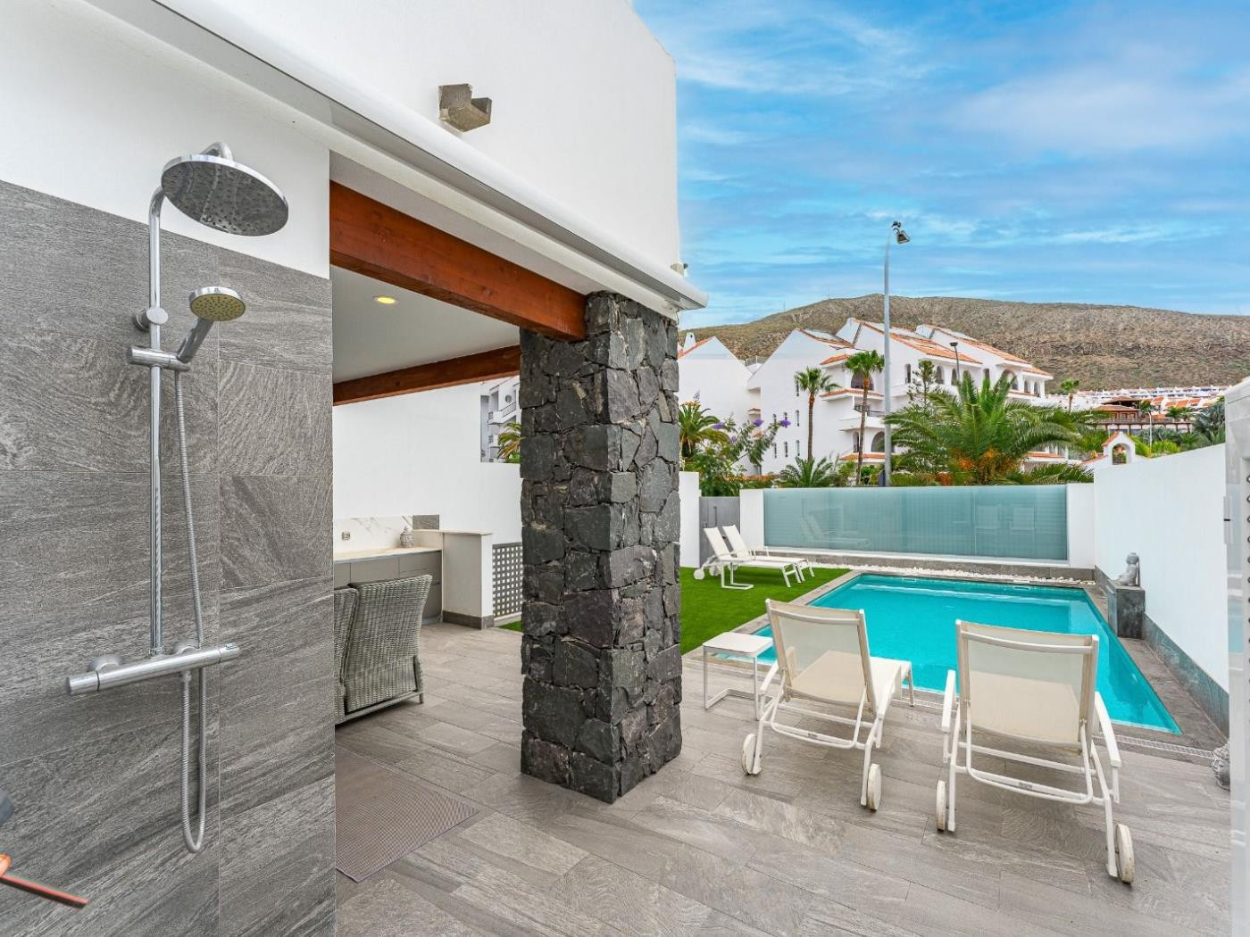 El exterior es, sin duda, uno de los grandes protagonistas. Una piscina climatizada con cascada se convierte en el centro del relax, rodeada de tumbonas, zona chill-out y un espacio con barbacoa para disfrutar de largas veladas al aire libre.